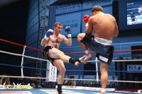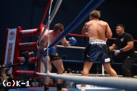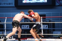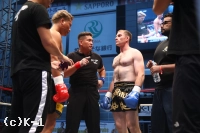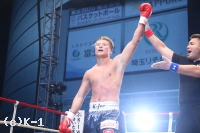 1R、ブライアンは前蹴り、右ストレートを飛ばしながら前に出てくる。これに下がるK-Jeeだが、右ストレート・左フックから右ローに繋いで前に出ていく。基本に忠実な攻めパターンを見せるブライアンは、左ミドル、左右のローをK-Jeeに当てていく。K-Jeeはパンチ中心で、左フックの上下打ちから右ストレートを効かせてブライアンを後退させる。そしてコーナー際で右ストレートを打ち込み、スタンディングダウンを奪う。ここからラッシュに入ったK-Jeeは跳びヒザ、右ストレートと打ち込み、スタンディングダウンで2度目のダウンを追加してKO勝利。準決勝進出を決めた。