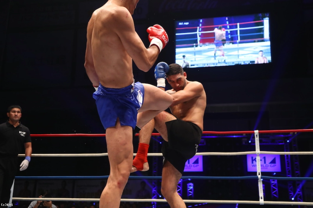 1R、バクーリはジャブ、左インロー、前蹴りと軽めに放ち、そこから右ストレートを顔・ボディに打ち分ける。圧力をかけていくバクーリだが、懐の深いカリミアンは後ろにのけ反り、パンチを届かせない。バクーリはボディ打ちを増やしていく。