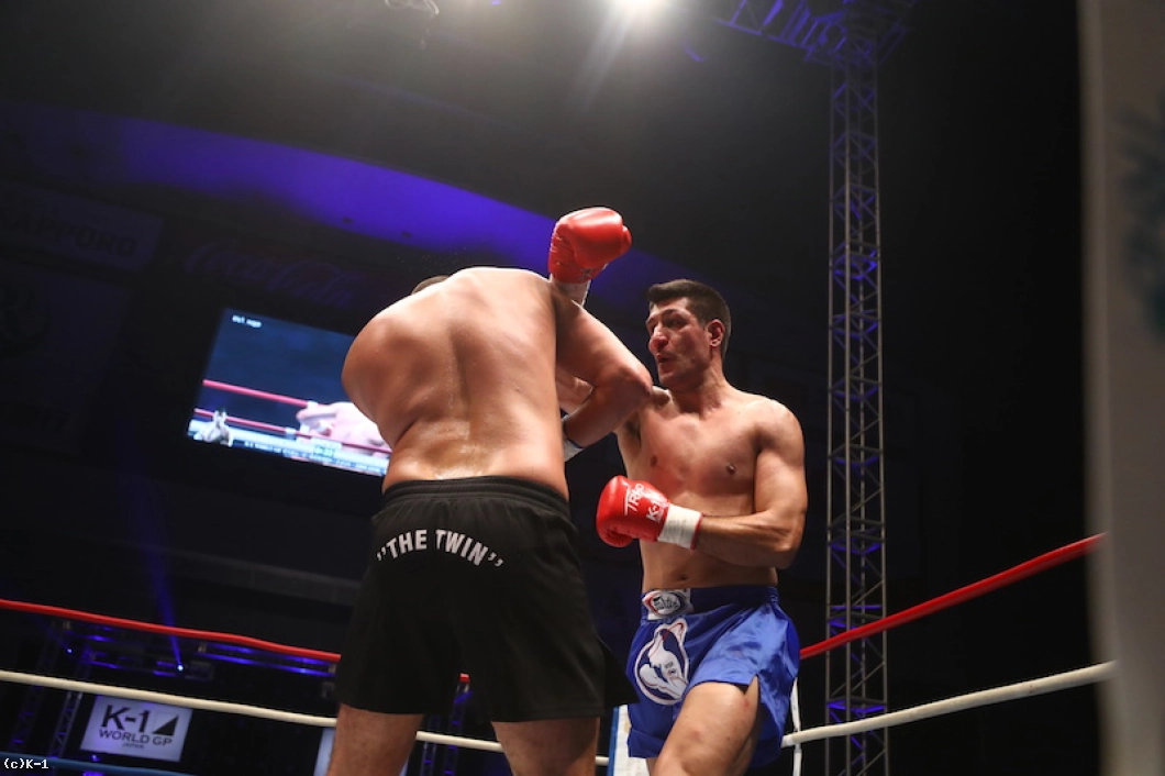 2R、カリミアンは前に出てボディから顔へとフックを放ち、バクーリはプッシングでカリミアンを下がらせる。バクーリの圧力に下がらせられるカリミアンだが、巨体をクルリと回転させ、バックブローでバクーリをダウンさせる。