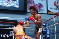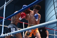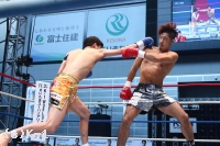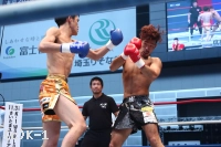 2R、フットワークが軽快な瓦田。東本は左ロー、左ヒザで応戦する。1Rのようにヒザ蹴りとストレートで攻めたい瓦田だが、このラウンドはやや東本に攻め手を阻まれる。瓦田は左回りしてサウスポーである東本の攻撃の威力を下げようとし、東本に右ミドルを蹴る。