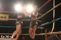 2R、福原は前蹴りで高梨の前進を押さえようとするが、高梨の勢いと圧力が強く後退を余儀なくされる。高梨は右のパンチをストレート・フック・クロスと軌道を変えて放ち、ボディ打ちも交えて福原を下がらせる。前蹴りやミドルで反撃する福原だが、高梨は見切ってかわす。