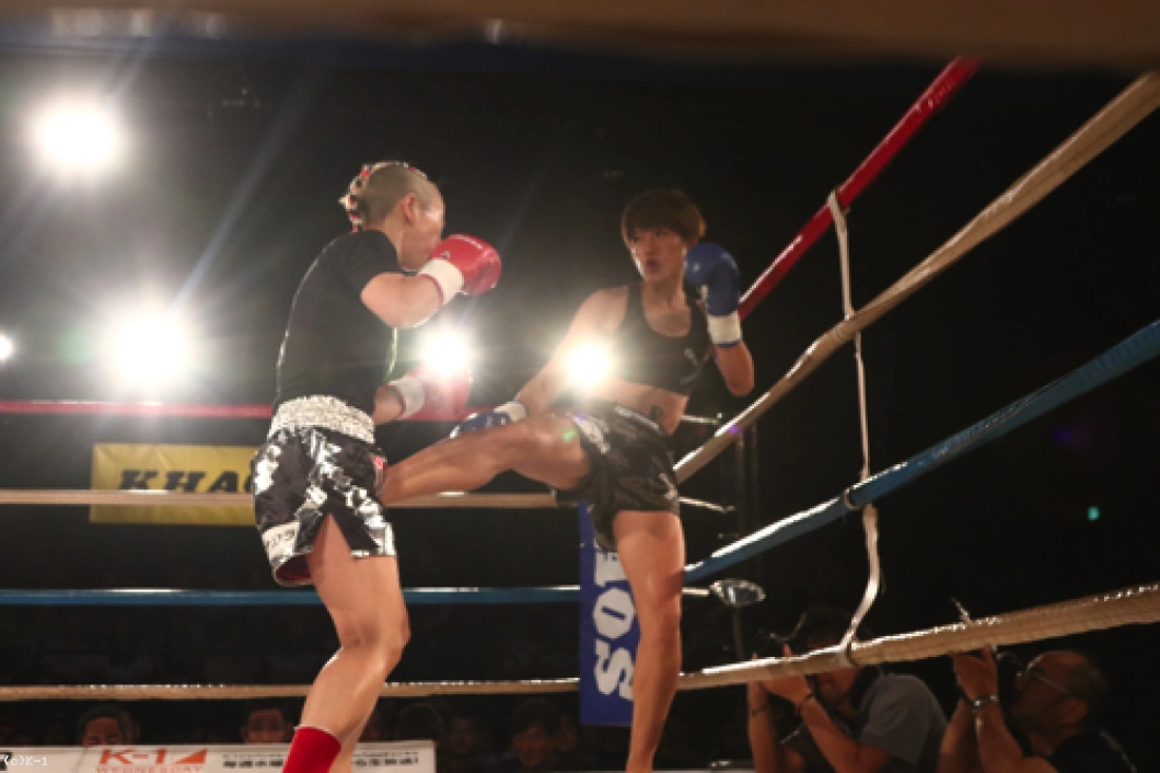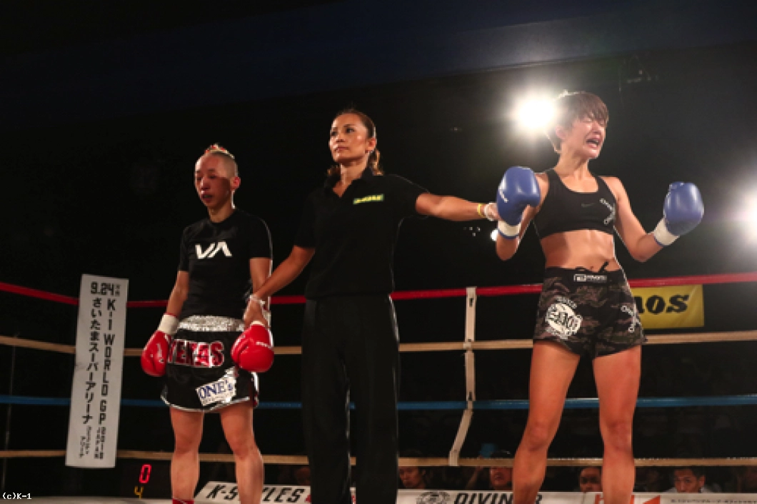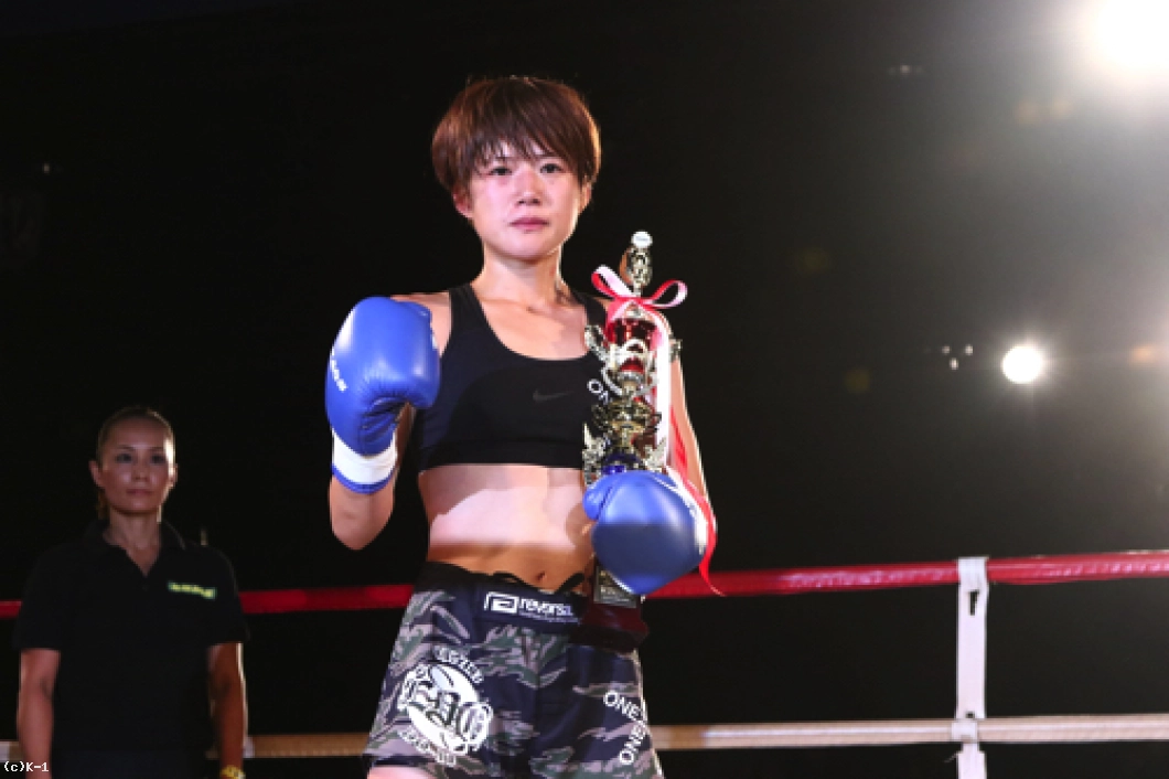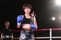 「(試合を終えた感想は?)本当にうれしいの一言です。たくさん人たちが支えてくれて、勝ってみんなに恩返し出来てよかったです。(対戦相手の印象は?)私よりも格上の選手で、不安もあったんですけど、死ぬほど練習したことを思い出して、延長になっても強気で攻めていこうとセコンドと話して最後まで頑張りました。(初めてKHAOSのリングに上がって)今までで一番楽しかったし、そういう舞台に立てて良かったです。(今後の目標は?)今日の勝利はスタートラインに立てた証なので、これからもっともっと頑張っていきます」