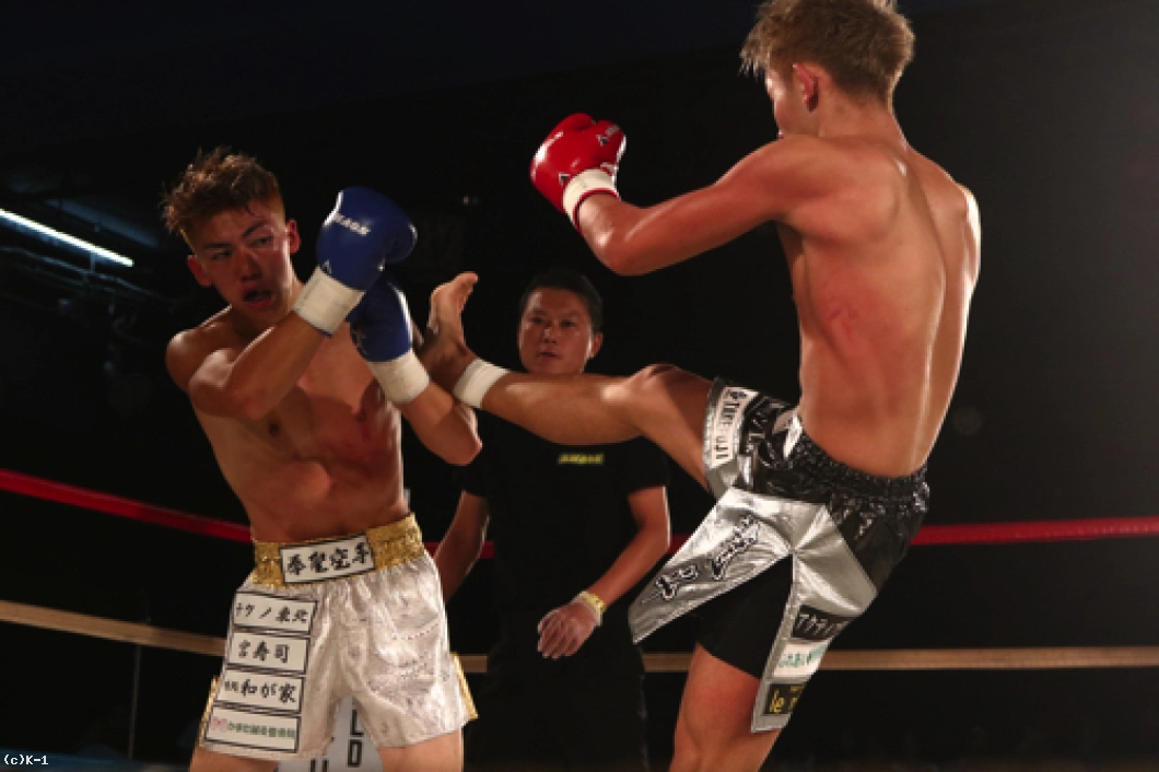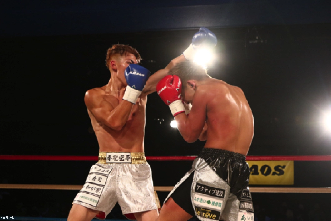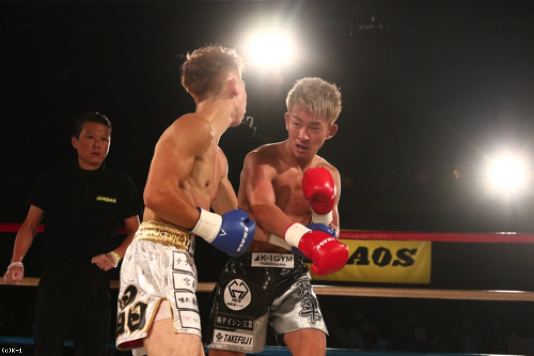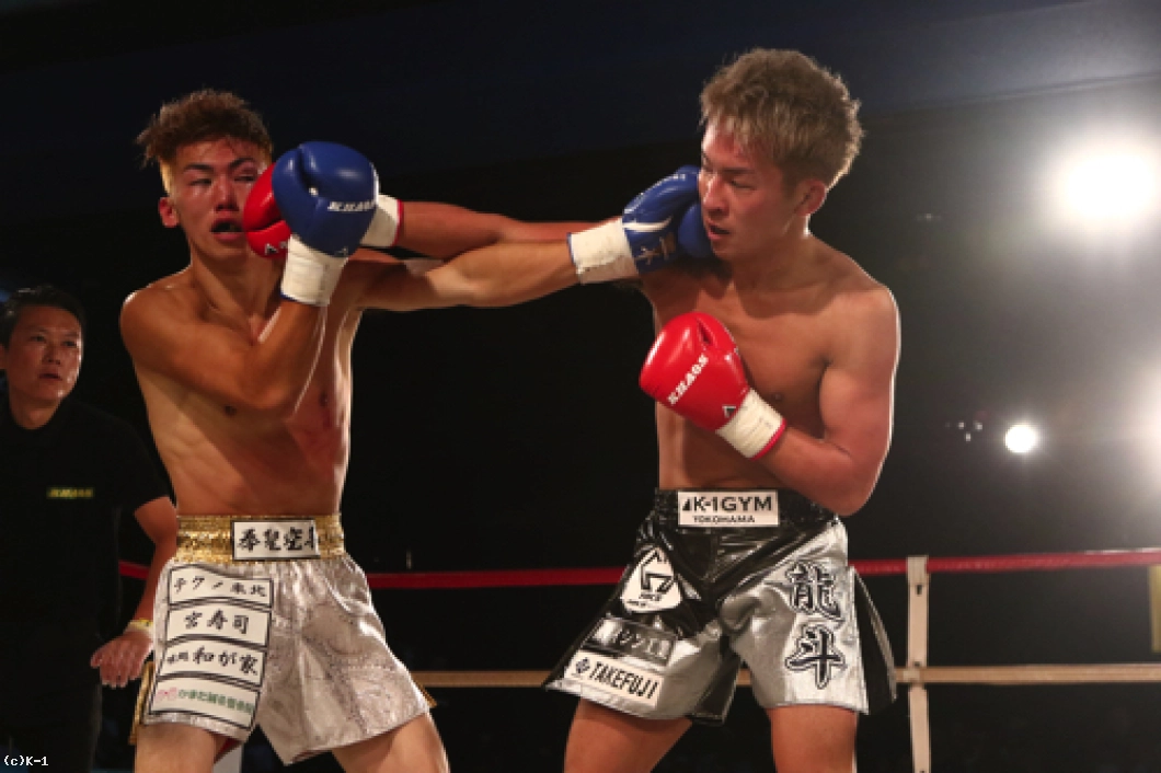 2R、変わらず内田は左右のミドル&ローと蹴り技中心で攻め、そこから踏み込んでのストレートを当てる。龍斗は内田が入ってきたところに右ストレートを狙うが、やや内田の蹴りに出足を止められている印象が残る。終盤、龍斗はヒザ蹴りから前に出て、左ボディ打ちと右ストレートで盛り返す。