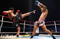 2R、両者前手をポンポンと叩き合い、互いのタイミングと動きを探る。ゲーオは必殺のハイキックを飛ばし、左右田の首筋をとらえるが、左右田は受け流して大きなダメージは受けない。左右ストレートをするどくのばす左右田だが、距離があるためゲーオに頭を振ってかわされる。ストレートはかわされる左右田だが、そこから繋いだボディフック、ヒザ蹴りでゲーオをとらえる。ゲーオは接近戦で小さな動きの足払いを見せ左右田を転倒させる。インターバル時、ゲーオは左足のスネに裂傷がみられる。