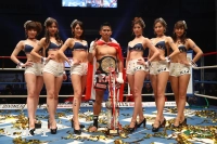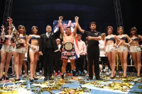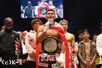 「(試合を終えての感想は?)トーナメントが3回目で、3回も優勝できて、とてもうれしいです。(1回戦、準決勝は?)1試合目は早めのKOで終わって、2試合目は延長戦まで行って、ちょっと疲れました。(相手の印象は?)全員、優勝するための練習をしてきたんだなと思いました。テクニックのある選手が多かったです。(今後の目標は?)いつもと同じで、しっかり練習をして、次の試合に備えて、このベルトをできるだけ長く手元に置いておくことが大事だと思います。