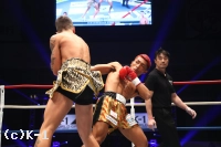 3R、村越は左ミドルから右ロー。前蹴り、飛び込んでのヒザと徐々にリーバスを追い詰めていく。しかしリーバスはジャンピングハイキックで反撃。だが村越はこれを意に介さずプレッシャーを掛けリーバスを下がらせ始める。しかし足を払うなどされ、村越は攻撃を連続で決めることができない。村越は左ヒザを打ち込んでリーバスをコーナーに詰め、ヒザと左右フック、左ストレートと攻めて終了する。判定は29-28、29-28、29-28の3-0でリーバス。王者を破ったリーバスは歓喜の雄たけびを上げた。