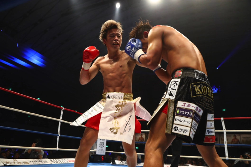 「今日は初大阪大会、満員のご来場本当にありがとうございました。会場の熱が東京とはまた違って大阪のファンのみなさんが好きになりました。皇治選手の声援の方が大きかったですけど、またそれもパワーになったので、ありがとうございました。皇治選手と試合前はいろいろ言い合いましたが、実力あるのは分かっているし、3階級制覇した時のトーナメントと同じ追い込みをして臨んで、戦ってこれだけ粘られたのも初めてだし、皇治選手の強さを感じて、やる前よりリスペクトが上がりました。