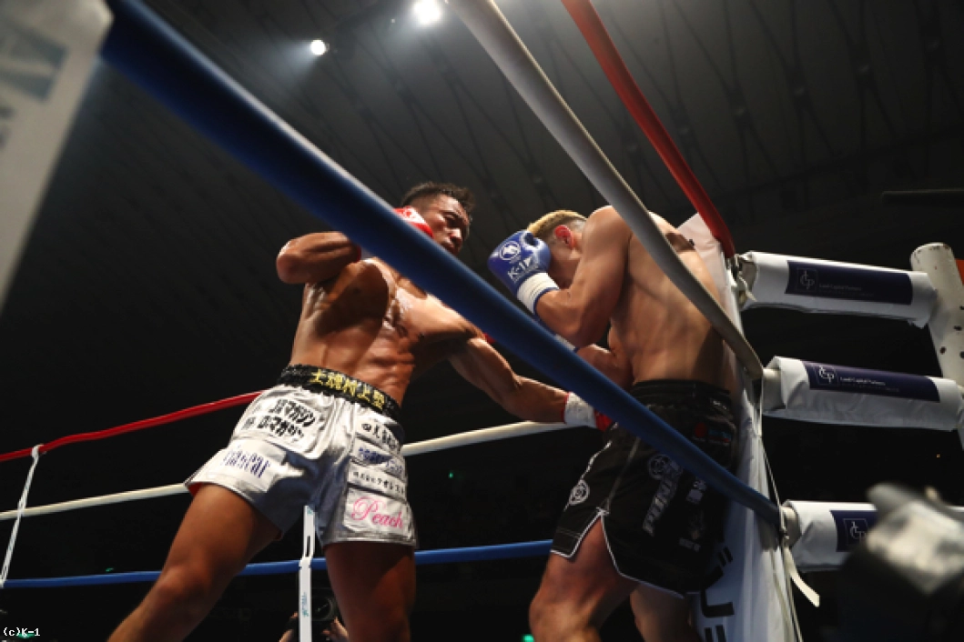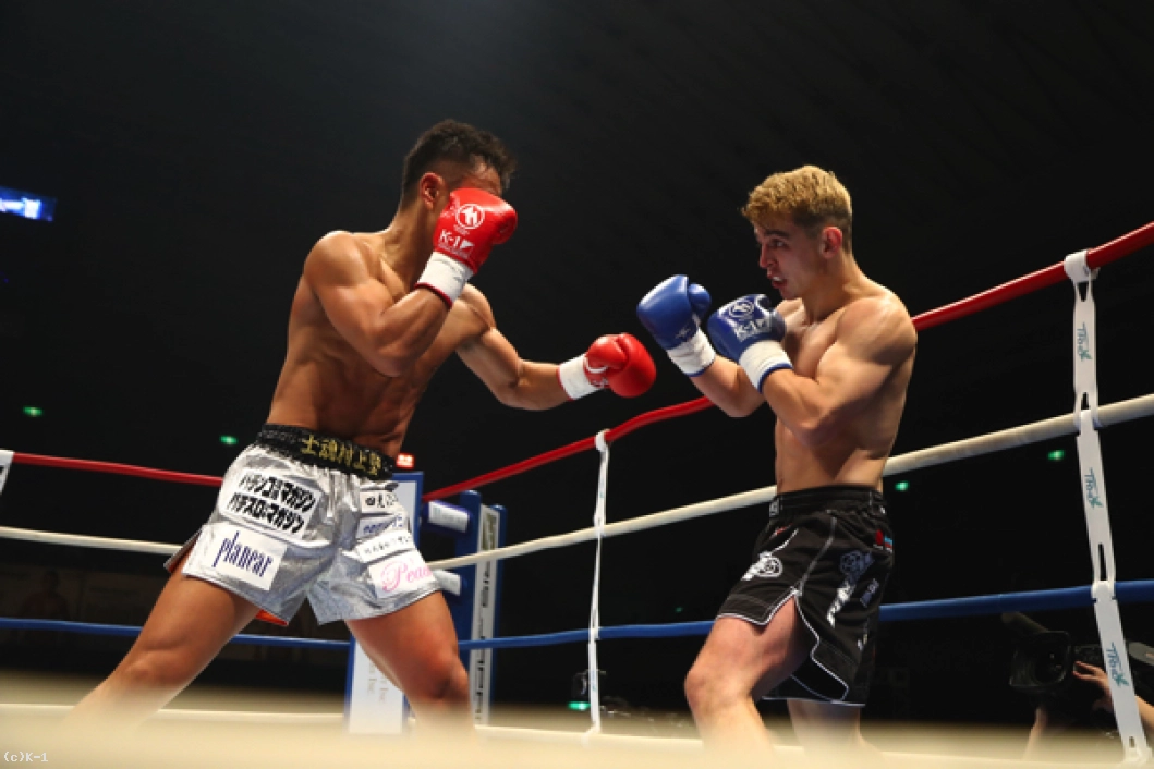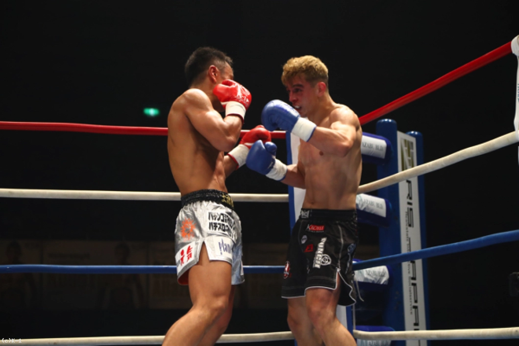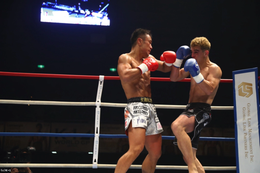2R、恭士郎は圧力をかけ、パンチ・蹴りを被弾しても前に出てボイドを追い詰めていく。跳びヒザを繰り出し起死回生を図るボイドだが、やはり恭士郎は下がらない。そして左ボディをボイドにめり込ませていく。ボイドも反撃に転じ、後ろ回し蹴りを放つが、恭士郎はガードしてブロック。ボイドにロープを背負わせ展開する。