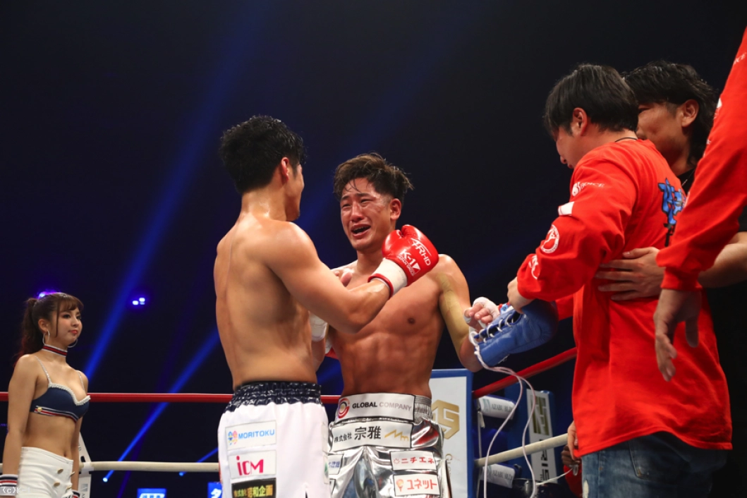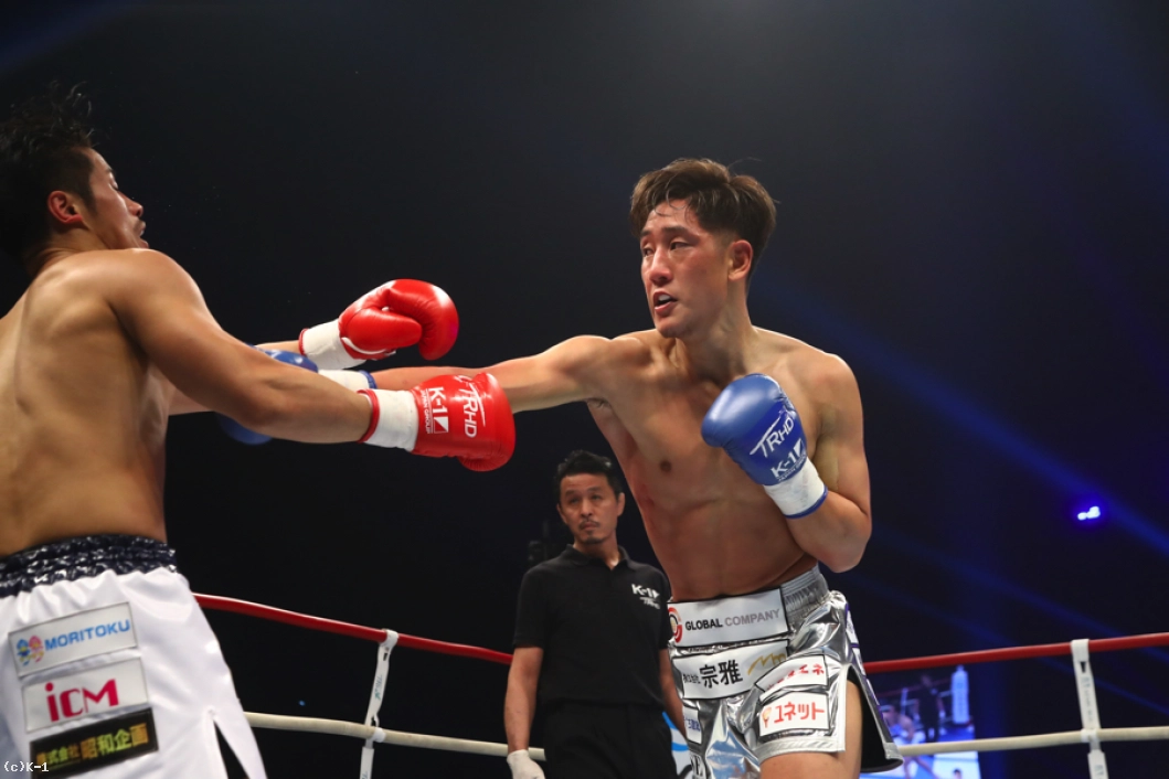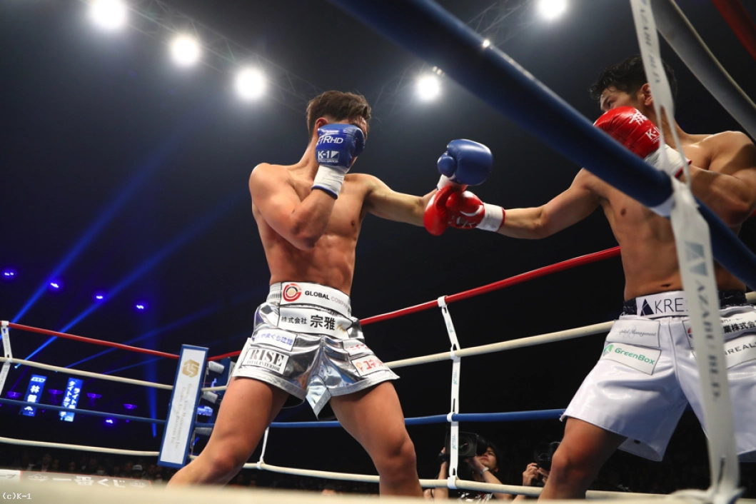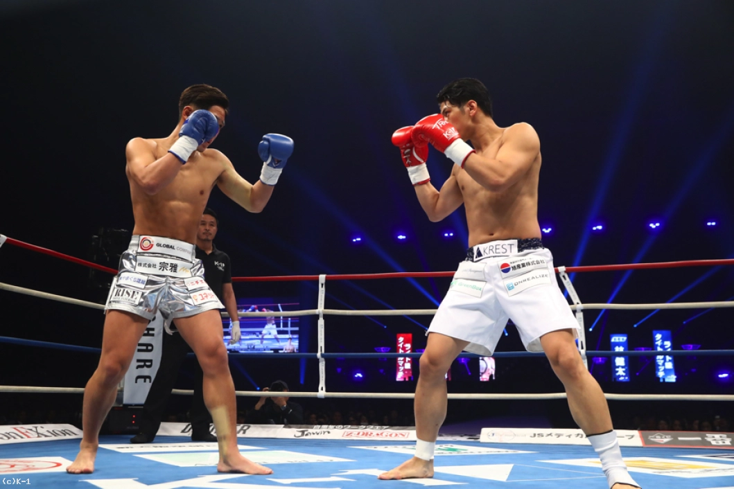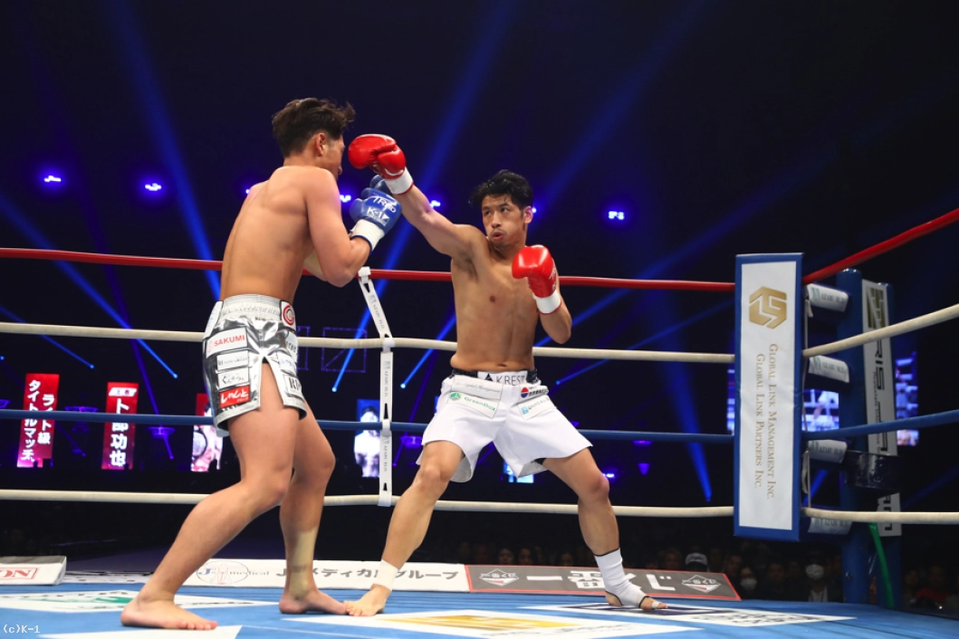 (距離を詰めたのは作戦通り?)自分の持ち味はプレスかけてしんどくさせるというか、距離を潰すということなんで。あれで距離を潰してなかったら、たぶんもっと蹴られてたかなと思います。だから距離を潰して蹴られなくして、ストレートとかのパンチをよけてという練習の成果が出ましたね。(いいパンチももらっていましたが)功也君は蹴りもパンチも最強やと思ってたから、どれかはもらってもしゃあないかなという、肉を切らせて骨を断つみたいな作戦で行きました。