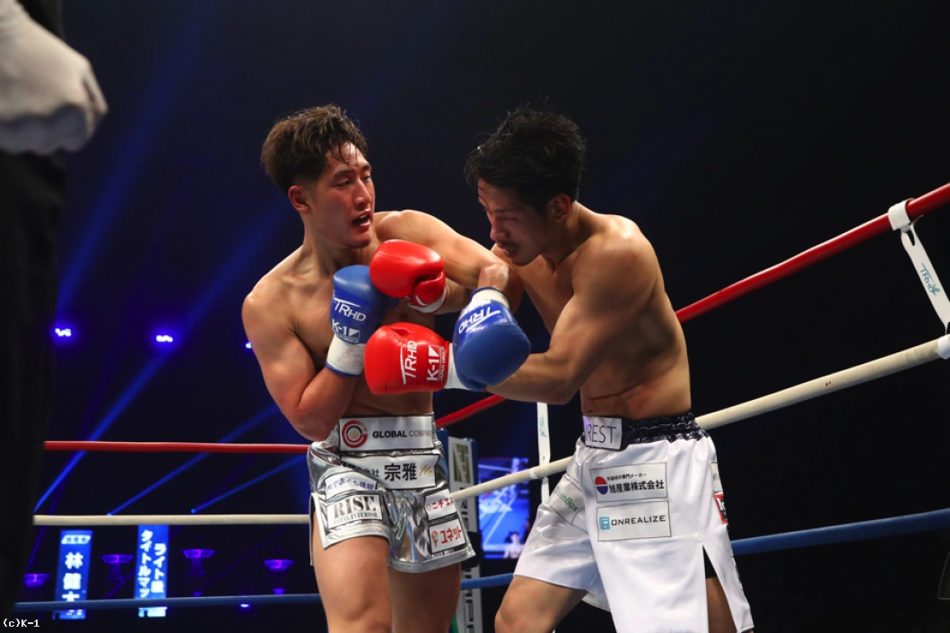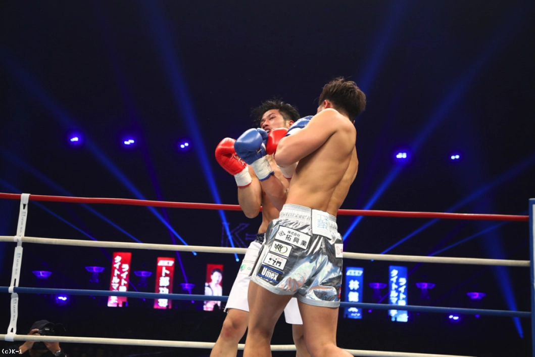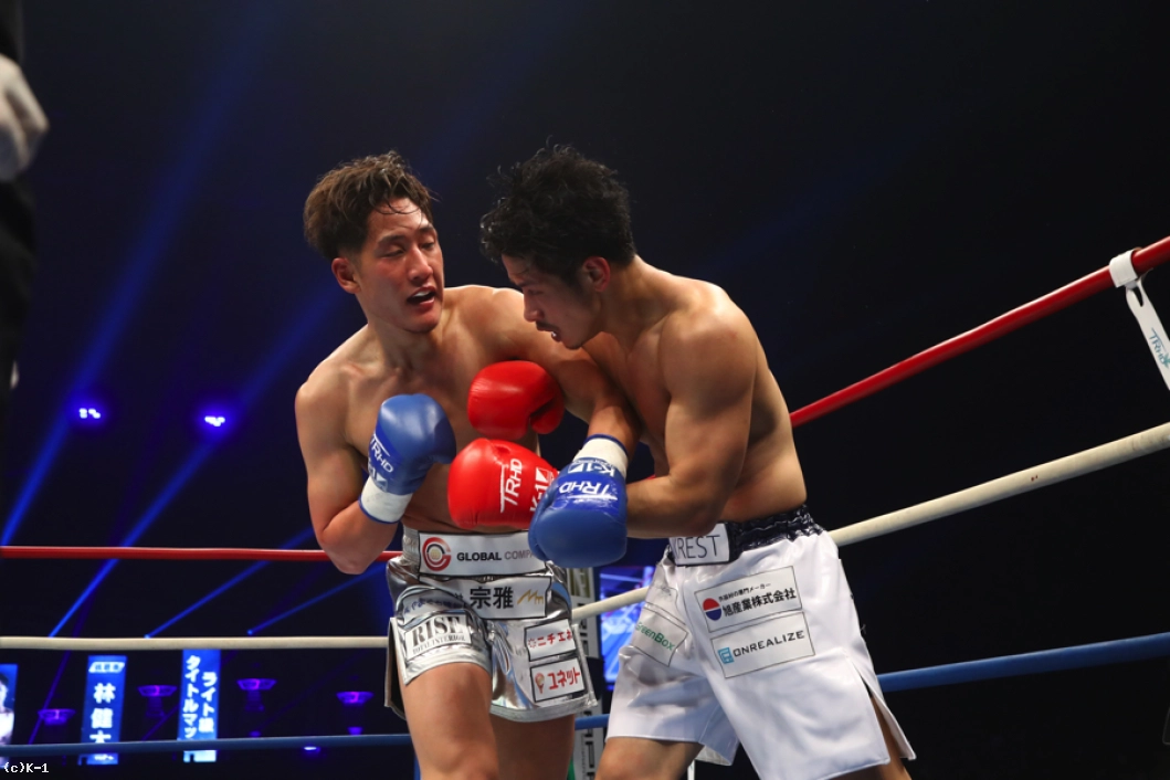 2R、林はボディストレートを打ち込み、功也が跳びヒザ、左ストレートを放っても下がらずに右ストレートを伸ばしてとらえる。功也は跳びヒザ、左ストレートと繰り出し、林を下がらせんとする。左ミドルからストレート、ロングフックと角度を変えた左パンチを振るう功也。だが、林も右ストレートをヒットさせる。ロープ・コーナーを背にする功也はヒザ蹴りで出ようとするが、この時功也の足がローブローになってしまい一時中断。再開すると林はプレッシャーを弱めず、右ストレートと左フックで功也に詰め寄る。功也は右ジャブ・左ストレート、左ミドル。林はこれを被弾するも下がらない。
