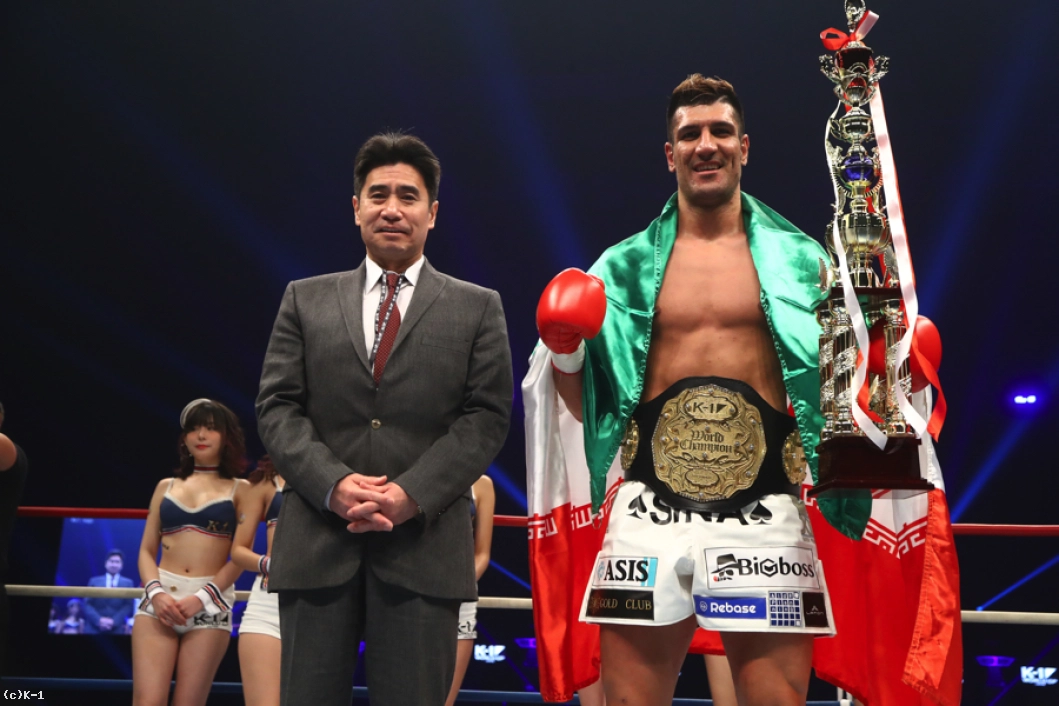 「ミナサン、コンバンハ。ヨロシクオネガイシマス。ファンのみなさん、応援してくださったみなさんに本当に感謝しています。もう一度さいたまに来て戦ってベルトを守れたことを本当に嬉しく思います。スポンサー、会長、マネージャーにも感謝していまう。この勝利をお年玉としてイラン国民に与えたいと思います。日本のファンのみなさん、前回の優勝の後6ヵ月日本に滞在していましたが、みなさんはとても優しくしてくれて嬉しいです。ありがとうございます」