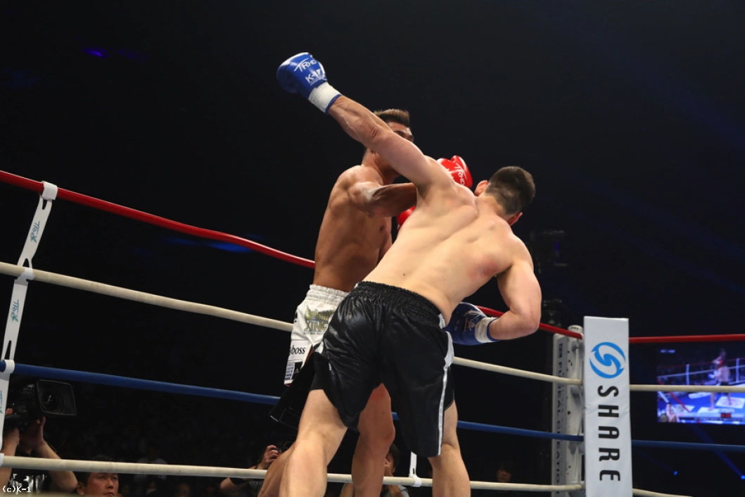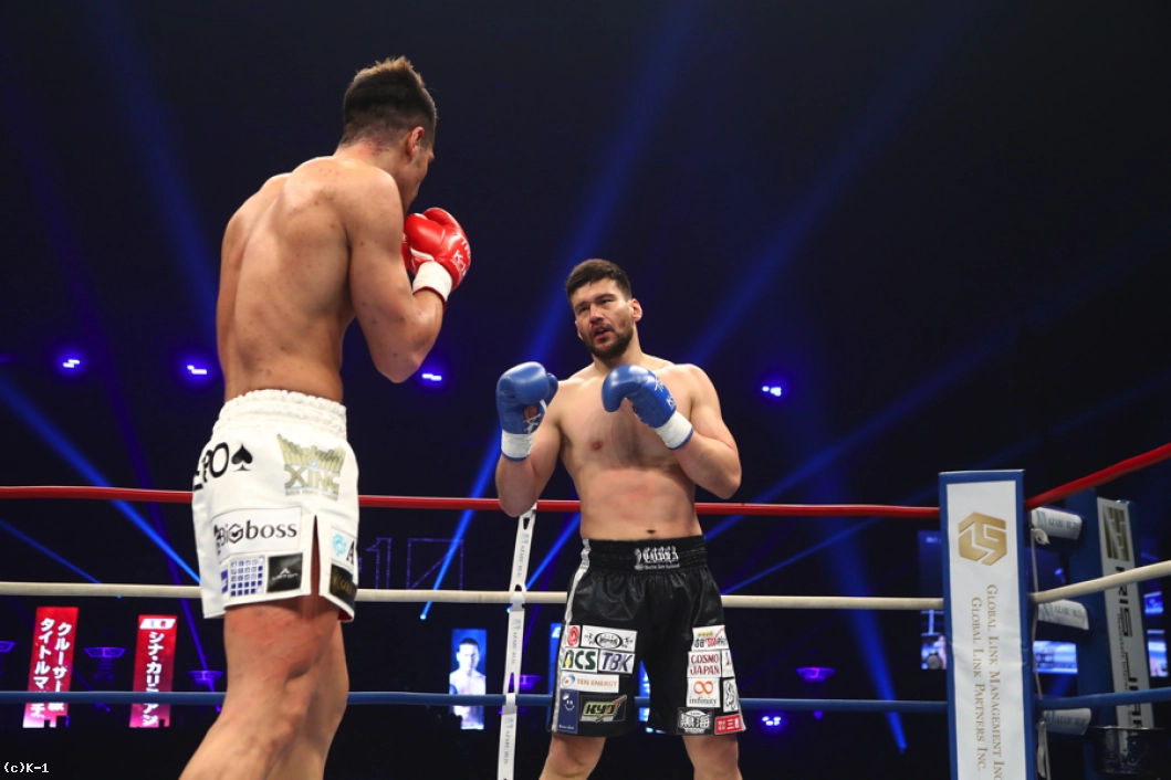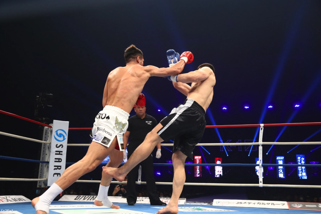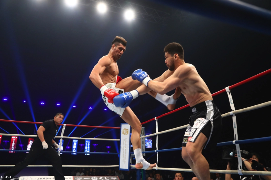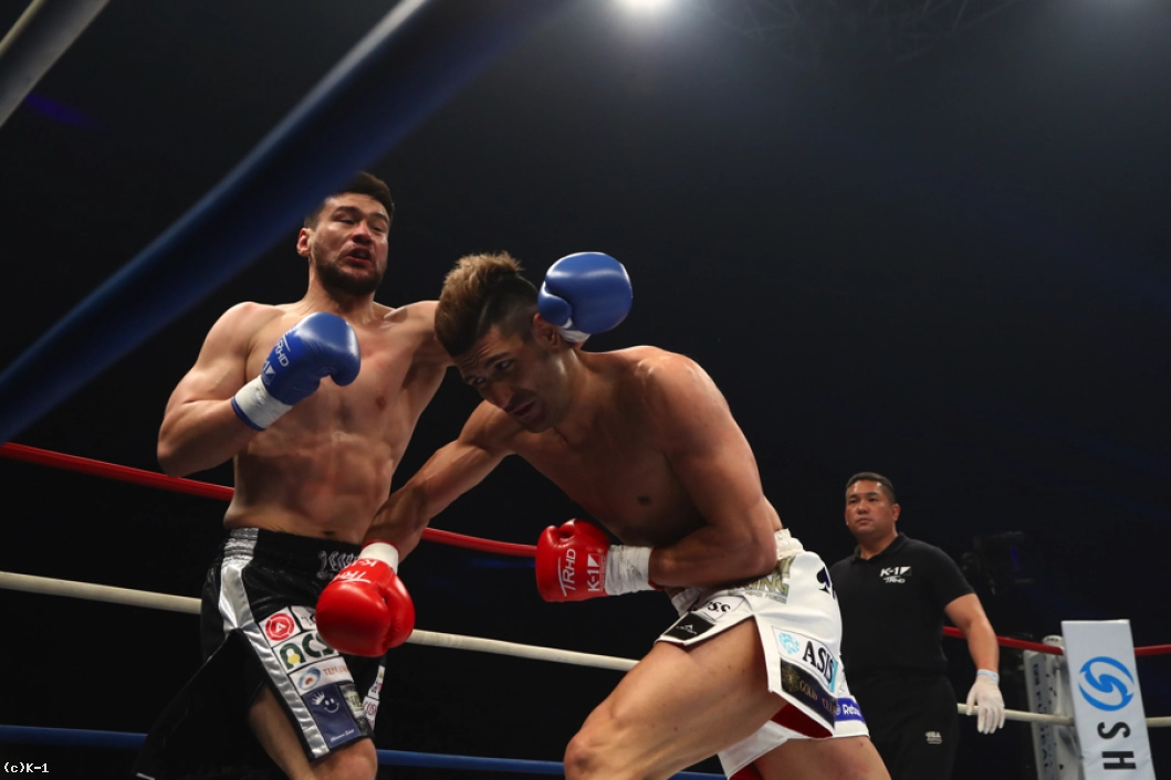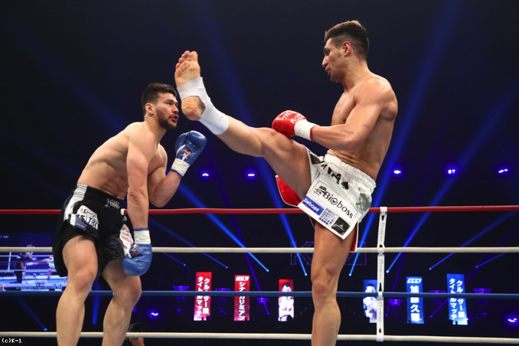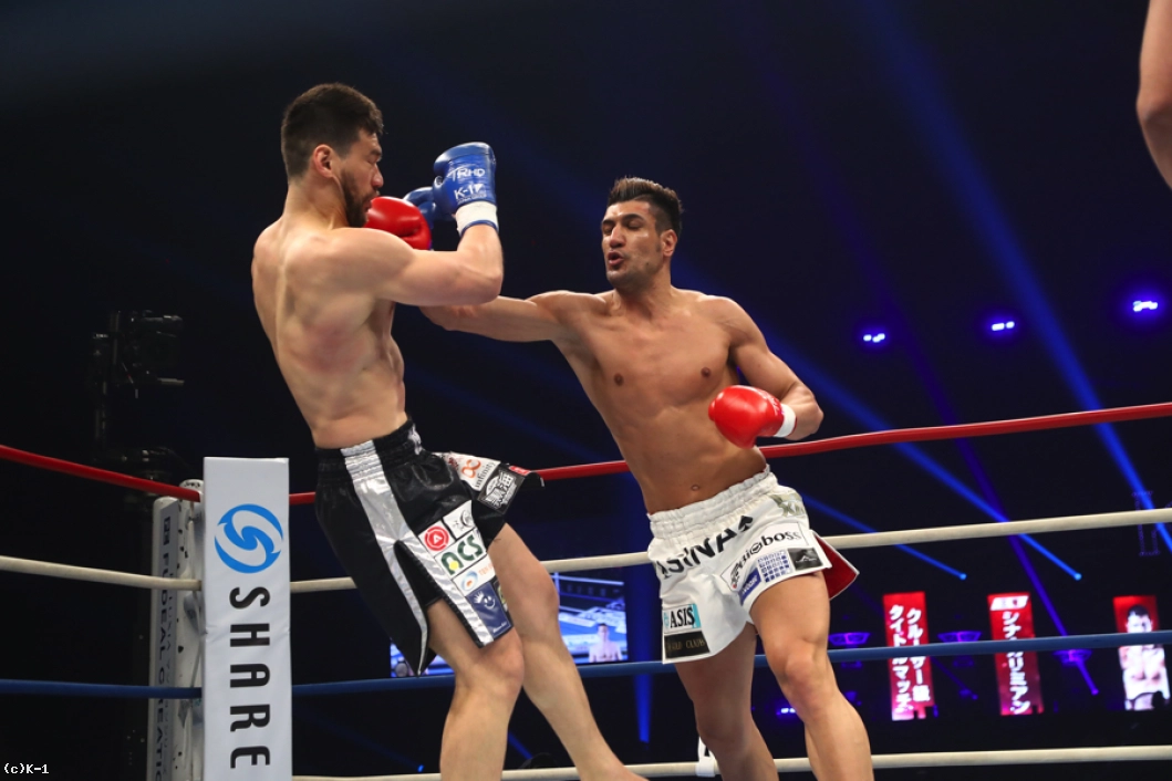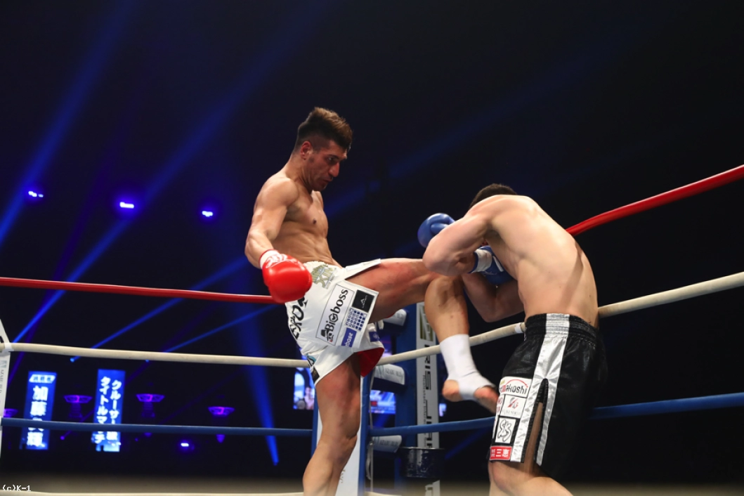 2R、加藤はカリミアンのストレートを頭を振ってかわしながら左ロー。だが、カリミアンもこのローにパンチをカウンターで合わせる。カリミアンが放つボディへの跳びヒザを効かされた加藤だが、逆に左スイングフックを当てる。しかしカリミアンはその後で前蹴りを連打し、追撃させない。さらにストレートの相打ちではリーチでまさり、加藤を下がらせる。