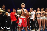 (これからの目標は?)これからは、勝ち続けることはもちろんなんですけど、意味のある試合をしていきたいと思うし、正直立ち技の選手って選手生命が短いし、ピークでやれる期間って限られてると思うし、その中でもどれだけ意味のある試合をして……意味のない試合なんてないんですけど、その中でも特に意味のある試合をして、やり切って、全部勝って、K-1最高を証明するっていうのと、あとは格闘技全体を昔のブームの時以上に知ってもらう。格闘技ほど人にパワーを与えられるスポーツってないと思うので、それを伝えるために僕は試合以外のところも、批判されることも多いんですけど、それをやっていくのが僕の使命だと思うし。それプラス、こうやって試合を勝ち続けていくことが僕のやることかなと思うので、そのために毎日全力でやりたいと思います。