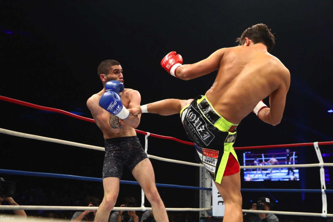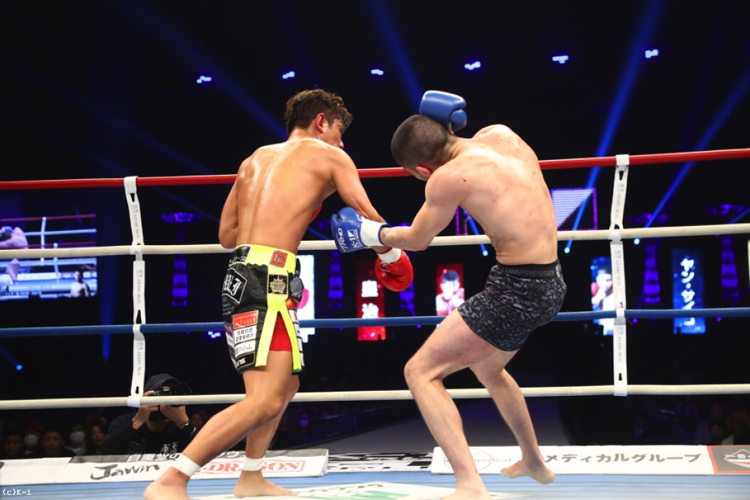 2R、皇治は倒そうとする気持ちが強すぎるか、フックを空振りするとバランスを崩す。サイコのフックに右ハイを合わす皇治だが、これもヒットできず。皇治は依然パンチが大きくなってしまいサイコをとらえられない。だが、左ボディフックは当たる。サイコの動きを見て取った皇治はヒザを突き上げヒットさせる。
