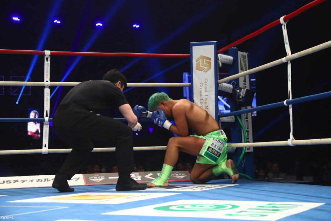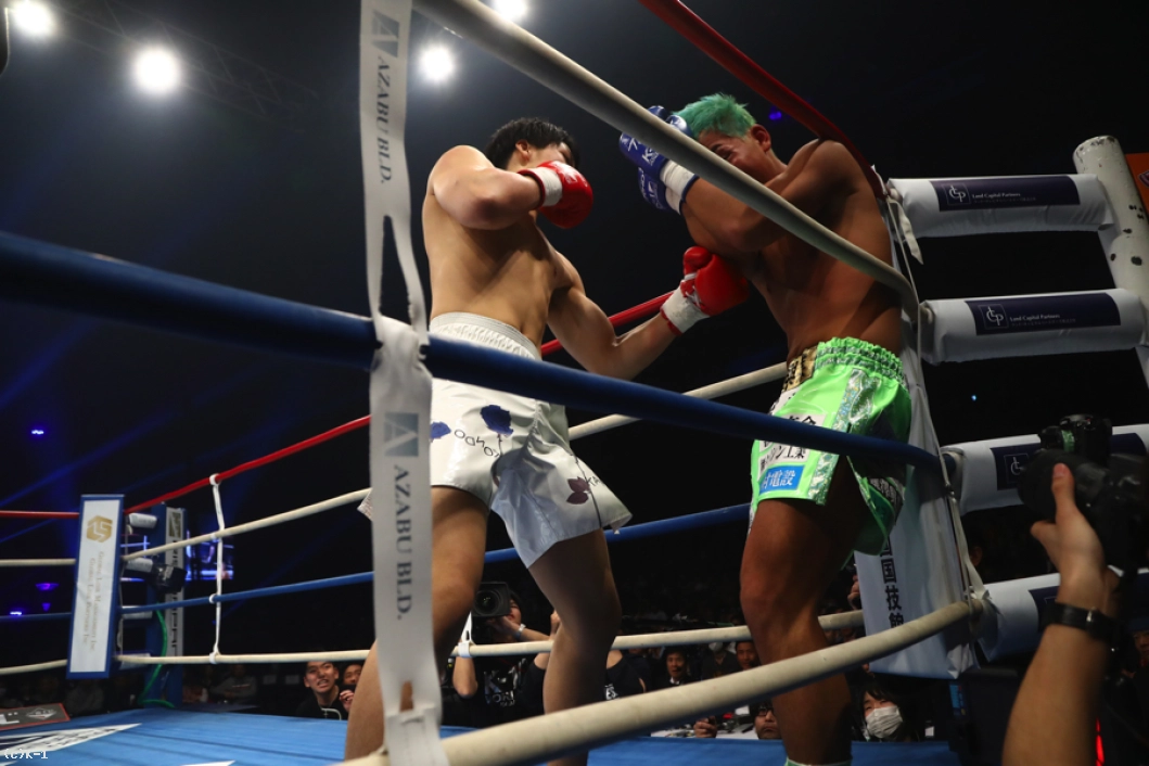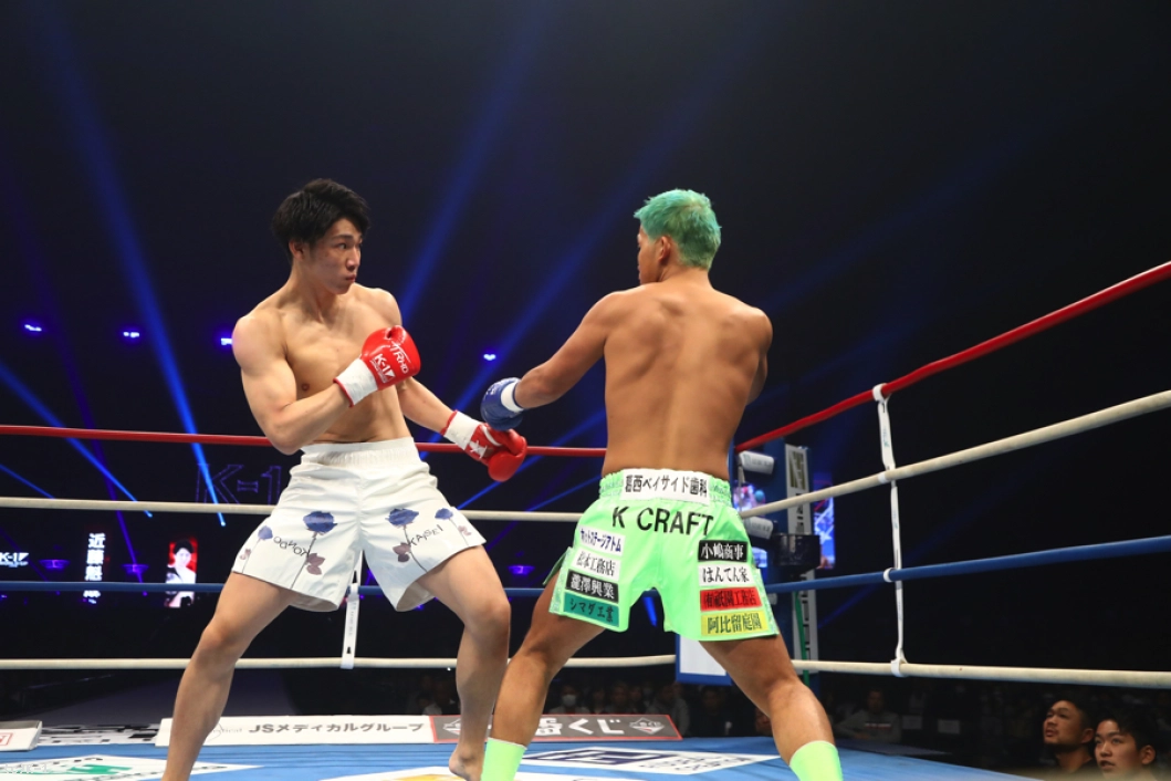 2R、近藤はやはり前に出ていく。プレッシャーをかけてジャブを突き、瑠久をジリジリと下がらせる。瑠久は状況を打開しようと左ボディを放ちにいくが、ここで近藤のカウンターの左がヒット。近藤はフラついた瑠久に跳びヒザで襲い掛かり、右ストレート、ボディを交えたパンチ連打をフォローしダウンを奪う。立ち上がった瑠久はダメージがあったか目を気にしている。近藤は逃さずストレート、左フック、ヒザと猛攻して瑠久を攻め落とし、K-1甲子園での決勝に続き返り討ちにした。