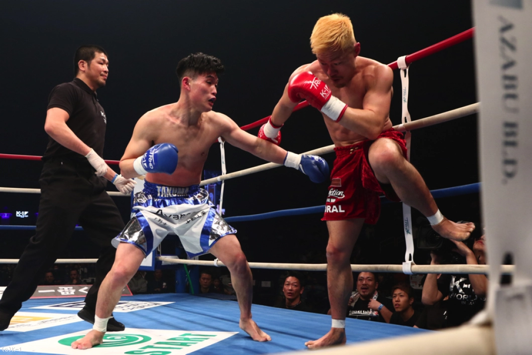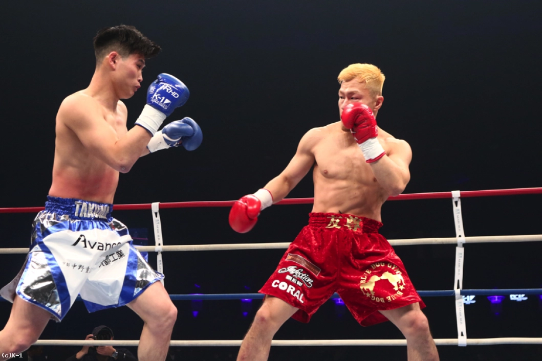 2R、初回に2度のダウンを奪っている友尊だが勝ち気にはやらず、ミドルを当ててそこからのワンツー。しかし川口が左フック・右ストレートととらえて効かせ、流れを引き寄せる。左フックと右ストレートで迫る川口だが、友尊もボディ打ちとフックで応戦。そして川口が突っ込んできたところへ右フックをカウンターで打ち込み、体勢を崩れさせて3度目のダウンを奪う。