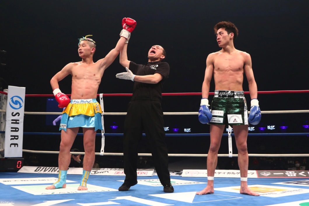 3R、このラウンドもバックブローの森坂に黒田も後ろ回し蹴りでやり返す。回転技のトリッキーな攻撃を続ける森坂に、黒田はガードを上げパンチを弾きながらローキック。森坂もしかし黒田の攻撃が見えてきたか左ボディフックは腕でブロックする。森坂は左ミドルを多用。黒田もボディへのヒザ、左ボディフックと放つが、森坂をとらえられない。判定は29−28、29−28、30−28の3−0で森坂。2Rに奪ったダウンで勝利を掴んだ。