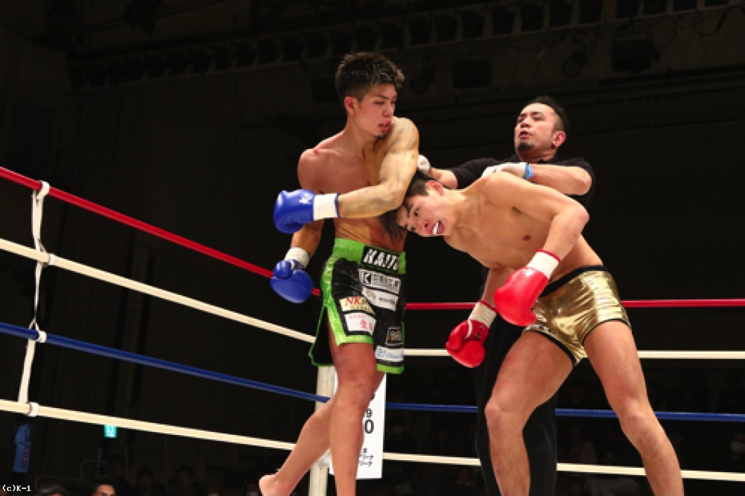 2R、攻めて出んとする海斗だが、加藤は右インロー、左ローと前進を止める。だが海斗も右ジャブ・左ミドルで加藤を攻め込ませない。加藤は右インロー、左ローと放って入れる。ダウンの挽回に向かいたい海斗だが、加藤が小刻みに放つ右インローに阻まれる。