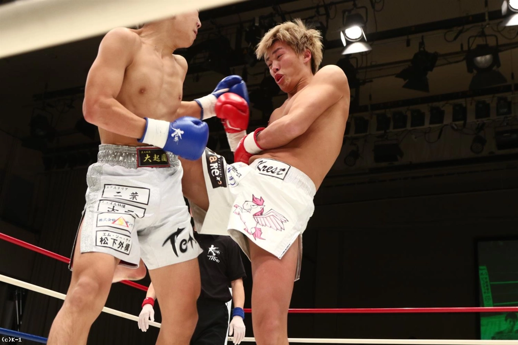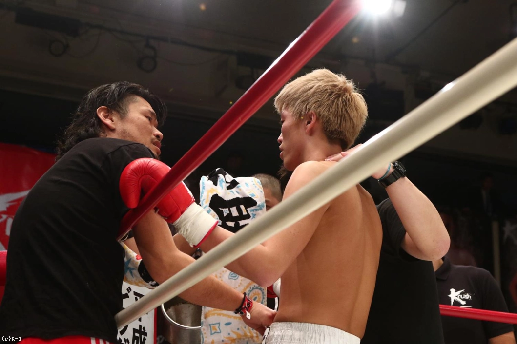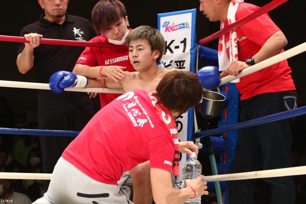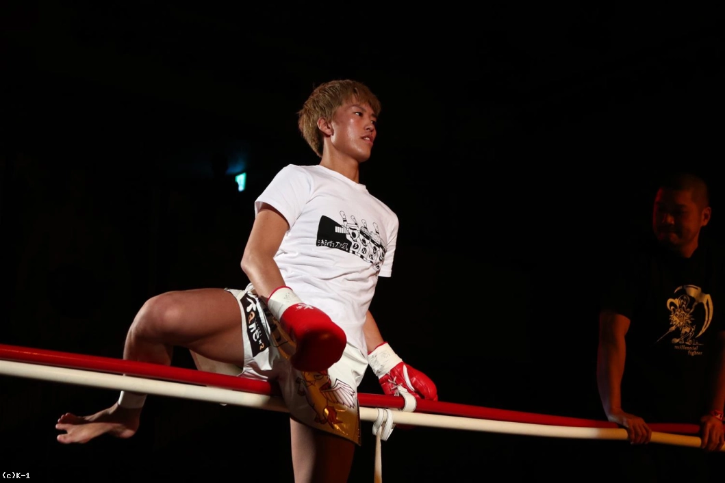 「(試合を振り返って?)佐野選手を初めて観たときのことが重なって、メチャ大きく感じました。それでも自分がやってきたことが間違ってなかったと思います。(対戦相手の印象は?)思ったよりローとか蹴り技が強かったです。その対策はしてたんですけど、けっこう封じ込められて。それでも勝ててよかったと思います。(今後の目標は?)ちょっとでも有名になって、自分の地元の枚方を盛り上げていければなと思います。押忍」