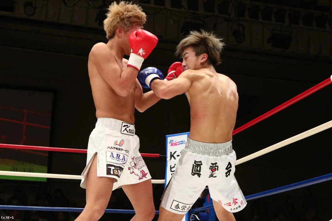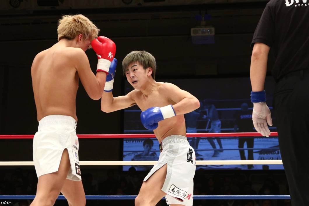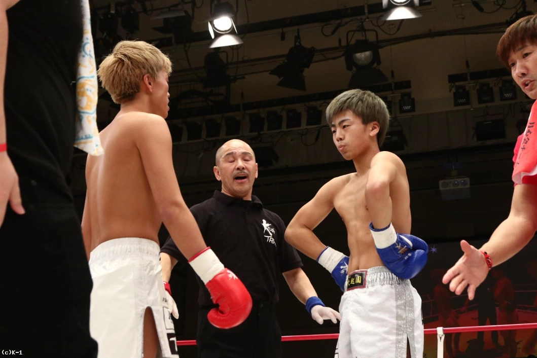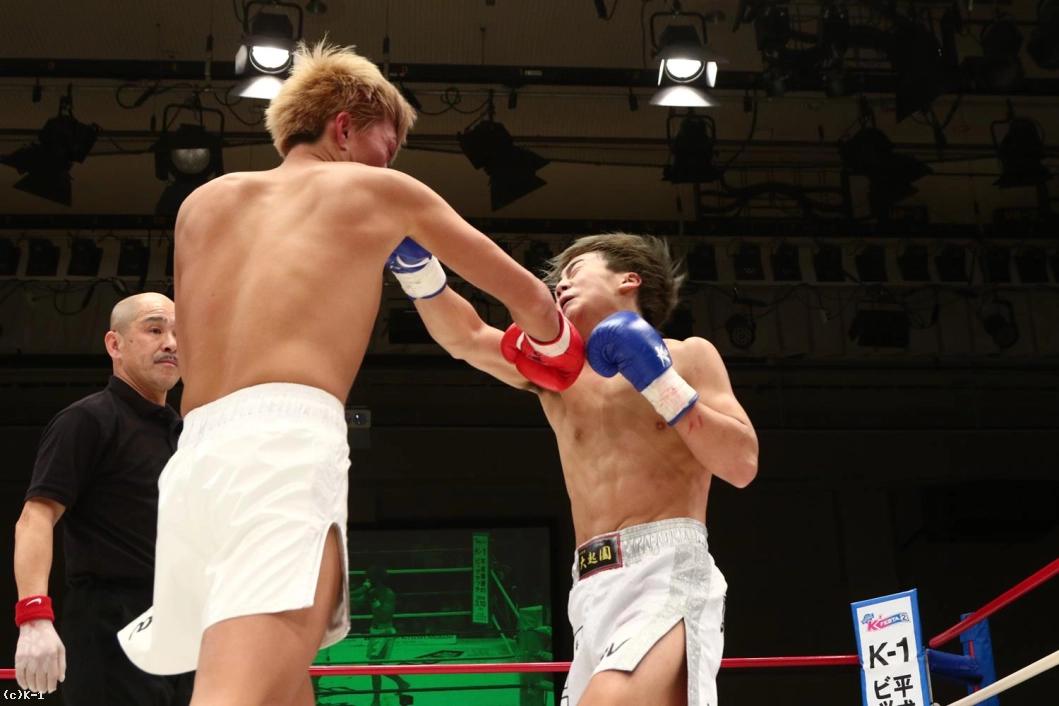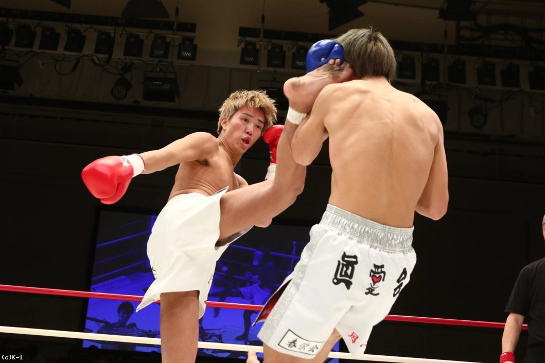 「(試合を振り返って?)佐野選手を初めて観たときのことが重なって、メチャ大きく感じました。それでも自分がやってきたことが間違ってなかったと思います。(対戦相手の印象は?)思ったよりローとか蹴り技が強かったです。その対策はしてたんですけど、けっこう封じ込められて。それでも勝ててよかったと思います。(今後の目標は?)ちょっとでも有名になって、自分の地元の枚方を盛り上げていければなと思います。押忍」