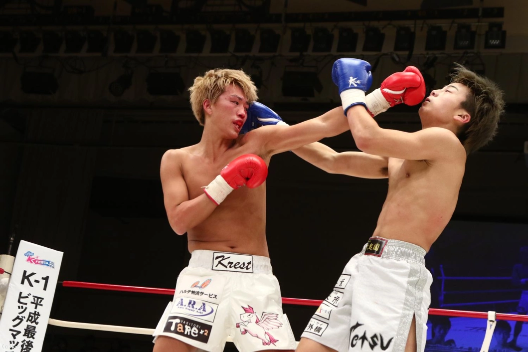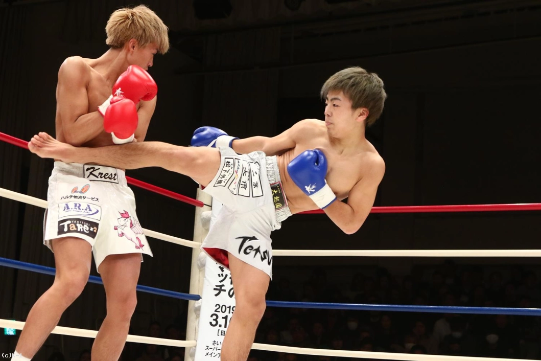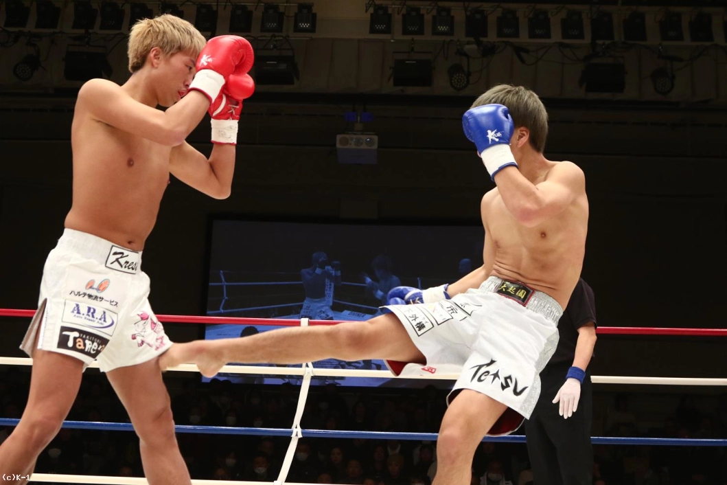 2R、TETSUは跳ねるように飛び込みながらのストレート、ミドル・ローと先手で攻める。だが、佐野はこれに下がらず押し返すが、ここでTETSUのヒザ蹴りが佐野の下腹部に当たり、佐野にインターバルが与えられた後で再開となる。佐野は戦法を変えずベタ足でグイグイ前進する。接近戦でボディフックを打ち込む佐野に、TETSUは離れ際の左フック、跳び込みながらのストレートと放って当てる。