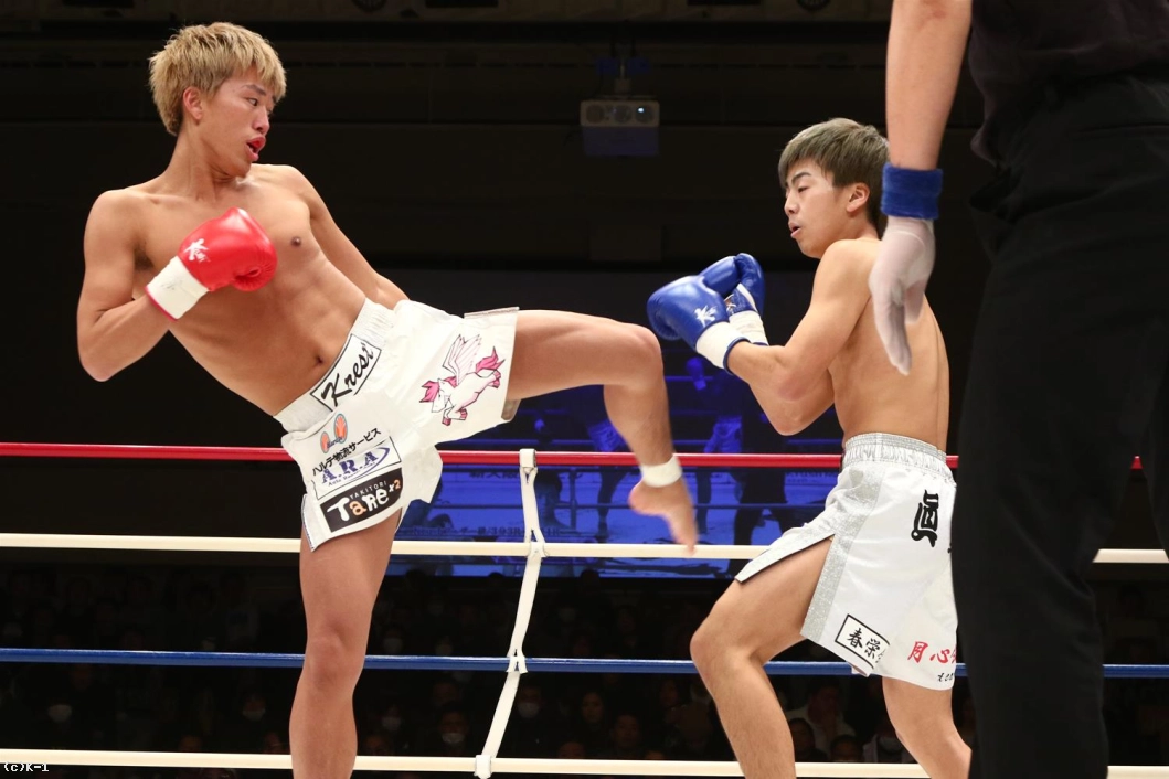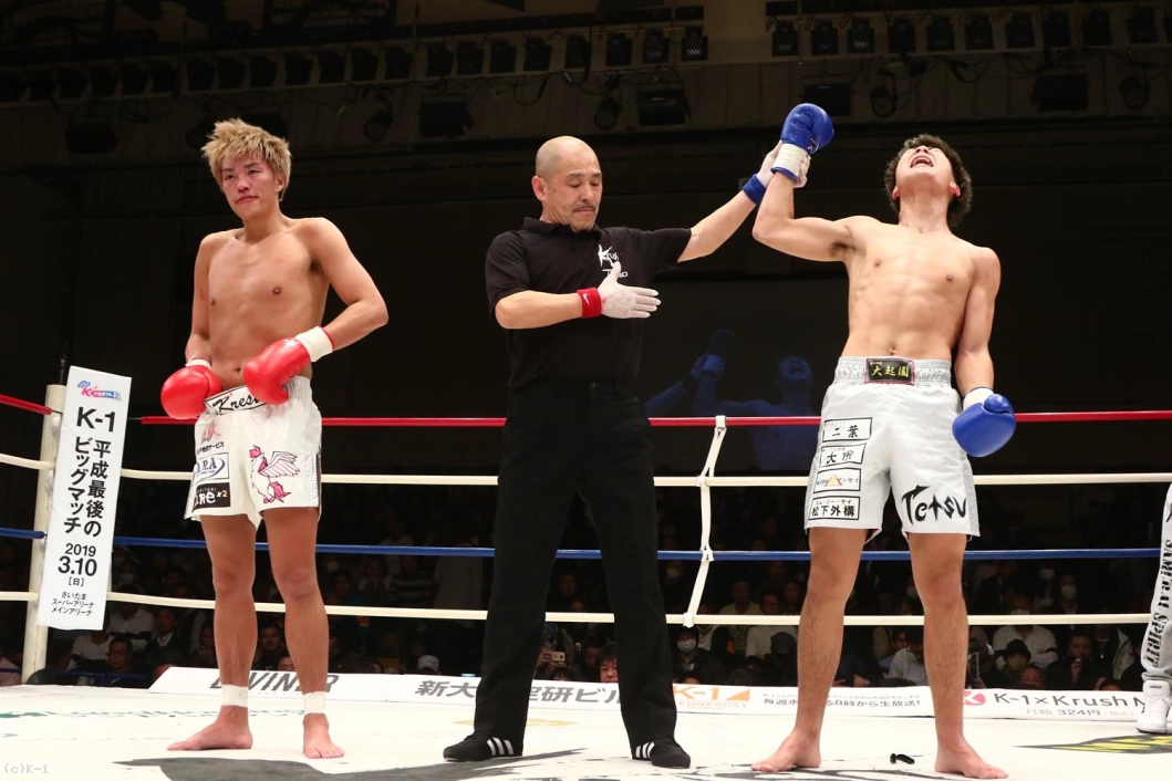 3R、TETSUは佐野の動きをよく研究している様子で、前蹴り・ジャブ・ワンツーと放って前進を食い止める。そして佐野に鼻血を出させると、ヒット&アウェーで佐野に反撃を許さない。TETSUは先にジャブ・ローを当て、その後ですぐ横にステップして佐野に追わせない。佐野はならばとヒザをボディに打ち込みながら前進。だがTETSUも右ストレートで反撃する。佐野もハイキックを当て試合終了となる。判定は29-29、30-27、30-28の2-0でTETSU。大好きだったと語る佐野から勝ち星を上げた。