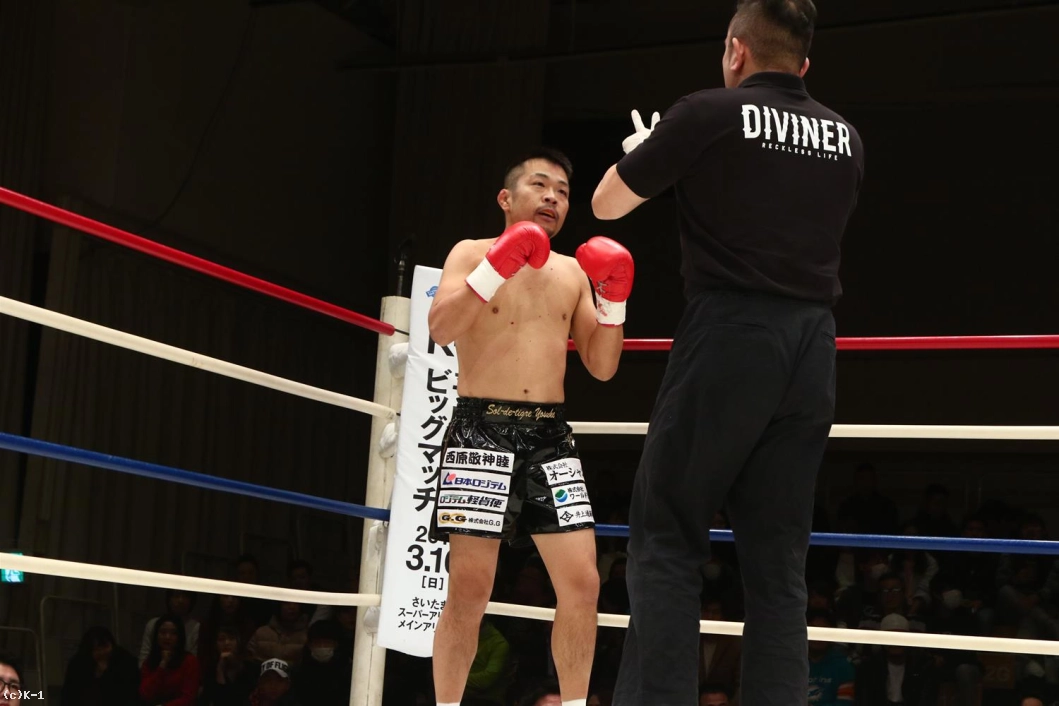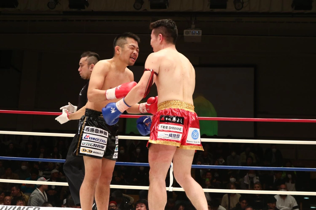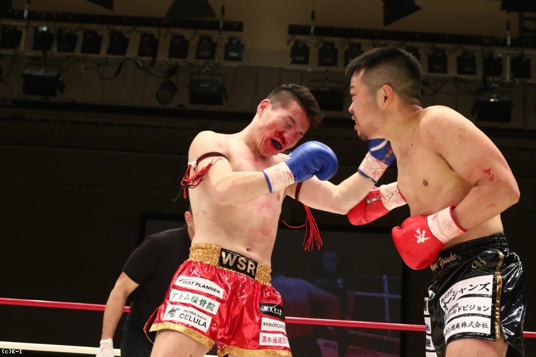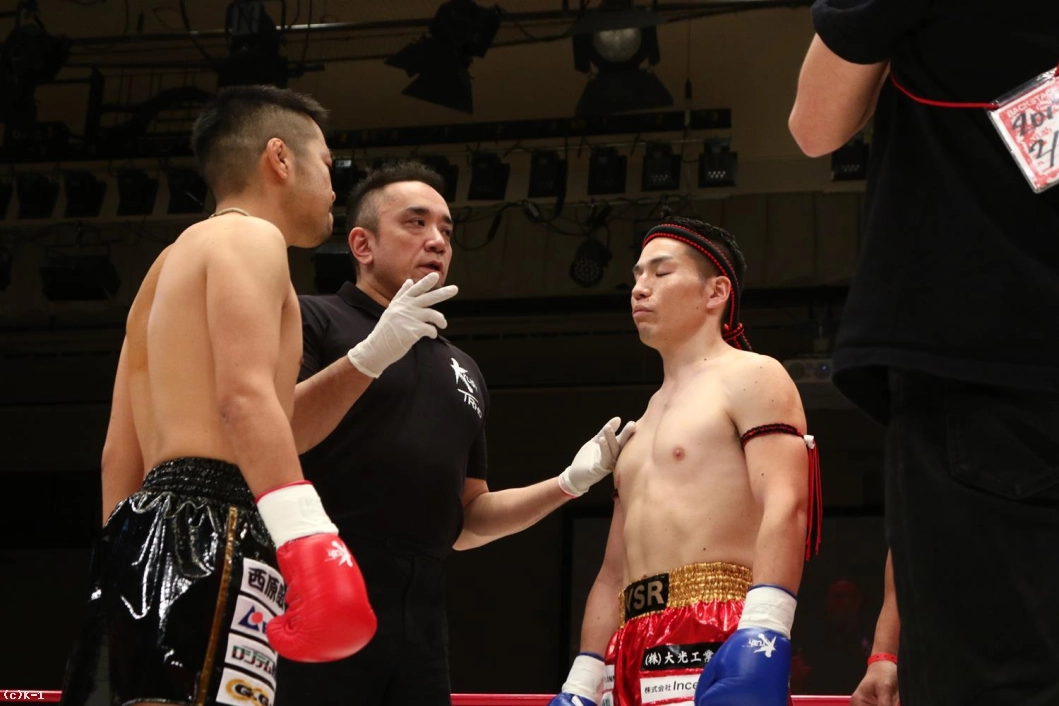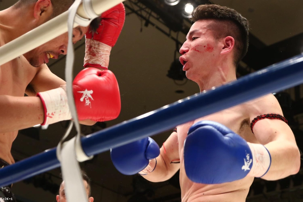 3R、聖也が前に出てヨースケをロープに押し込む。右アッパー、右ローの聖也に、ヨースケも右アッパー、左フックとパンチで応戦。聖也はこれにプッシングから右ロー。両者頭の位置が近くなってバッティングとなってしまいレフェリーから注意が出される。一進一退の両者。だが、前に出る圧力で勝っているのは聖也。口周辺を血で赤くしながらヨースケを下がらせていく。右フック、アッパーと放つヨースケだが聖也を押し返せない。