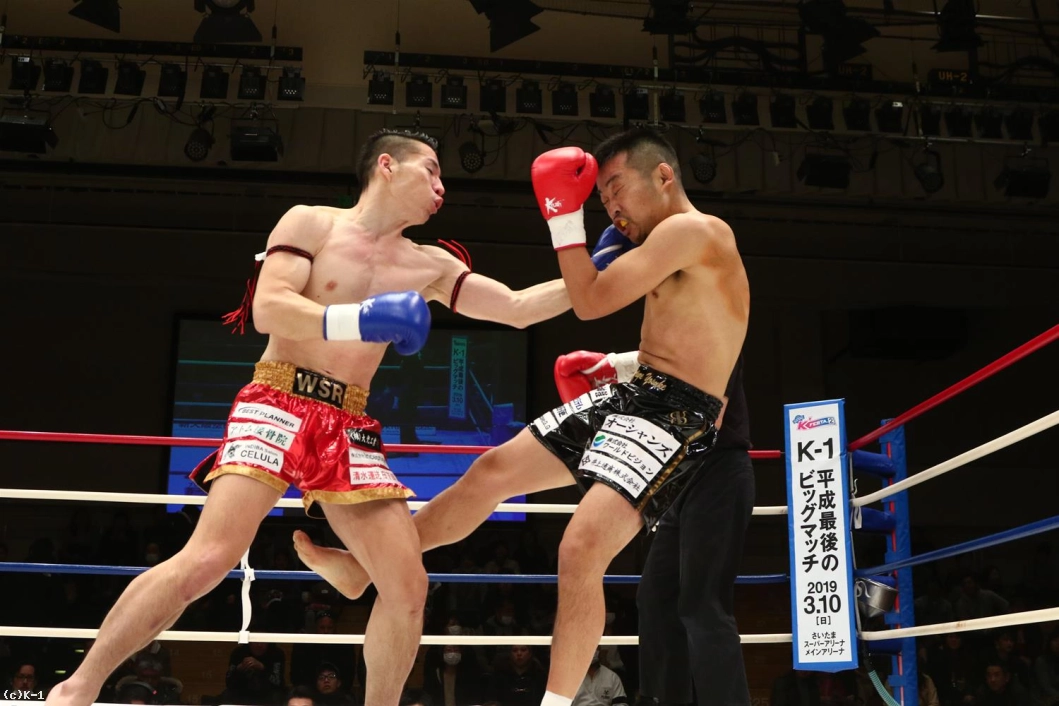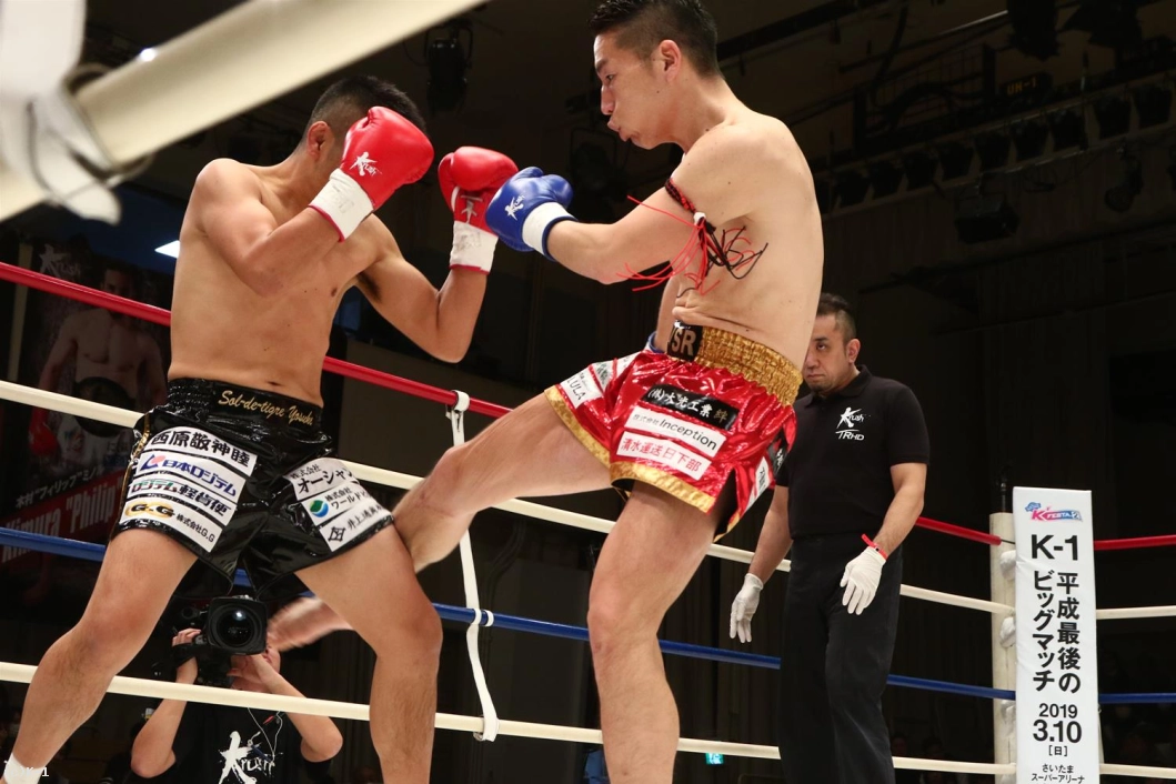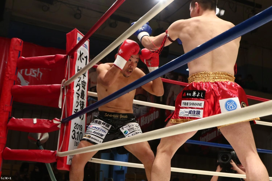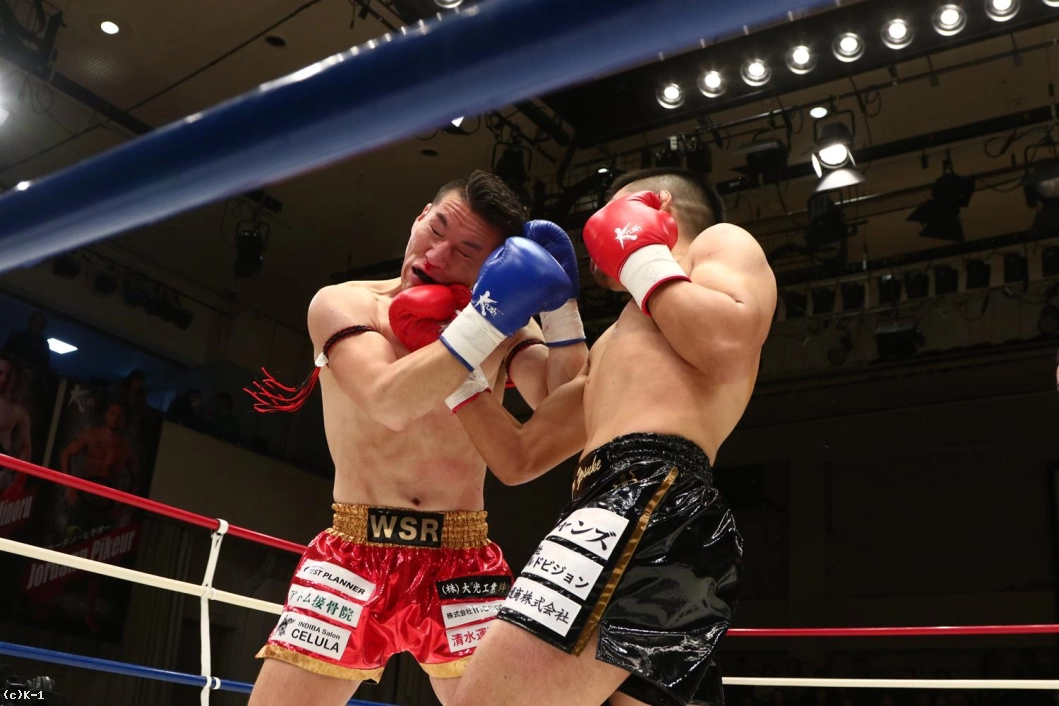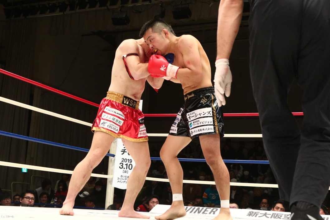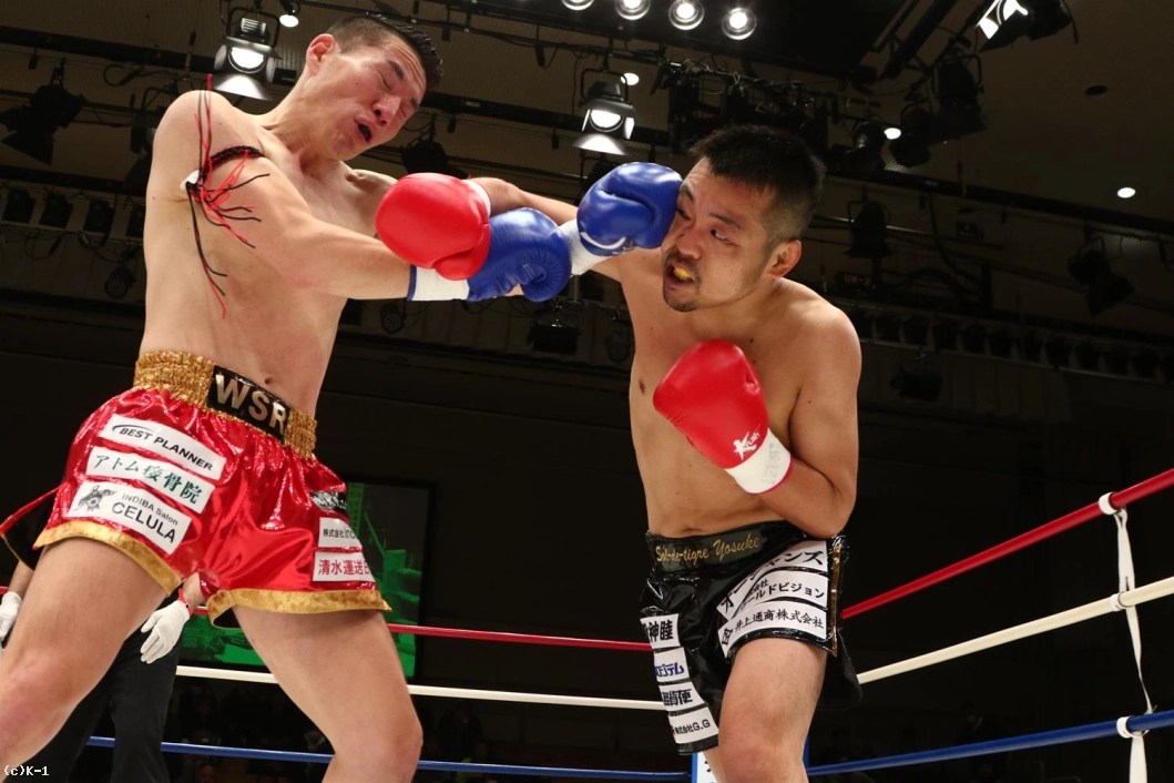 3R、聖也が前に出てヨースケをロープに押し込む。右アッパー、右ローの聖也に、ヨースケも右アッパー、左フックとパンチで応戦。聖也はこれにプッシングから右ロー。両者頭の位置が近くなってバッティングとなってしまいレフェリーから注意が出される。一進一退の両者。だが、前に出る圧力で勝っているのは聖也。口周辺を血で赤くしながらヨースケを下がらせていく。右フック、アッパーと放つヨースケだが聖也を押し返せない。
