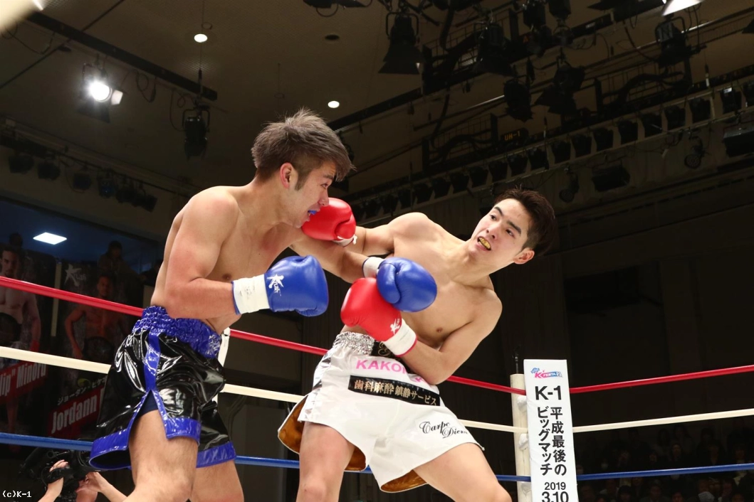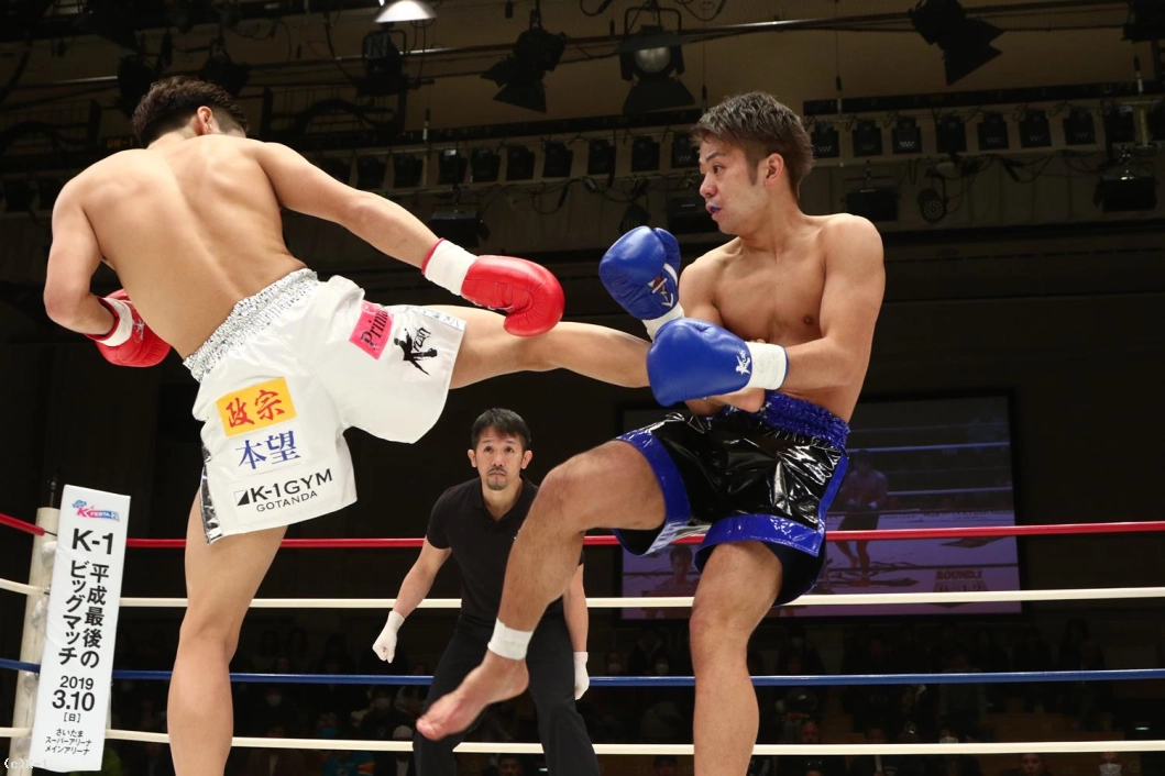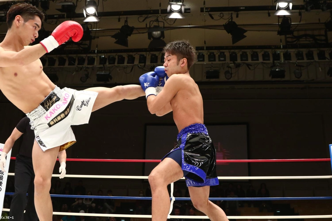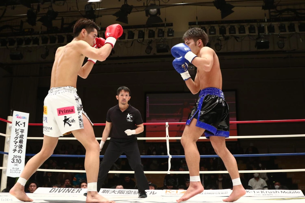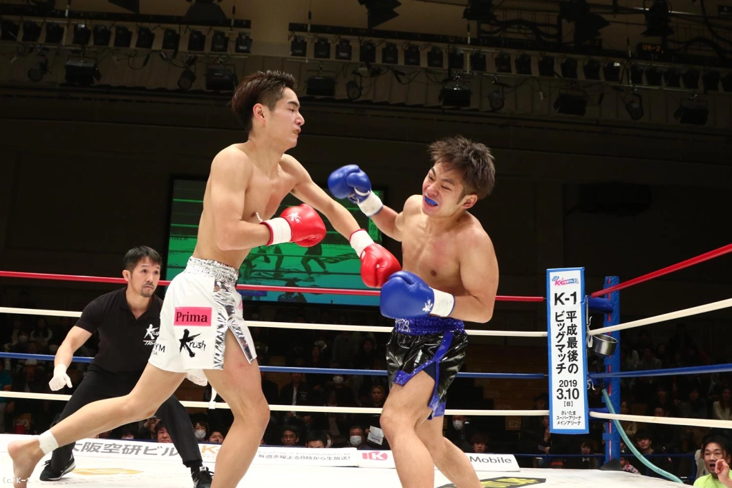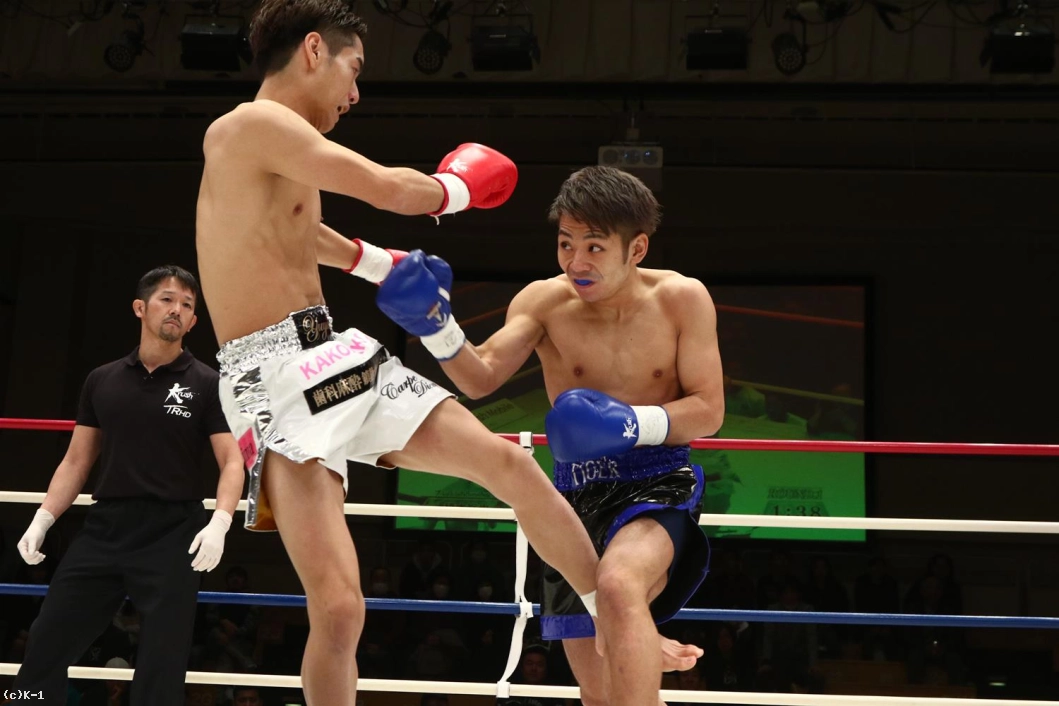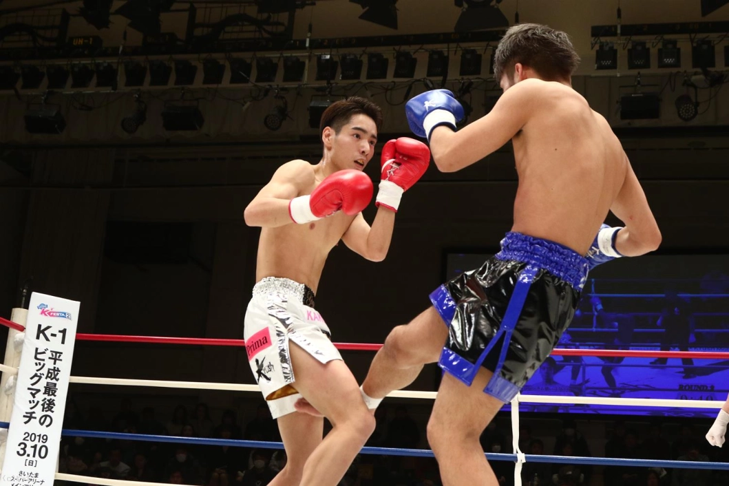 2R、藤田が右インローで先制するが、これがローブロー。橋本にインターバルが与えられる。再開後、橋本はやはり距離を作って左ミドルを藤田に打ち込む。飛び込まんとする藤田だが、橋本の作る遠い間合いに飛び込めない。右インローから間合いを詰めるきっかけを作ろうと右ストレートを当てる藤田。しかし橋本はすぐにバックステップして追撃を許さない。逆に橋本が左ストレートを伸ばして前に出ると、藤田は右ショートストレートをカウンターで当てる。
