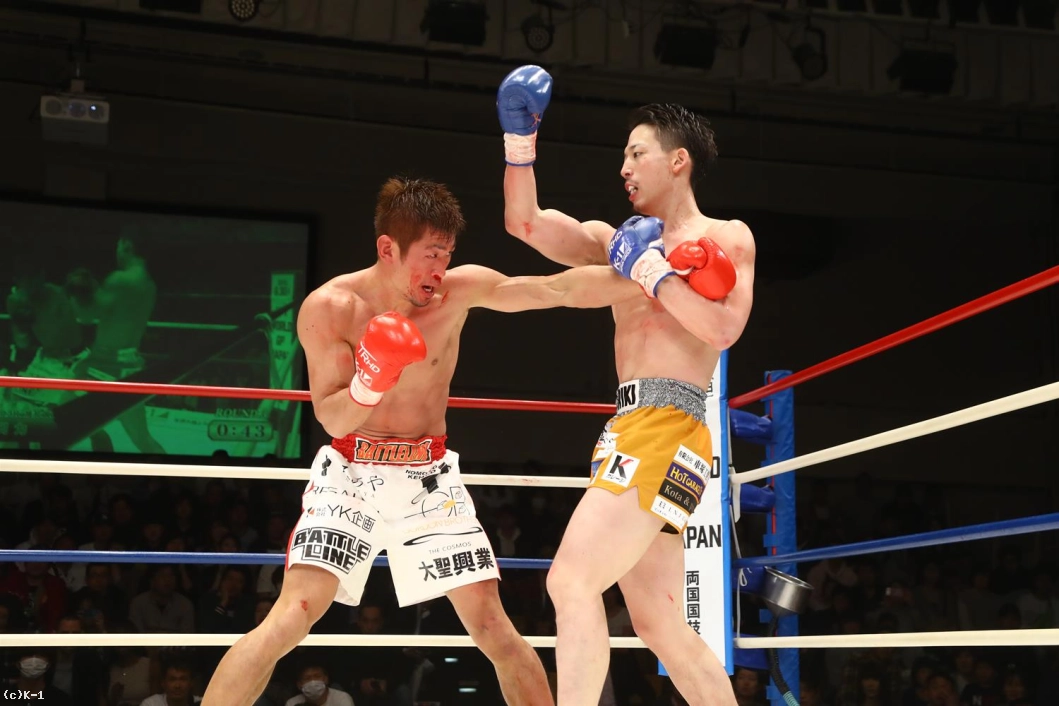 1R、牧平はサウスポーからジャブをスピーディーに突き、蹴りを狙う。これに対し松岡は間合いを取って無理に前に出ない。松岡は牧平の蹴りをさばきながらストレートを飛ばし、牧平の鼻柱を紅くする。