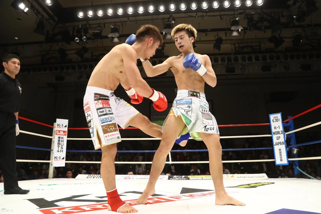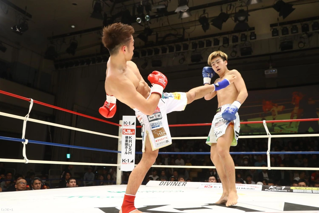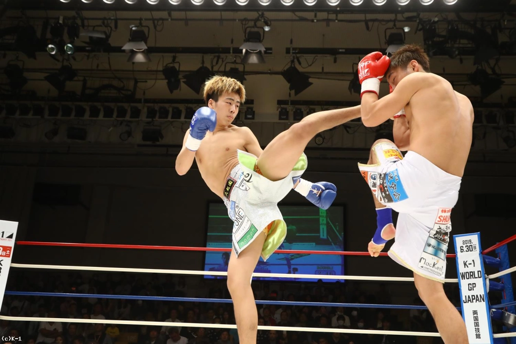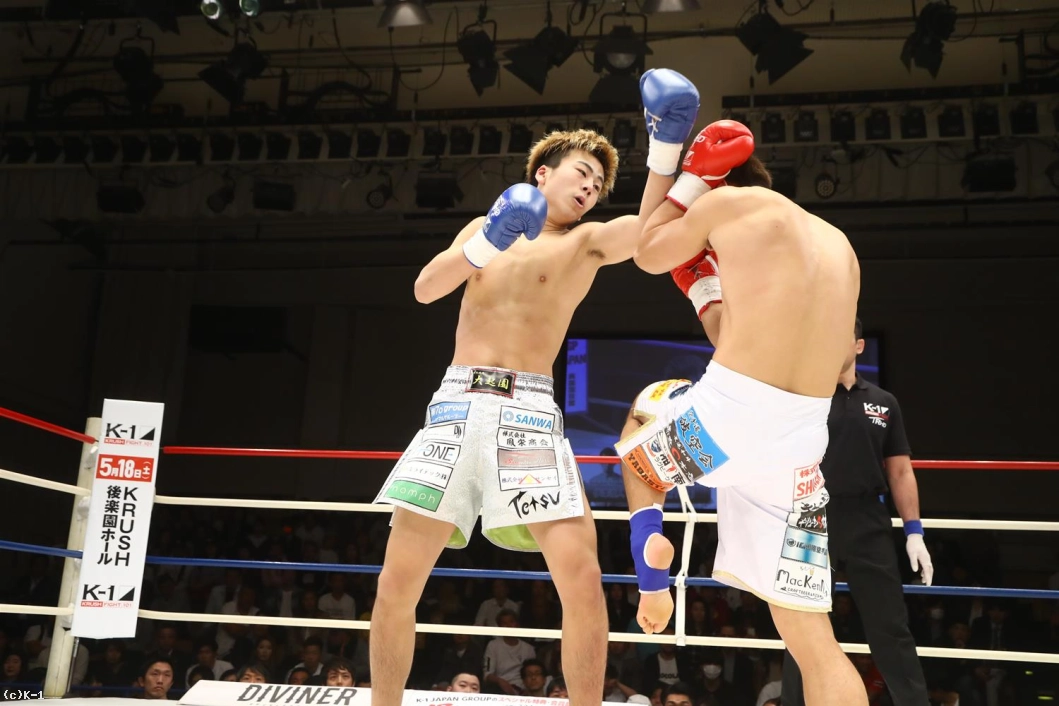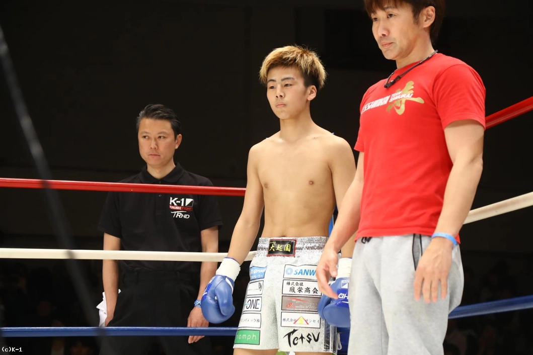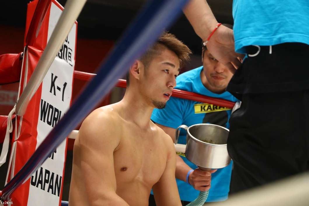 「(試合を振り返って?)途中、お腹が何回か効いたところがあったんですけど、でもローは対策どおり効かなかったので大丈夫かなと思いました。勇気出してがんばりました。(対戦相手の印象は?)動画で見るより厚みがあって、筋肉の盛り具合も僕と全然違うのでちょっとビビッちゃったんですけど、やってきた練習を信じて前に出てよかったと思います。練習で一日に何回もローキックを蹴ってもらいました、一万発以上は蹴られていると思います(笑)。(今後の目標は?)8月のK-1大阪に絶対に出たいので。地元で強い相手、格上とやらせてください」