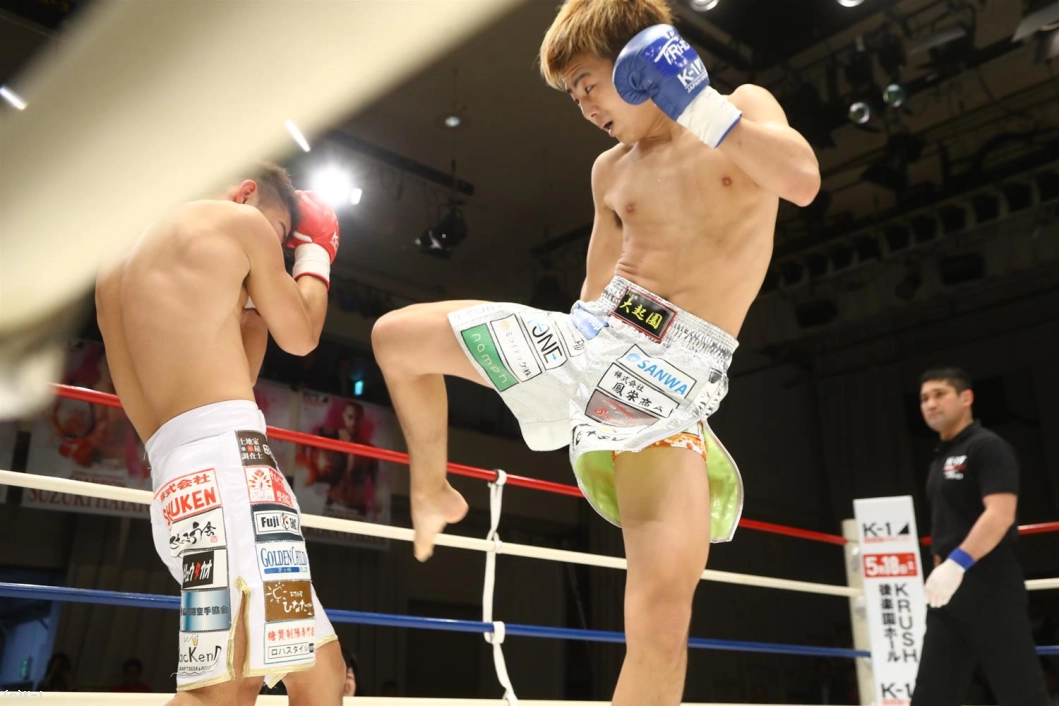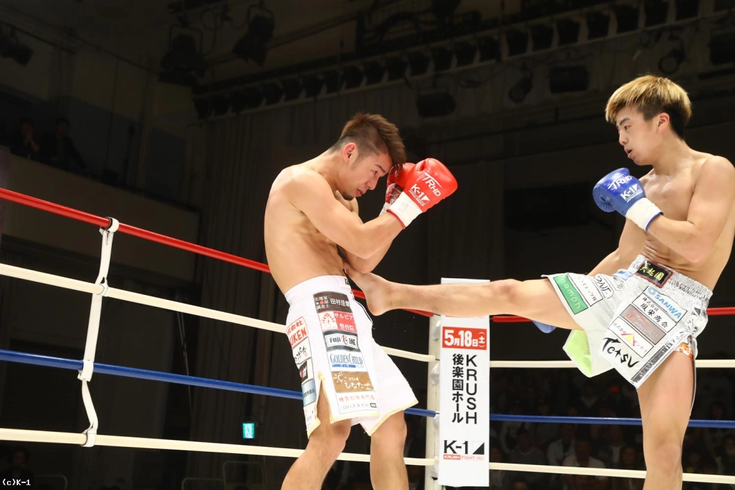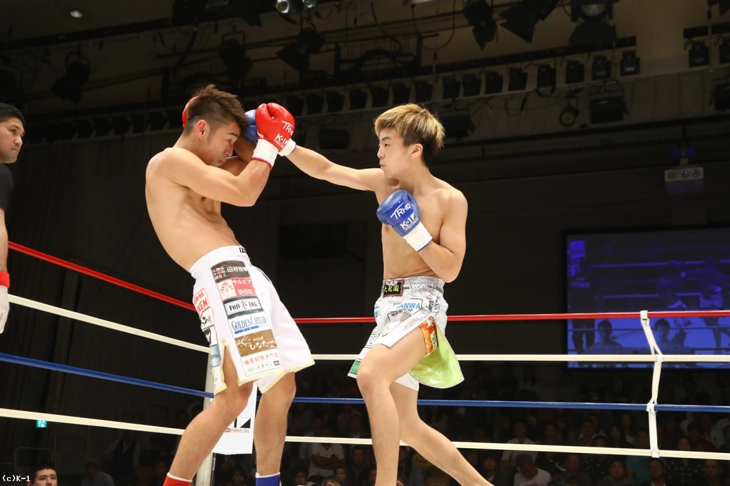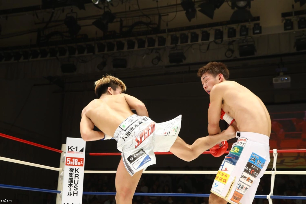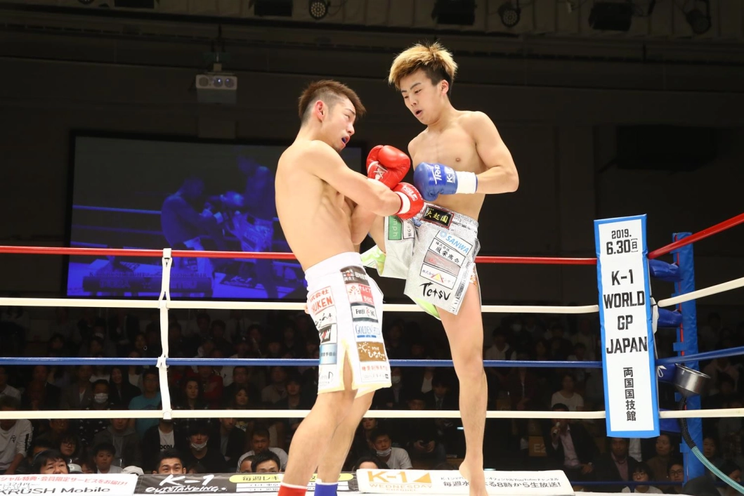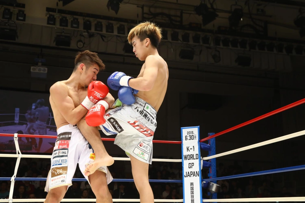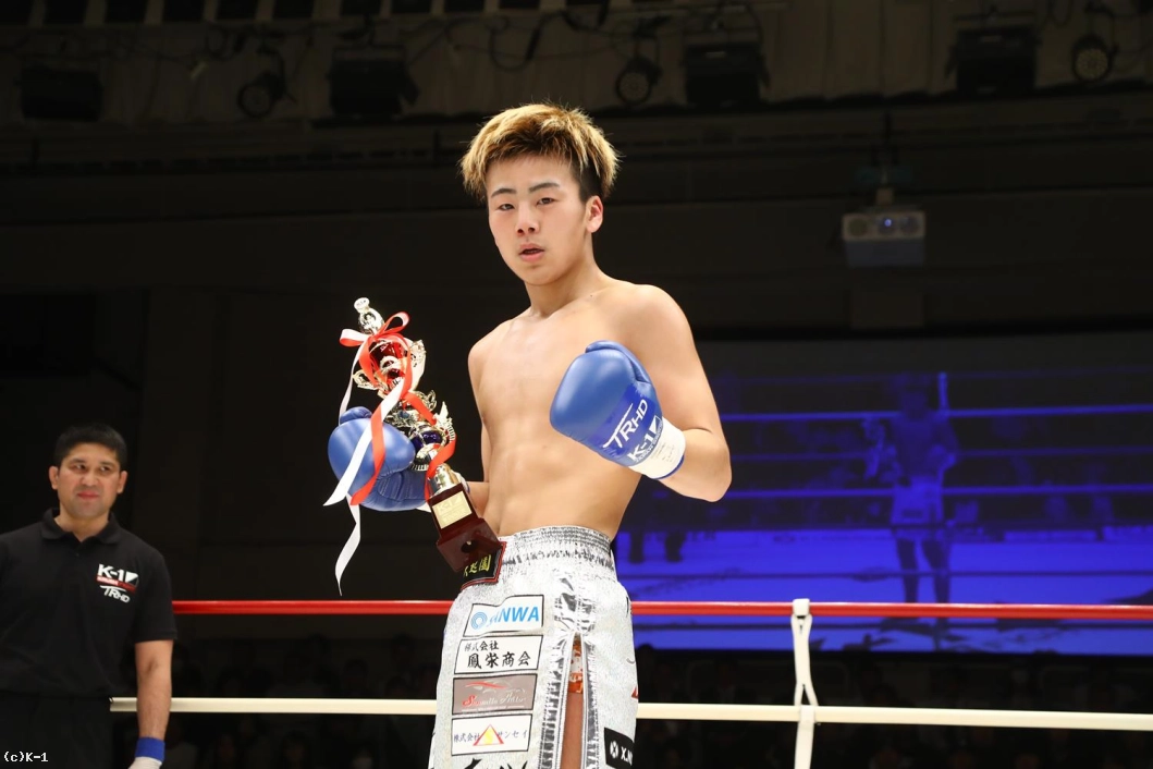 「(試合を振り返って?)途中、お腹が何回か効いたところがあったんですけど、でもローは対策どおり効かなかったので大丈夫かなと思いました。勇気出してがんばりました。(対戦相手の印象は?)動画で見るより厚みがあって、筋肉の盛り具合も僕と全然違うのでちょっとビビッちゃったんですけど、やってきた練習を信じて前に出てよかったと思います。練習で一日に何回もローキックを蹴ってもらいました、一万発以上は蹴られていると思います(笑)。(今後の目標は?)8月のK-1大阪に絶対に出たいので。地元で強い相手、格上とやらせてください」