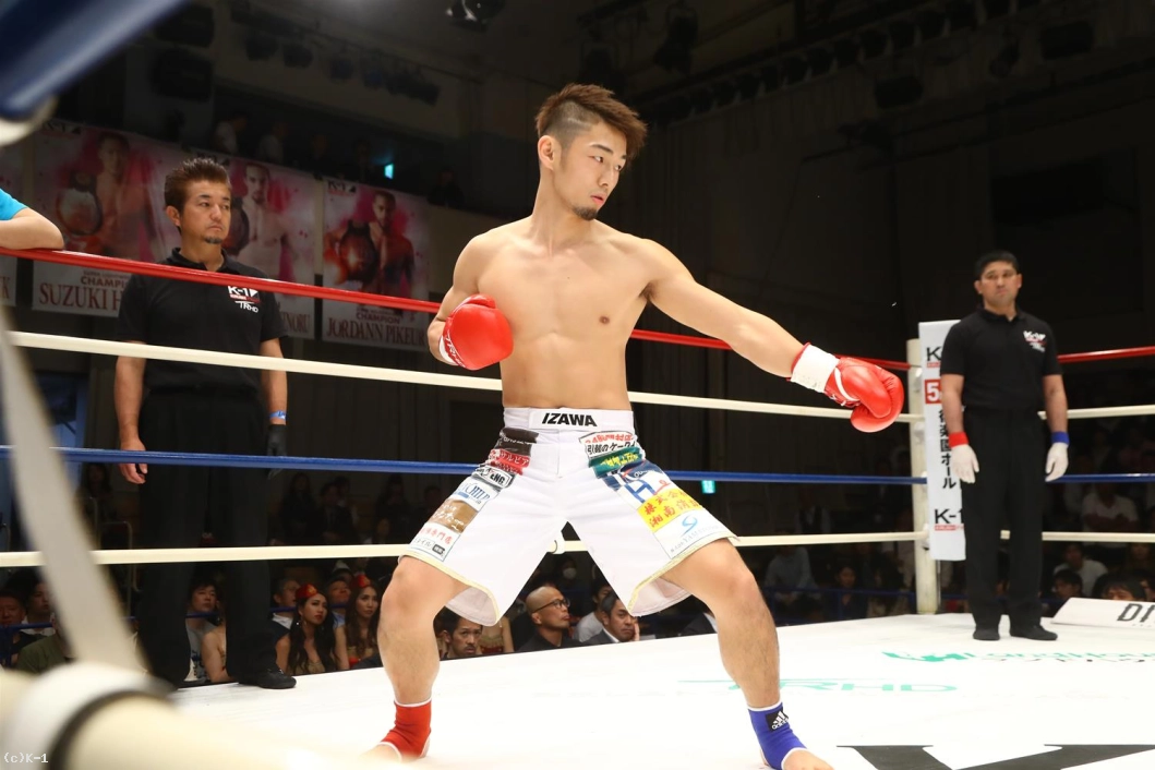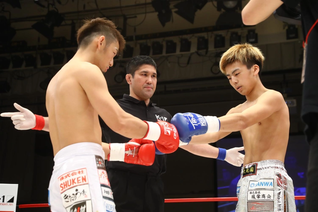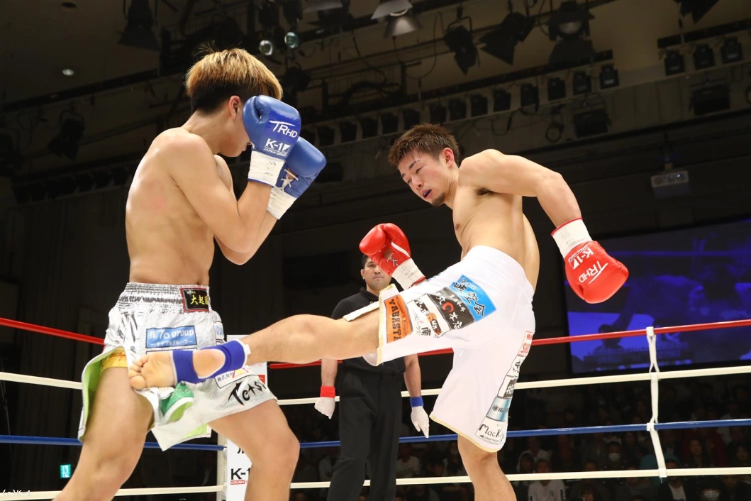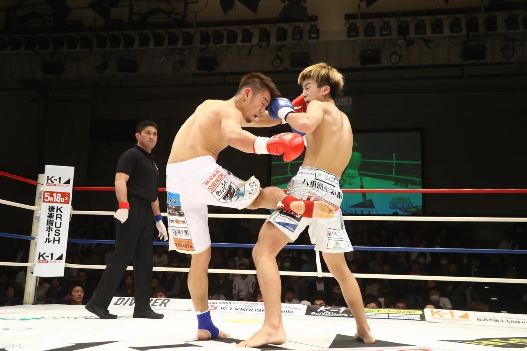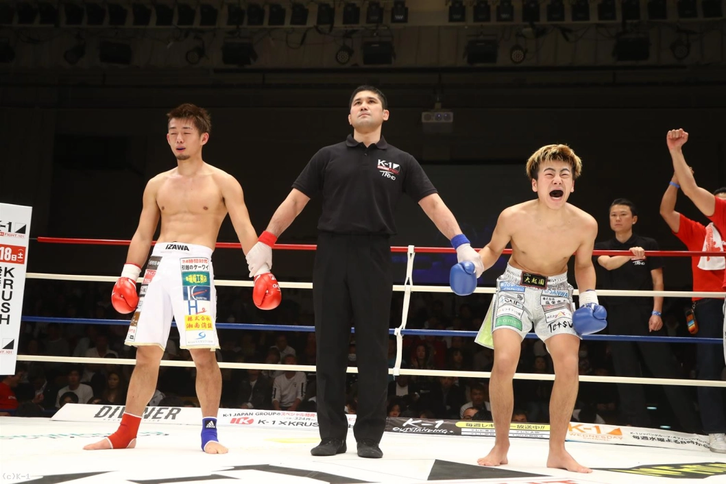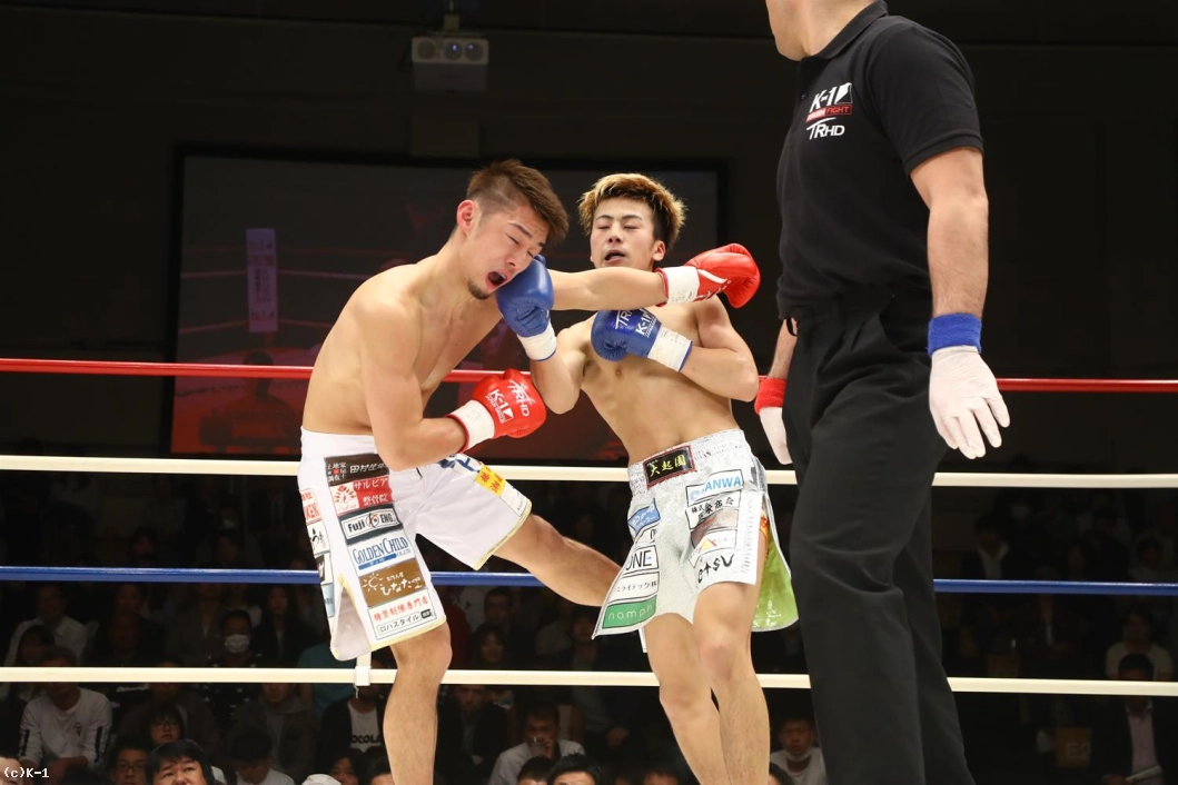 「(試合を振り返って?)途中、お腹が何回か効いたところがあったんですけど、でもローは対策どおり効かなかったので大丈夫かなと思いました。勇気出してがんばりました。(対戦相手の印象は?)動画で見るより厚みがあって、筋肉の盛り具合も僕と全然違うのでちょっとビビッちゃったんですけど、やってきた練習を信じて前に出てよかったと思います。練習で一日に何回もローキックを蹴ってもらいました、一万発以上は蹴られていると思います(笑)。(今後の目標は?)8月のK-1大阪に絶対に出たいので。地元で強い相手、格上とやらせてください」