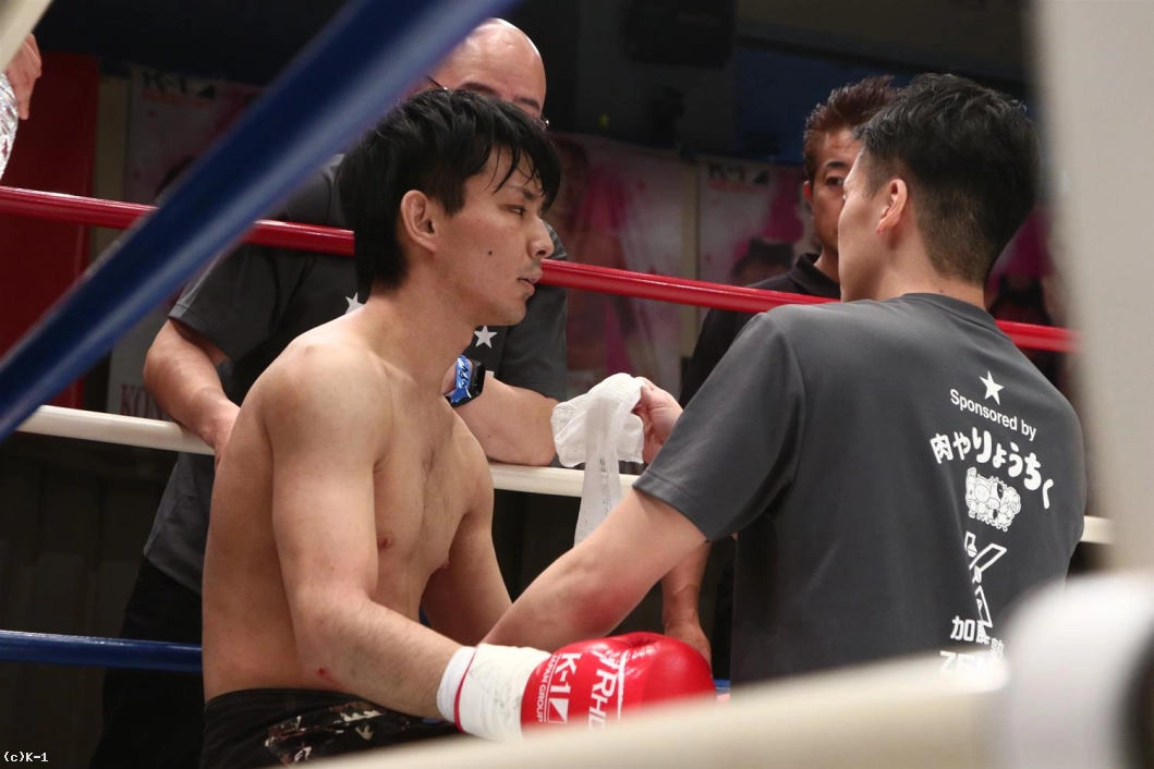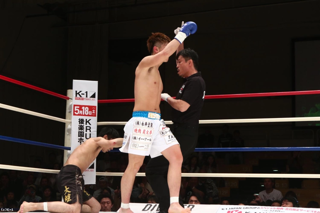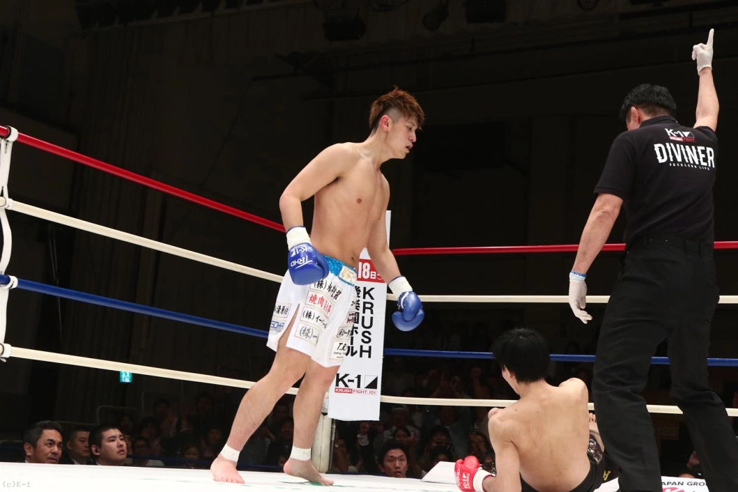 2Rに入っても勢いに乗る寺島は前に出て左ボディを突き刺しダウンを奪う。小島が立ってくるとさらにボディを追撃し、ハイキックで2度目のダウンを奪う。小島は立ち上がるも足に異状があったか、足を気にする素振りを見せる。寺島はそこへ跳びヒザで襲い掛かり、小島が押し倒されるように崩れると、レフェリーはここで試合を止めた。