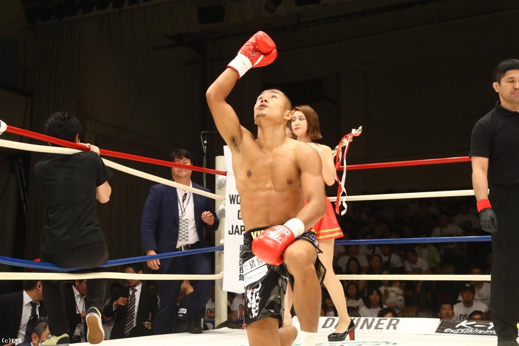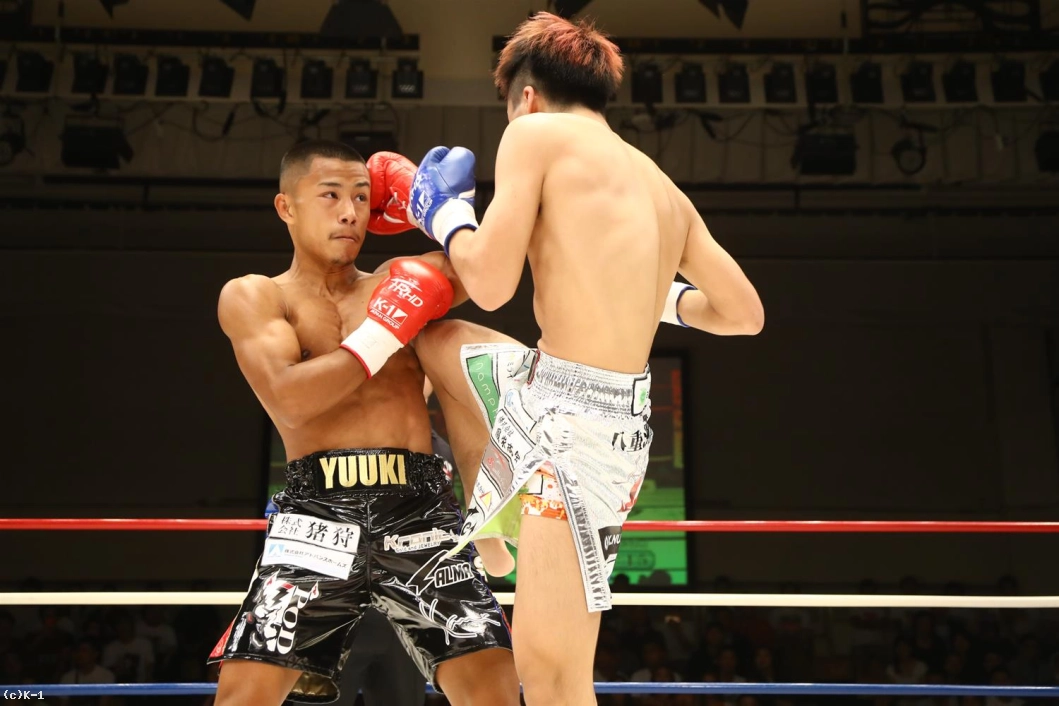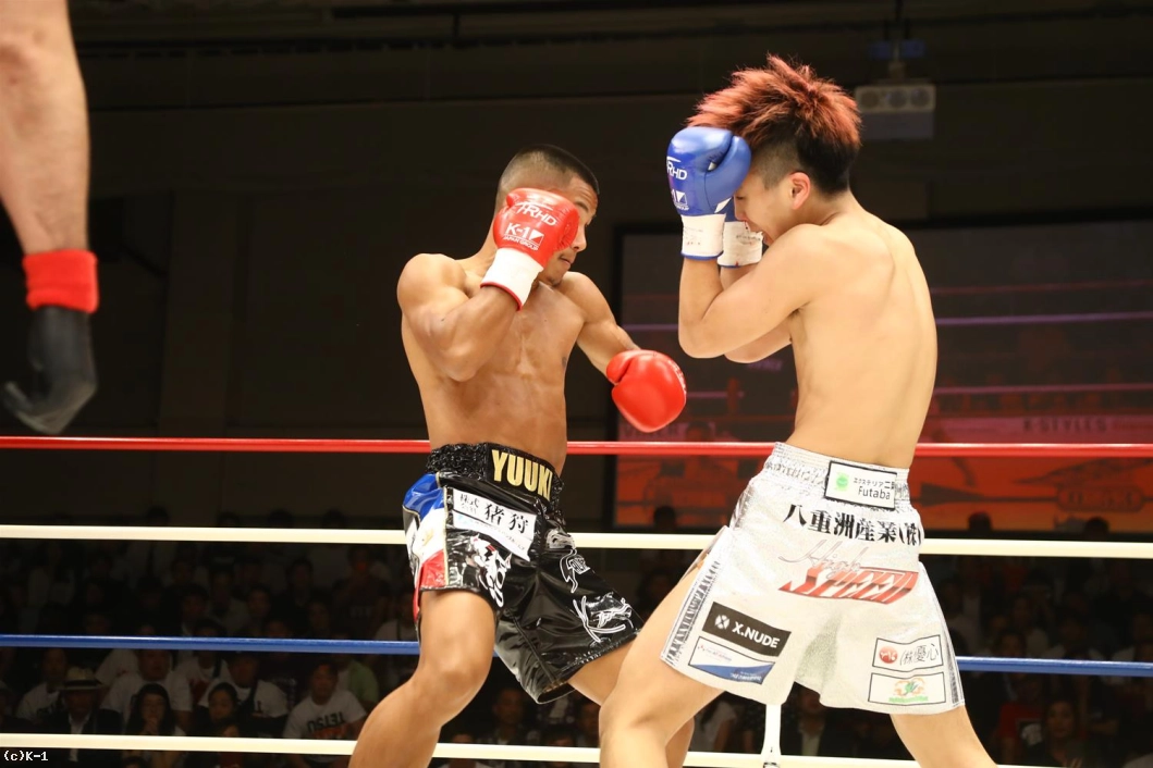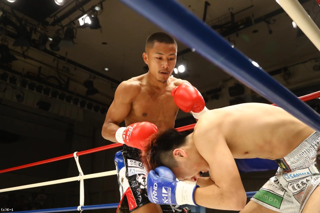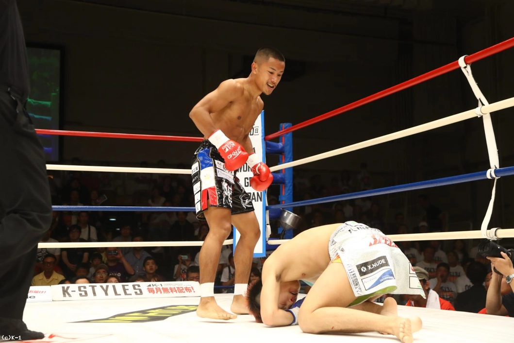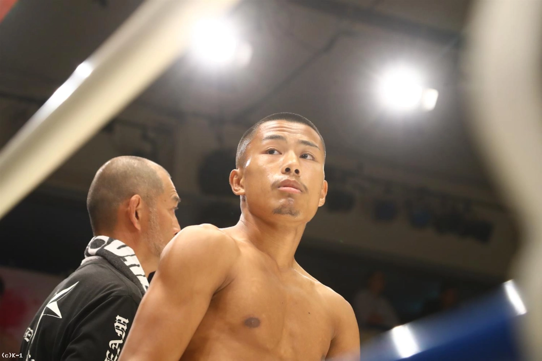 「(試合を振り返って?)TETSU選手は根性があって、三回倒れても立ってくる勢いだったんで。挑戦者としての心はすごく尊敬します。(最初から倒すつもりだった?)流れの中でというイメージでしたけど、当たってちょっと目がうろついてたんで、いけるなと思って倒しにいきました。(どんなパンチを練習してきた?)今回、見せられなかったんですけど、タイ修行に行って蹴りのほうを練習して。会長にもっと蹴り出せって怒られちゃいました(苦笑)。倒しに急いじゃって、蹴りが出せなかったなって感じですね。(K-1のタイトルへの気持ちは?)今回の試合でいい印象が与えられたと思っているので。K-1に向けて大きな第一歩だと思ってます。(戦いたい相手は?)K-1のチャンピオンの村越選手と一度はやりたいですね。(今後の目標は?)ベルトを守り抜いたので、これからも応援よろしくお願いします」