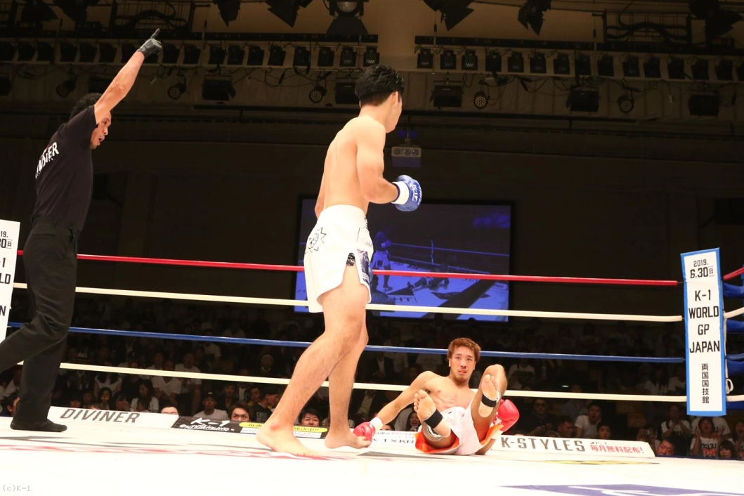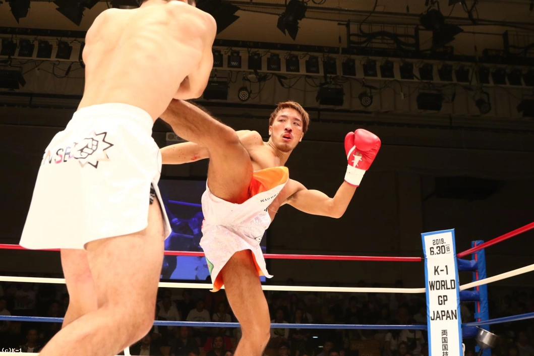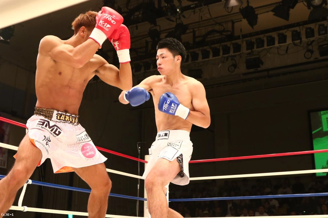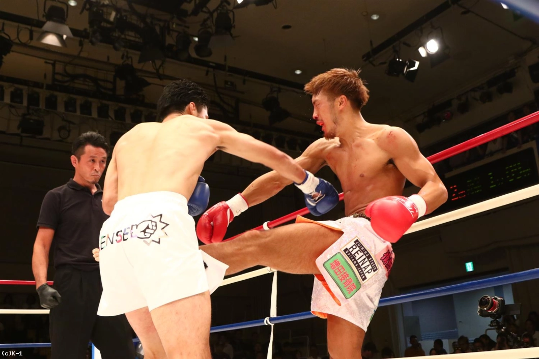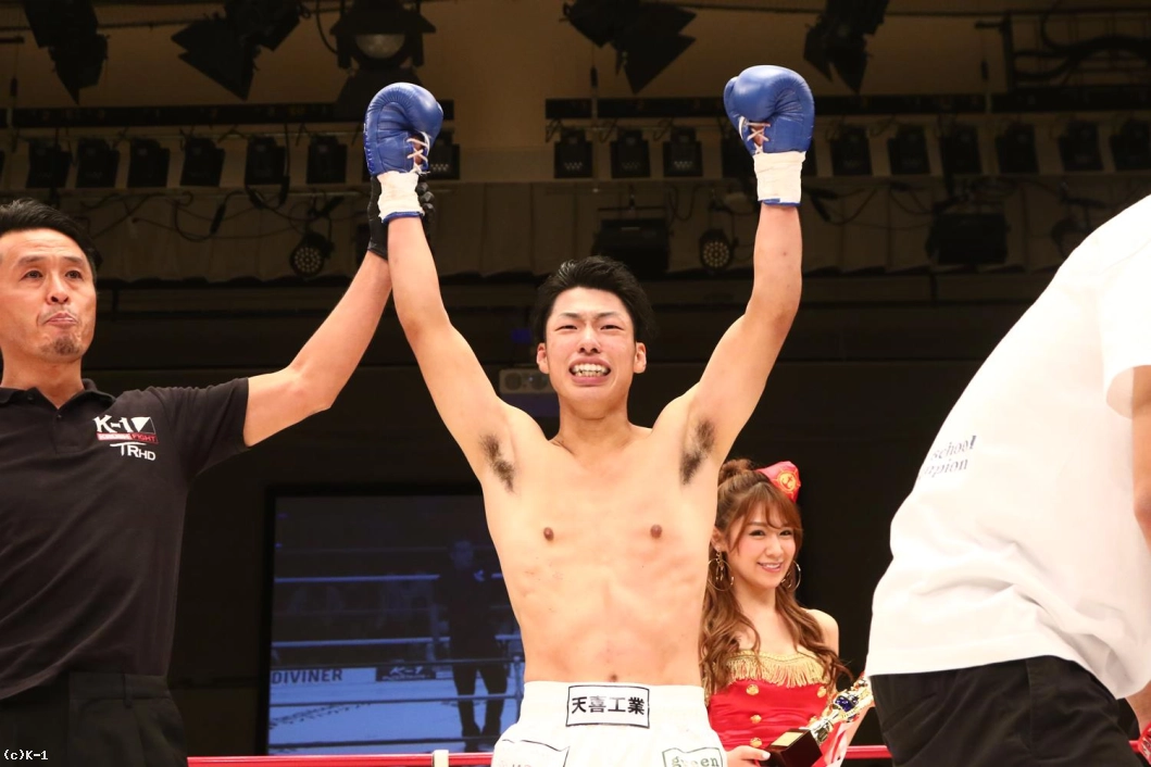 「(試合を振り返って?)FUMIYA選手が計量をクリアできなくて、ちょっと怖い部分もあったんですけど、勝ててよかったです。(対戦相手の印象は?)ローが強くてパワーがあったんで、落ち着いて冷静に戦おうと意識して練習してきました。(今後の目標は?)たくさんの応援ありがとうございました。8月にやるK-1大阪に(近藤)魁成と一緒に出て、勝ちたいと思います」