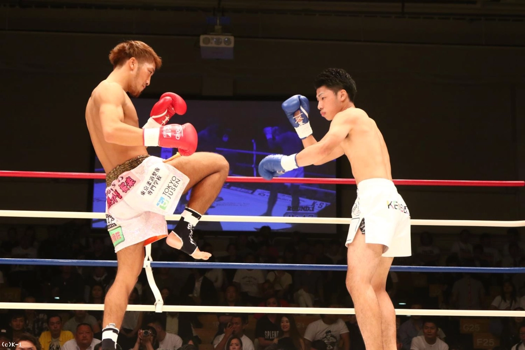1R、FUMIYAは右ローを入れながら前に出て圧力を掛けていく。しかし近藤はラウンド中盤にはリング中央に出て前蹴り・横蹴りでFUMIYAを遠ざける。近藤はさらに前蹴りのヒットからジャブも見舞い、これで距離感を掴むとラウンド終盤に右ストレートを打ち込みダウンを奪って初回を終える。