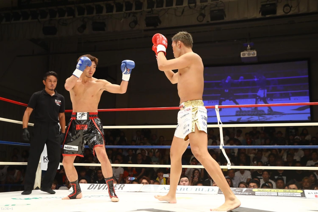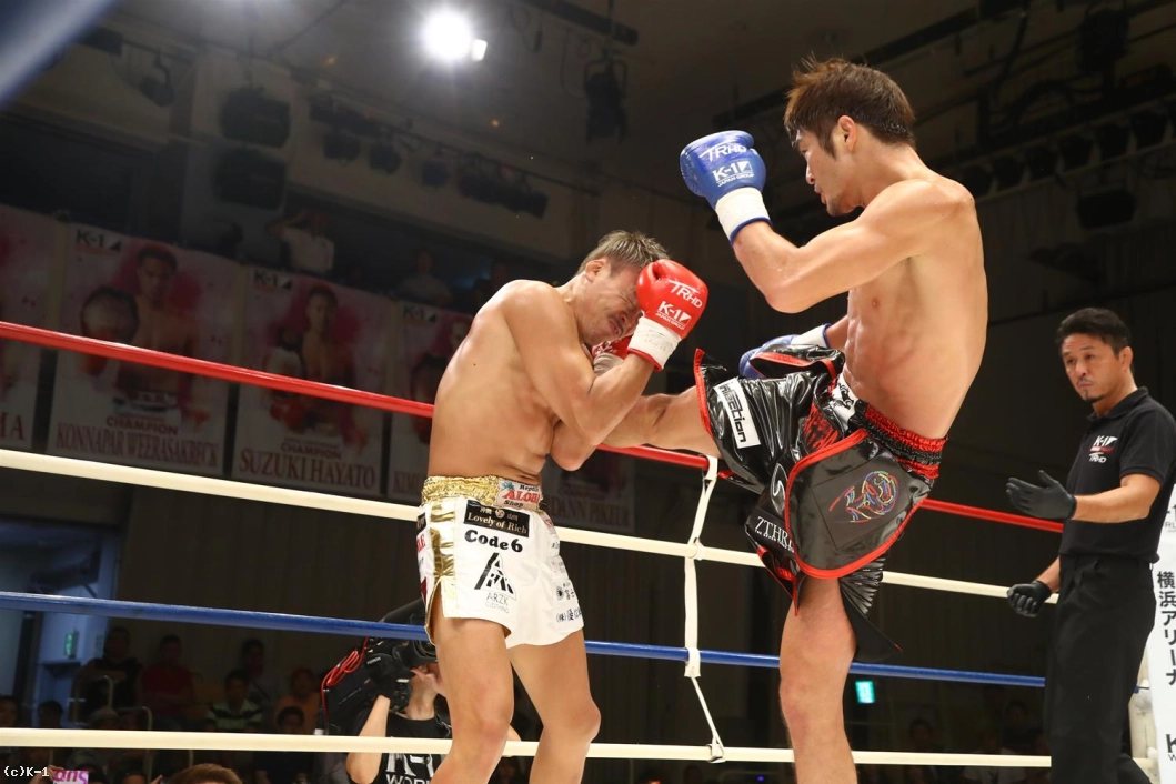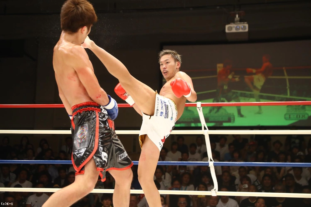 1R、鈴木はサウスポーから得意とする左ミドルを連続で飛ばしていく。左右田は左ローを入れつつ、身を引いて鈴木の左ミドルをかわしていく。鈴木は右ローを入れた後で左ハイを放ってヒット。上・中・下と蹴り分けることで左右田のディフェンスをかく乱する。この蹴りに止められ左右田は間合いを詰められない。しかし鈴木が前に来たところで右ストレートをヒット。鈴木は左ミドルだけでなく、右ローも多用して当てていく。