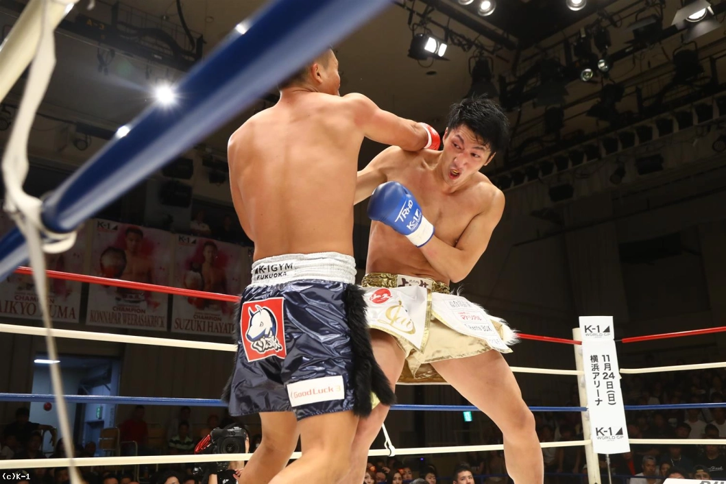 「今日はみなさんありがとうございます。(ベルトを腰にして)似合うかな、これ。でもK-1のベルトの方がカッコいいし、すぐ獲りに行きます。いま九州の選手が育っていて、元は俺もRUIもSATORU成合選手も瓦田脩二選手も同じジムで練習していました。いま九州の格闘技のレベルが上がっていて、ファンも増えています。来年、この勢いをさらに盛り上げてK-1福岡大会、是非やりましょう。先週、愛鷹選手がチャンピオンのカリミアン選手を倒して、かなりシビれました。愛鷹選手とは1勝1敗で決着ついてないんで、一緒に愛知を盛り上げてもいいじゃないかと思ってます。よろしくお願いします」
