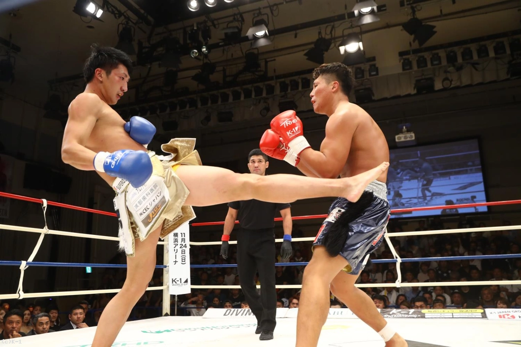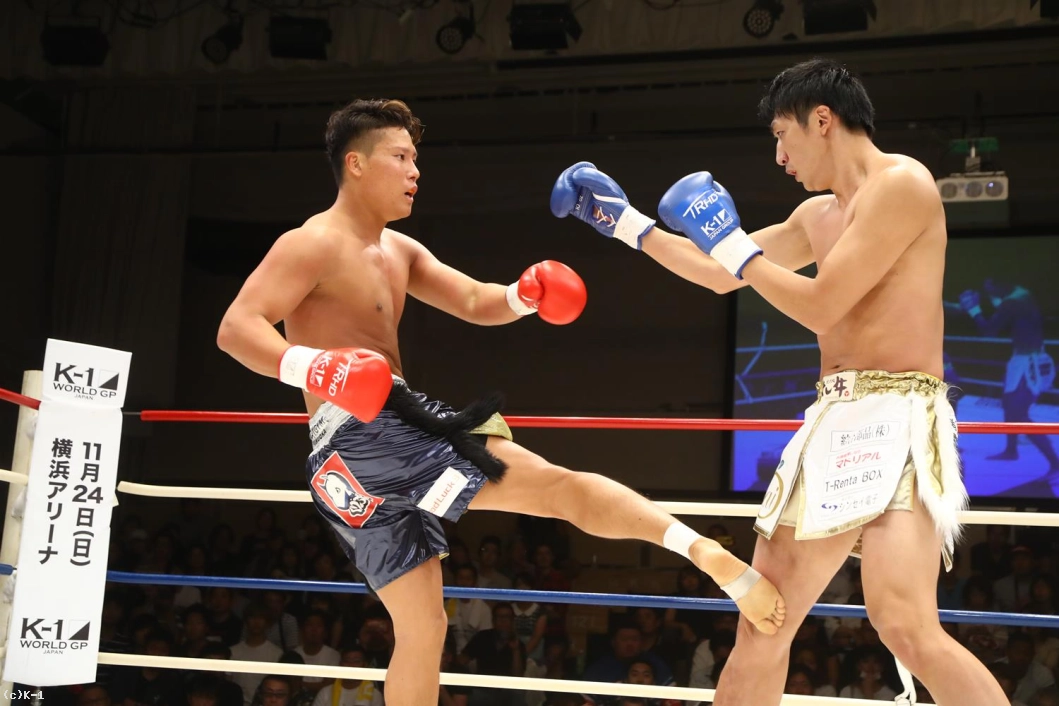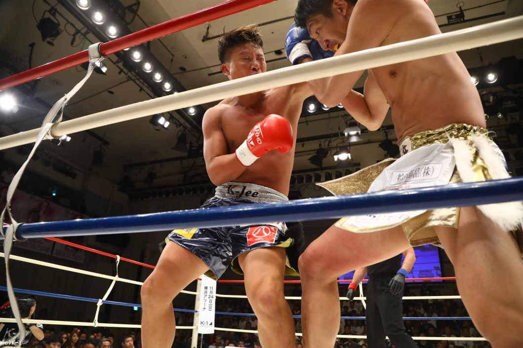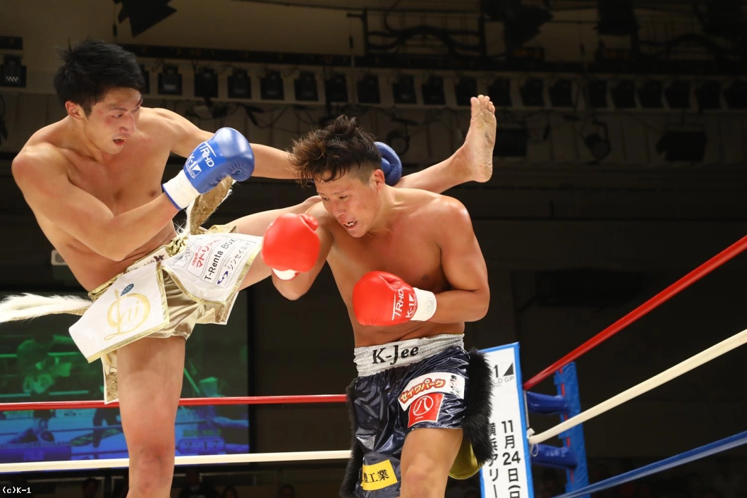 1R、サウスポーのRUIにK-Jeeが右ローを飛ばしてスタート。距離を詰めんとするK-Jeeだが、RUIはバックステップして下がり前蹴りを飛ばす。K-Jeeをうまく懐に入れないRUI。逆に前蹴りを放ちながら前に出て、K-Jeeをロープに追い詰めていく。だが、K-Jeeも跳び前蹴りからラフな攻勢で前に出返す。RUIがそれでも出てくるとロープを背にしながら右ストレートをヒット。しかしラウンド終盤はRUIも得意のヒザをK-Jeeのボディに突き刺す。