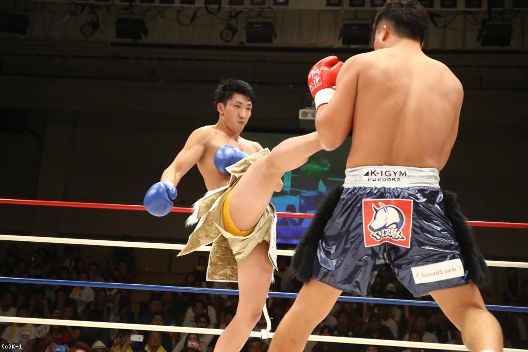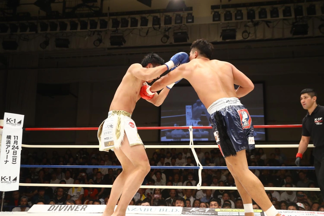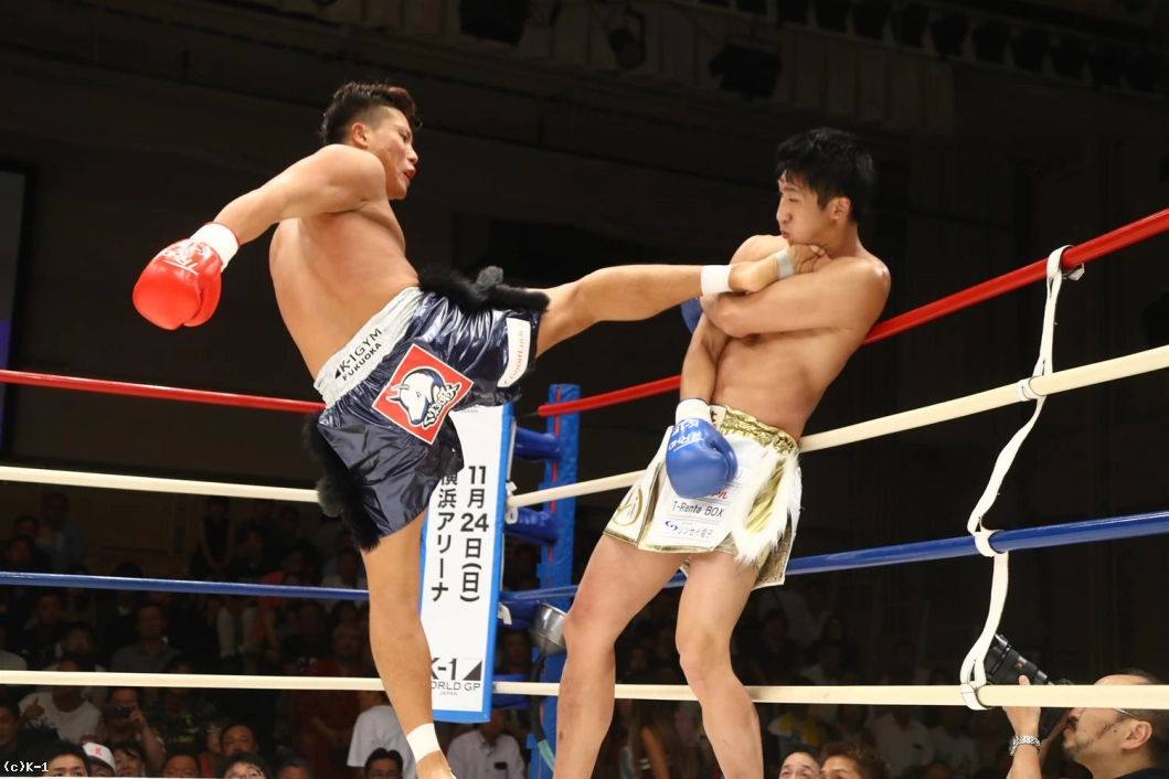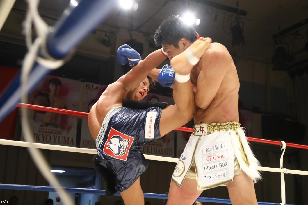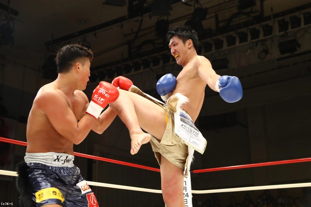 1R、サウスポーのRUIにK-Jeeが右ローを飛ばしてスタート。距離を詰めんとするK-Jeeだが、RUIはバックステップして下がり前蹴りを飛ばす。K-Jeeをうまく懐に入れないRUI。逆に前蹴りを放ちながら前に出て、K-Jeeをロープに追い詰めていく。だが、K-Jeeも跳び前蹴りからラフな攻勢で前に出返す。RUIがそれでも出てくるとロープを背にしながら右ストレートをヒット。しかしラウンド終盤はRUIも得意のヒザをK-Jeeのボディに突き刺す。