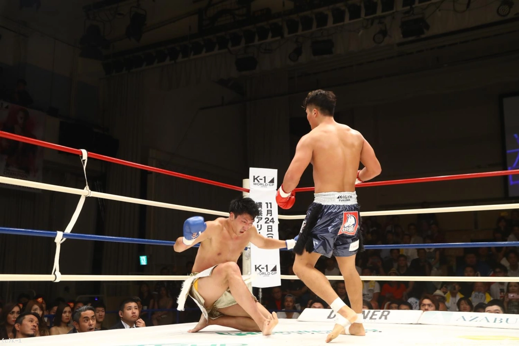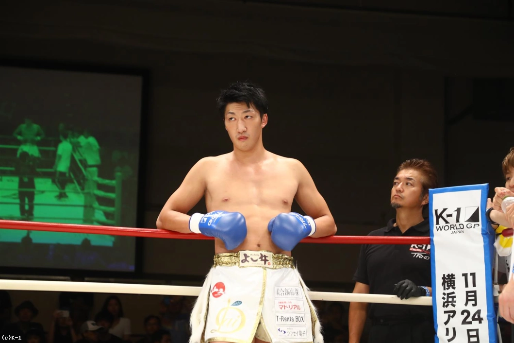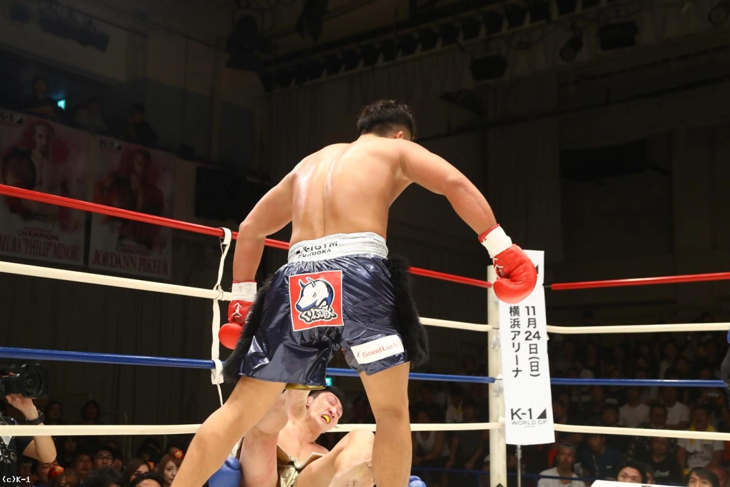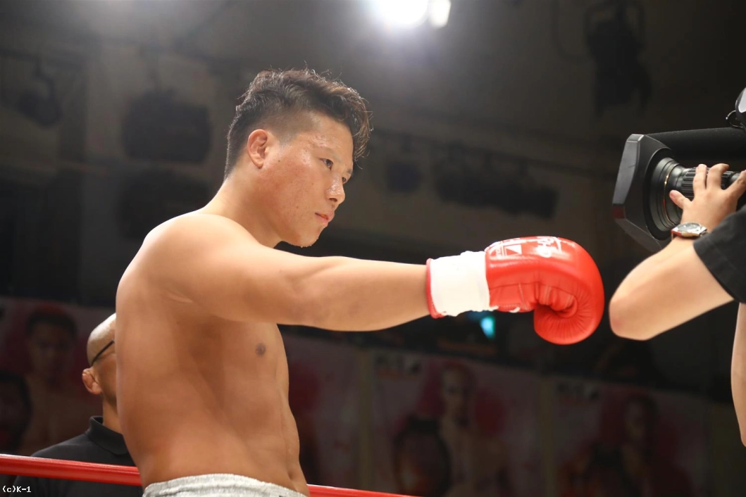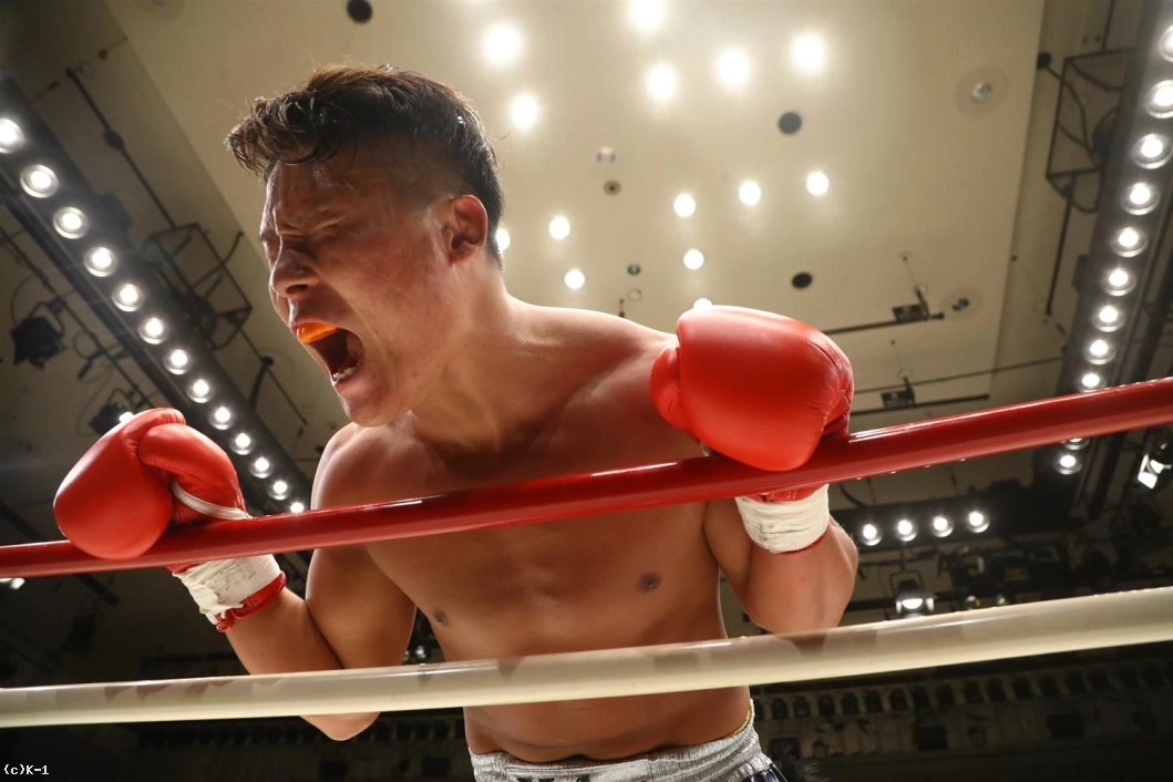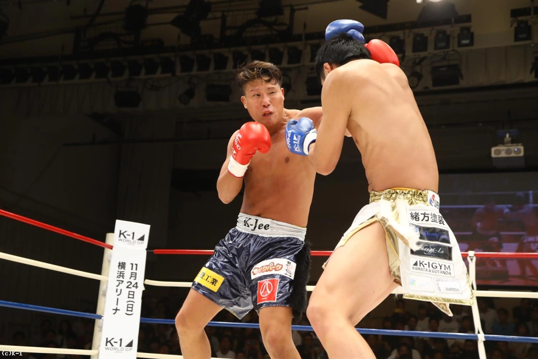 「(試合を振り返って?)だんだん記憶が戻ってきて。うまくやられたなという感じですね。警戒してたパンチをモロにもらってしまったというか。そこですね、敗因は。1Rの立ち上がりは僕のほうが圧力をかけてましたし、相手がいやがってるのはわかりました。2Rになって、いききれないのが自分の弱さですね。もっともっと練習して、自分のものにしていかないとなって思います。(感慨深さは感じた?)向かい合ったとき、お互い目は合わせてないですね。お互いに目を合わせると、いけるとこいけなくなっちゃうのかなって、正直感じました。K-Jeeさんと戦えてよかったです。悔しいですけど。ただ、試合後のマイクはへたくそだなと思いました(笑)。またやり返して、僕がK-1福岡を宣言したいと思います。(ファンにメッセージを)期待を裏切ってしまって、申し訳ない気持ちでいっぱいです。もっともっとがんばっていきます」