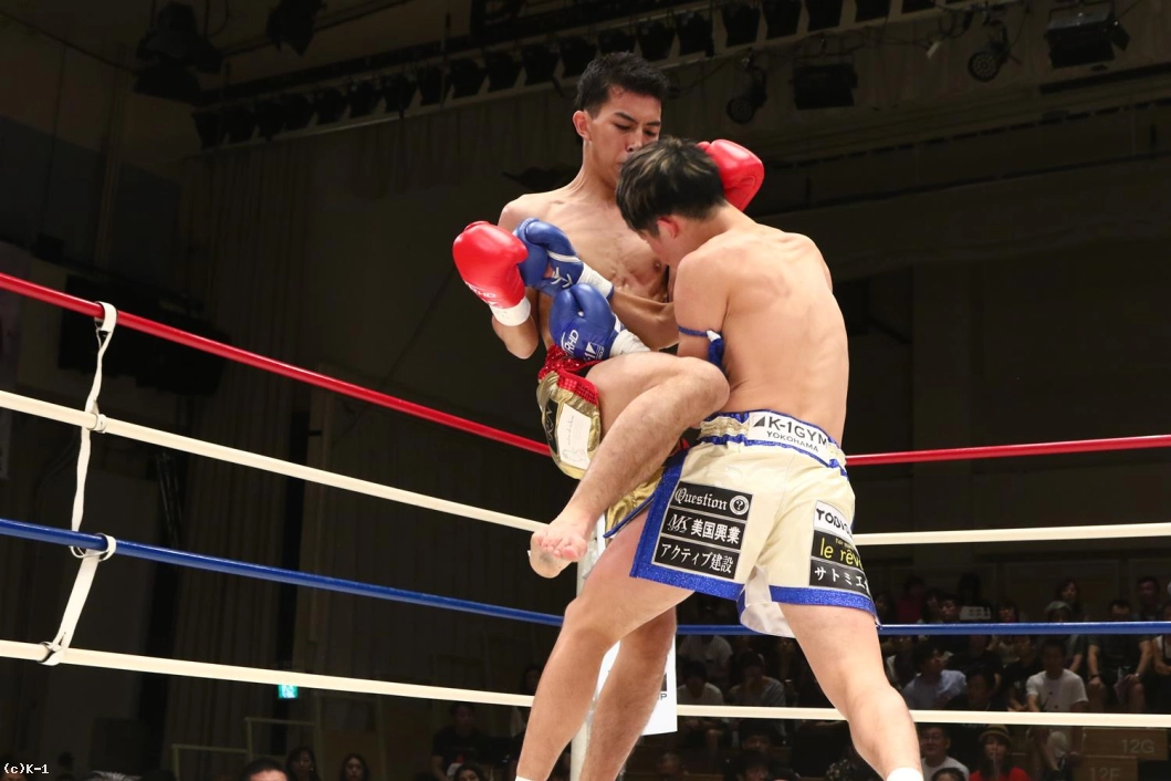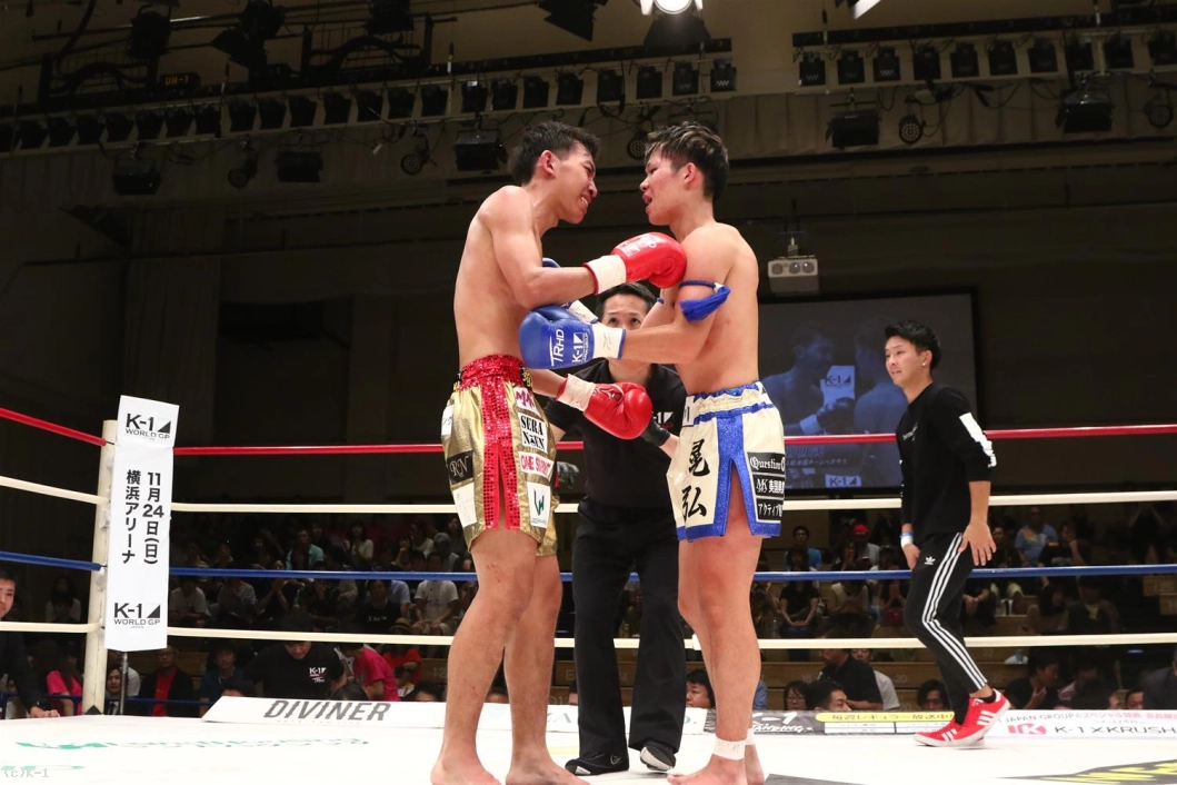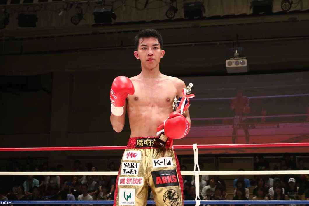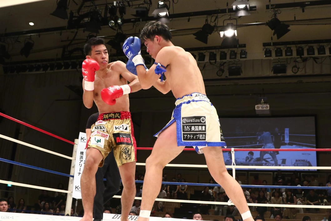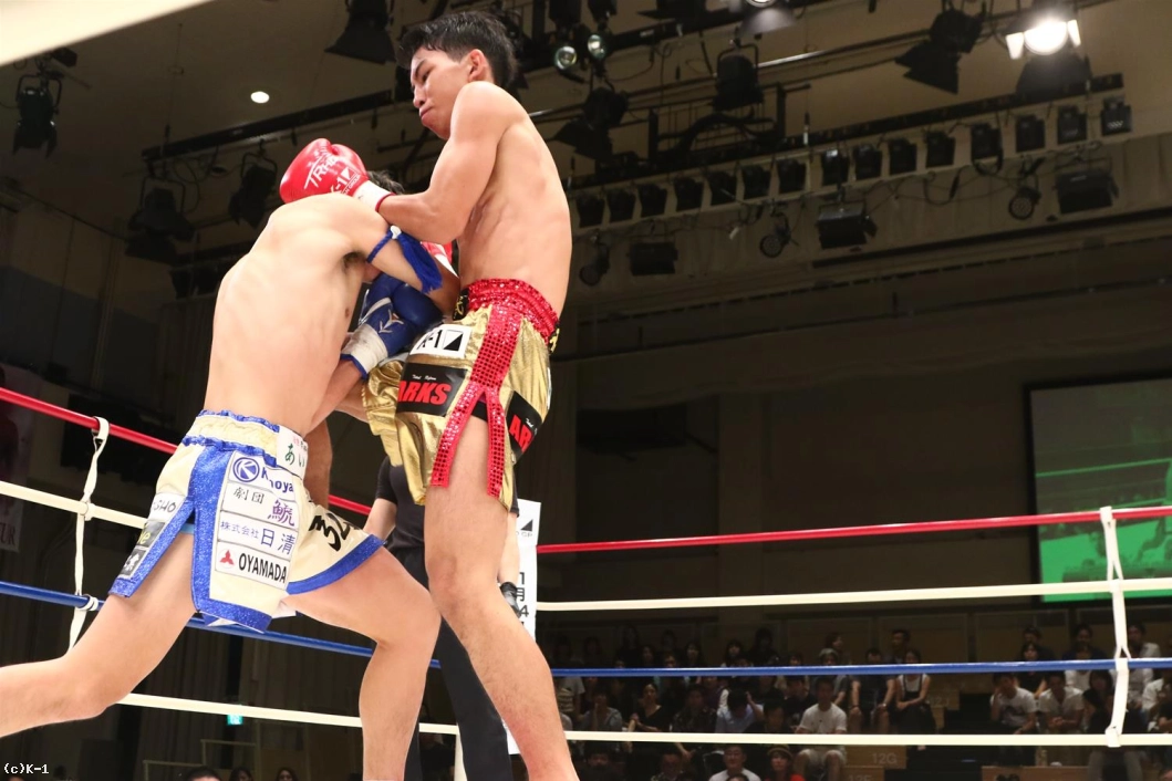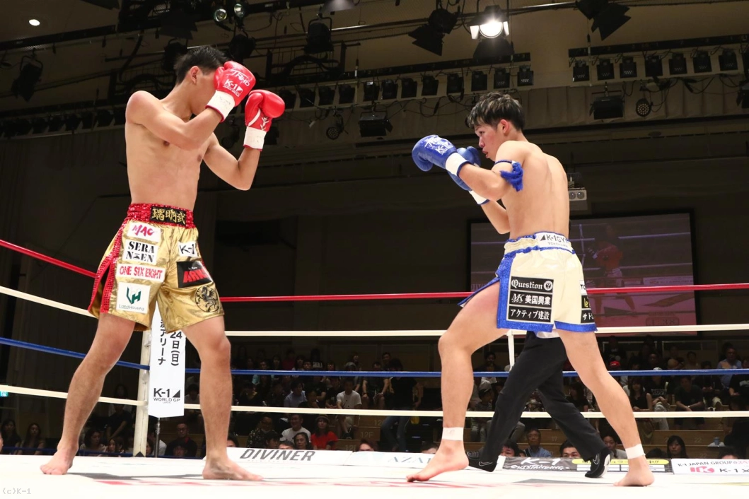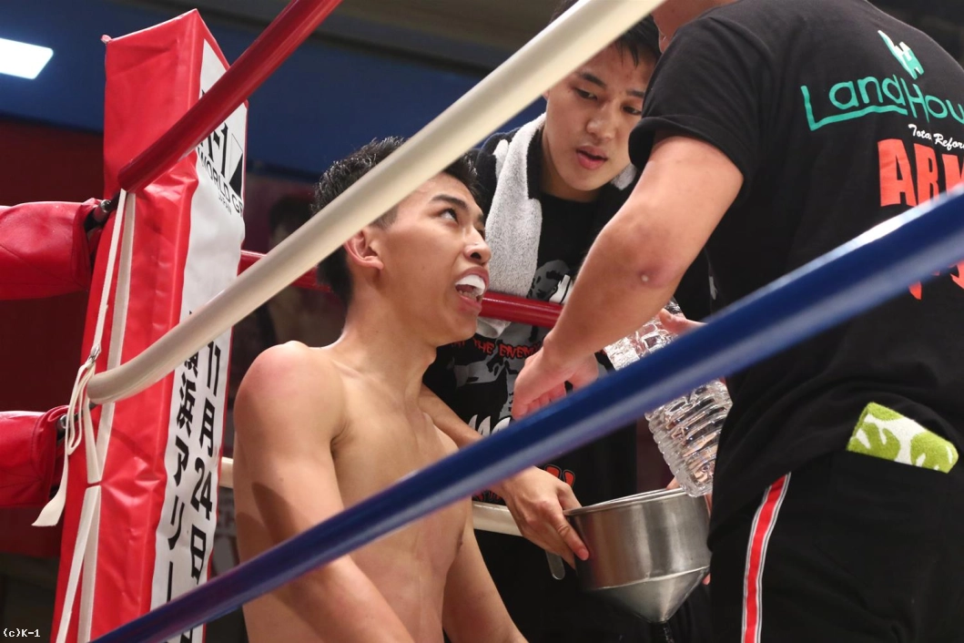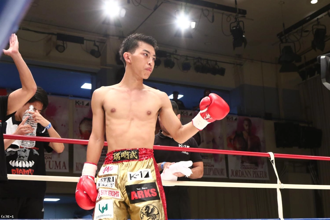 3R、ガードをやはり高くしている璃明武はジャブを突き、ボディと顔へヒザを突き上げる。だが晃弘はひるむことなく左右のパンチを振るっていく。晃弘の左フック・右ストレートに対し、璃明武はガードでクリーンヒットを与えず、ヒザをボディに突き刺していく。晃弘はこれを受けても下がらず、逆転を狙いパンチを振るう。だが璃明武をとらえられない。判定は30-27、30-28、29-28の3-0で璃明武 。無敗対決を制した。