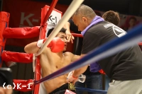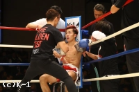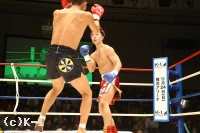 2R、ステップを踏み、踏み込むタイミングをうかがう西元。だが朝久もその西元のタイミングにミドルを合わせる。そこから左顔面前蹴りを朝久は3連続でヒット。さらに足払いで西元を転倒させる。朝久はストレートから再び顔面前蹴りを繋げ、これが西元をとらえる。そして顔に意識を引き上げたところで朝久は左三日月蹴りで西元のわき腹を打ち抜き、ダウンを奪いそのままKO勝利した。