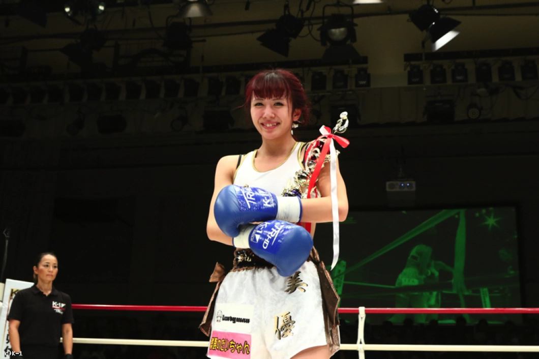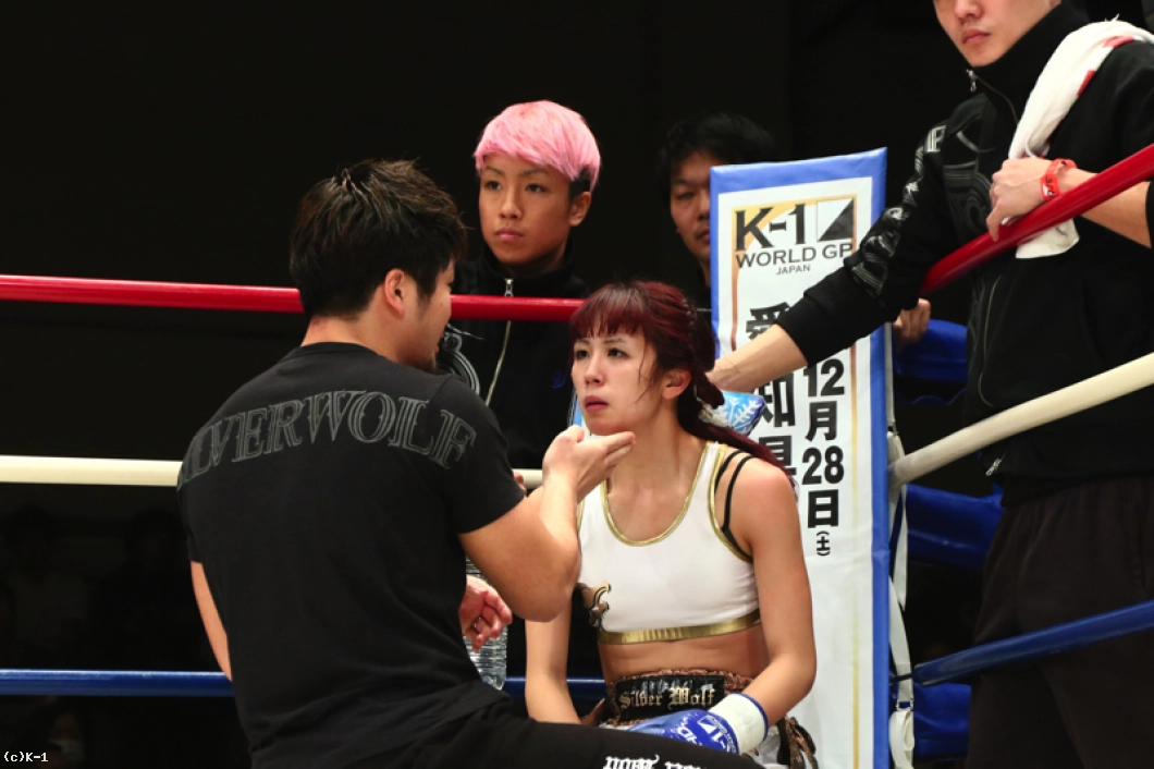 (前の試合に比べてよくなったことは?)ゴチャゴチャしなくなったと思いました、多少は(苦笑)。(今後の目標は?)年が明けて国家試験があるので、ちゃんと合格して。いま、学校とかで練習を全然できてないので。練習をきっちりできる時間を取って、もっともっと自分は強くなれるかなって思います。来年はタイトルマッチとかあせらずに試合をして、経験を積みたいなって思います。(国家試験の種類は?)美容師の資格を取ります。(12月の名古屋のKANA選手につなげられた?)ギリギリセーフでお願いします(笑)、押忍」