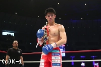 佐野は立ち上がった久保へさらに右ローを加えて2Rを終える。