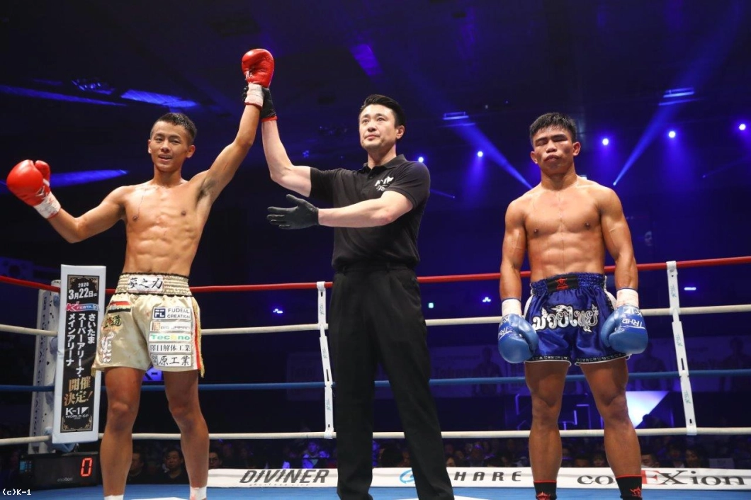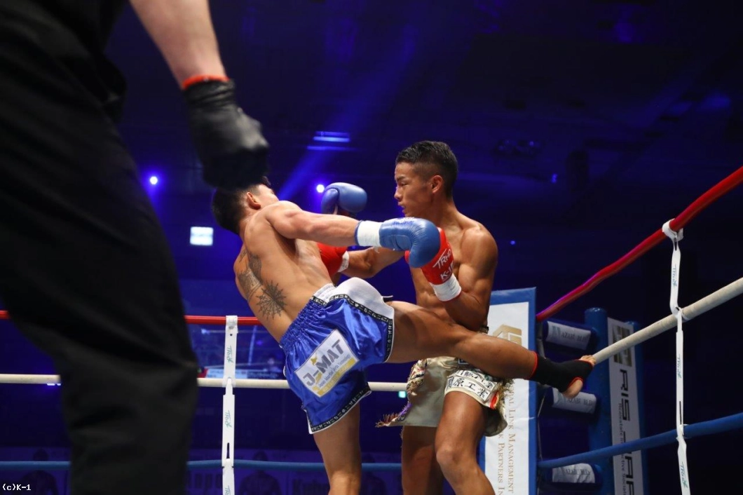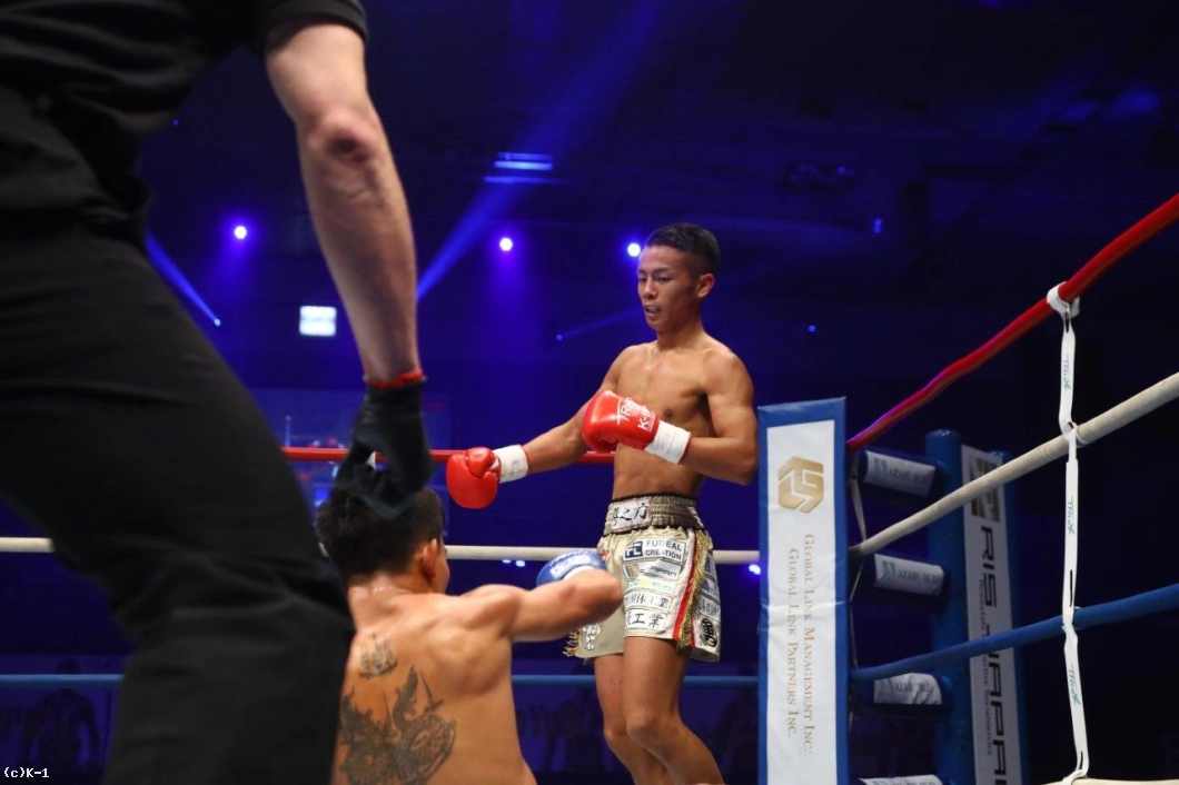 「(試合の感想は?)相手が打たれ強かったです。(相手の印象は?)気持ちがすごく強くて、何で倒れてくれないのかなという感じでした。ヤバかったです。(勝因は?)1Rにダウンを2回取れたことだと思います。こういう強い選手とやってると、久々に楽しいなと思えたので、こういう試合をどんどんやっていきたいと思います。(1年前もタイ人と判定だったが、その時とは違う?)全然違いますね。やっぱりタイプが違うんで。スリヤンレック選手の方がK-1向きですかね。(相手が後半盛り返してきましたが)自分がスタミナ不足で。それが原因で倒しきれなかったというのがあるんですけど、ホントに気持ちが強かったです。(スタミナ不足の原因は?)ちょっといろいろあって……。