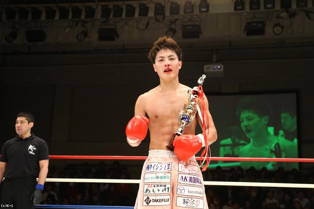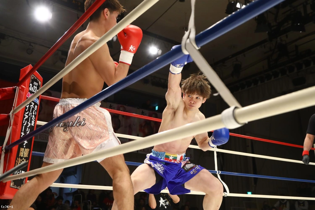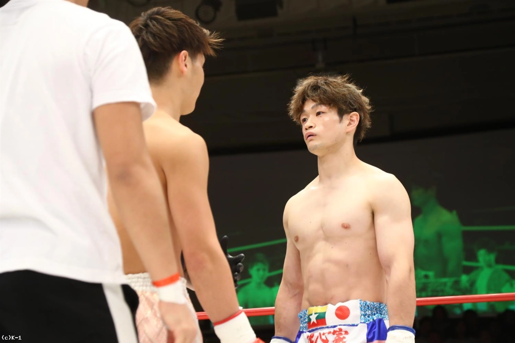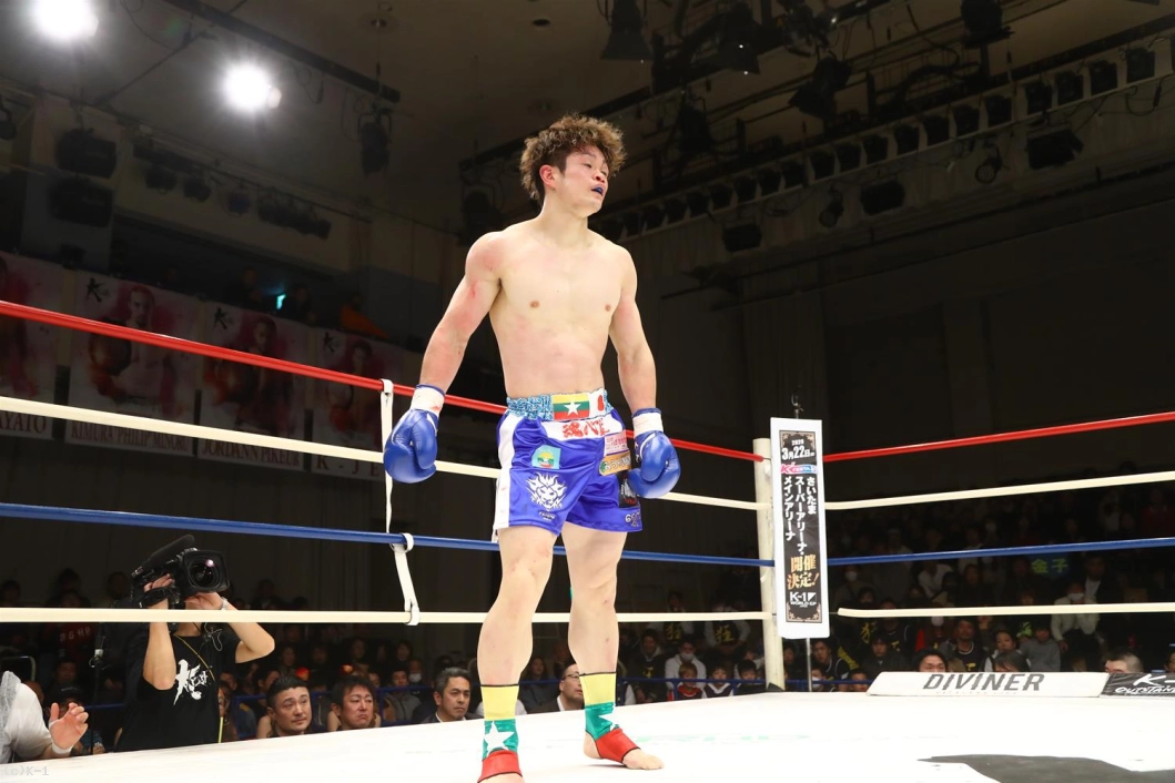 「ラウェイチャンピオンの金子選手、めちゃめちゃ頑丈で本当に強かったです。危ない場面もあってすみません。1年ぶりぐらいの勝利で、すごい練習して、でもまだまだっていうのを実感して、またすぐ練習するんですけど、3月のK-1を狙ってるので、こんなもんじゃないんで、K-1で見せられたらいいなと思います。今日で後輩が違う道を行くんですけど、俺はこの道でトップに行くんで、頑張ろうっていう感じです。今日は納得いく試合じゃなかったですけど、また頑張るんで応援してください」
