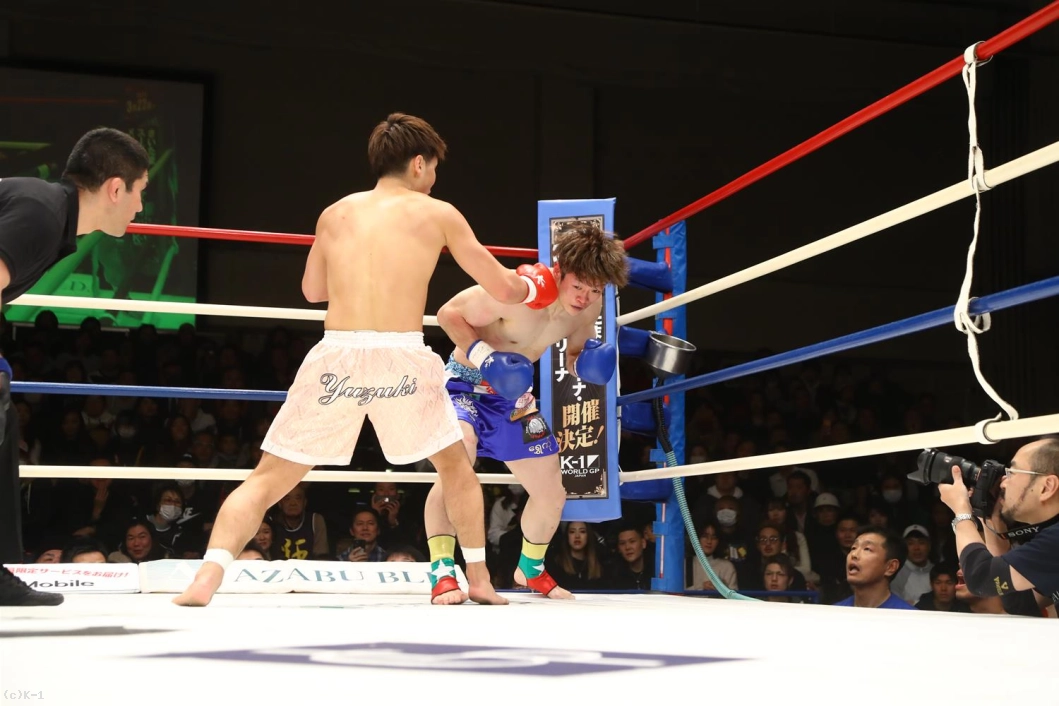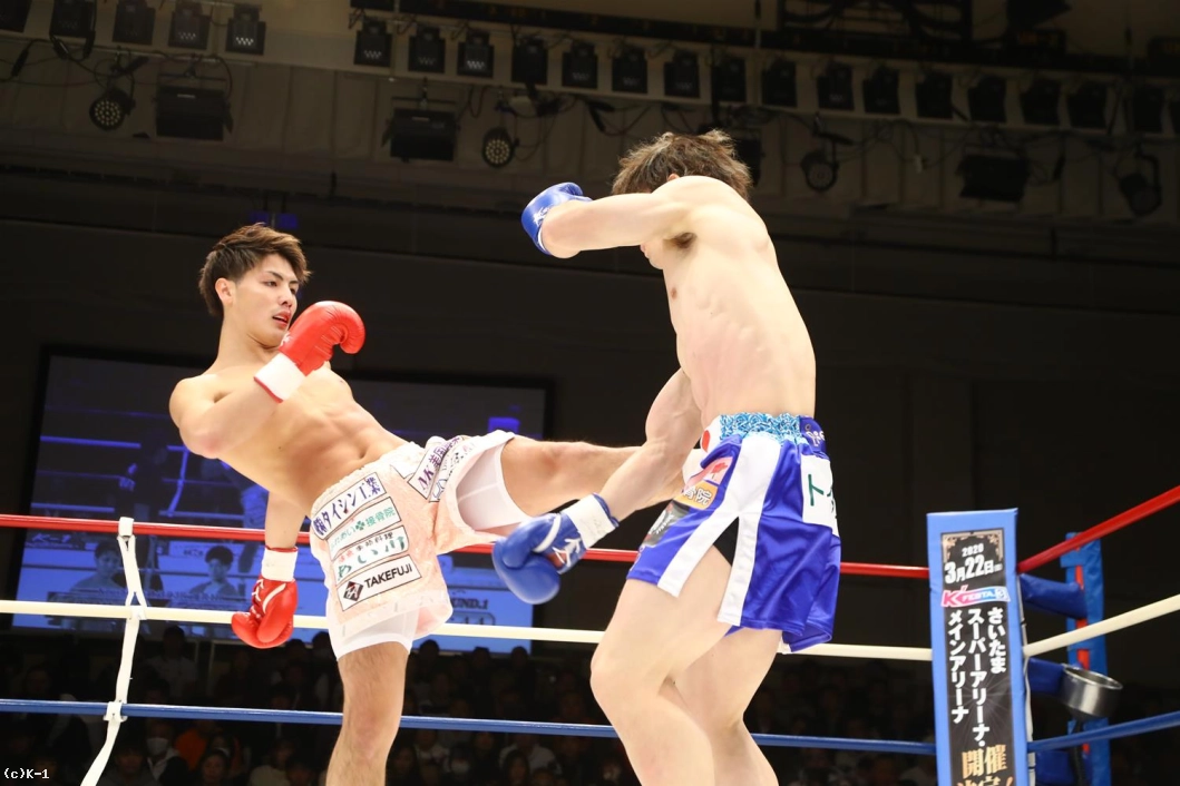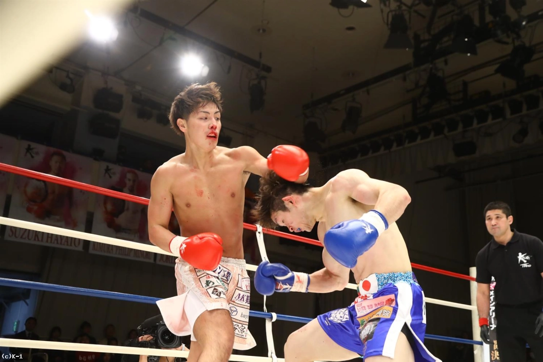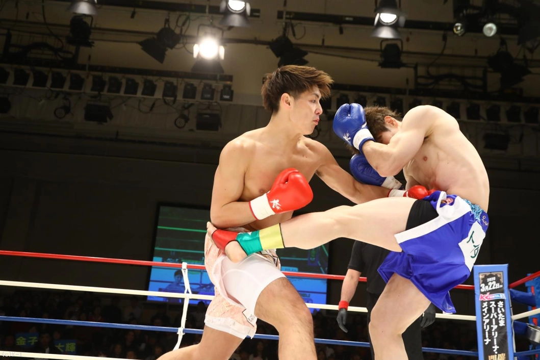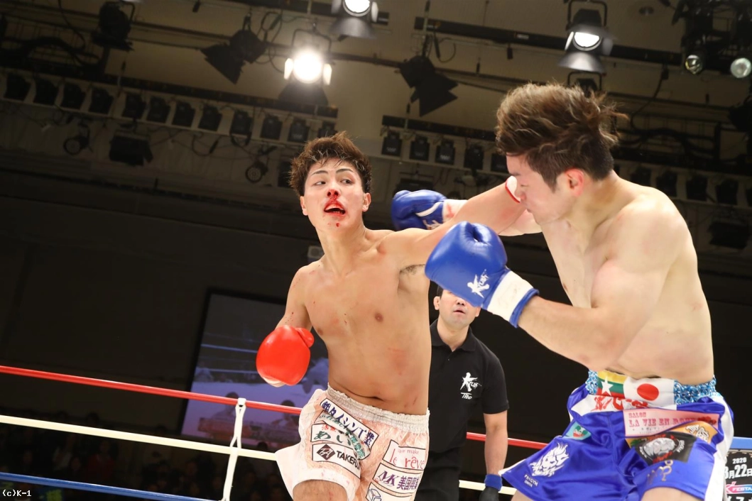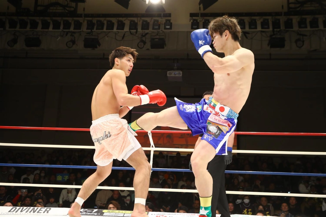 1R、里見は跳び蹴りを見せて奇襲。しかし金子はこれを当てさせず、ミドル・ローを放ち、サウスポーからの右ジャブで里見をヨロめかせる。鼻血の見られる里見だが、左ボディストレートを打ち込み、金子が大きく振るってくるフックもダッキングしてかわす。金子は右ジャブを当てるが、続けての左ストレートは里見が逆にカウンターの左ストレートを当てる。金子はステップインしてのパンチを放っていくが、里見はバックステップで距離をあけて当てさせない。