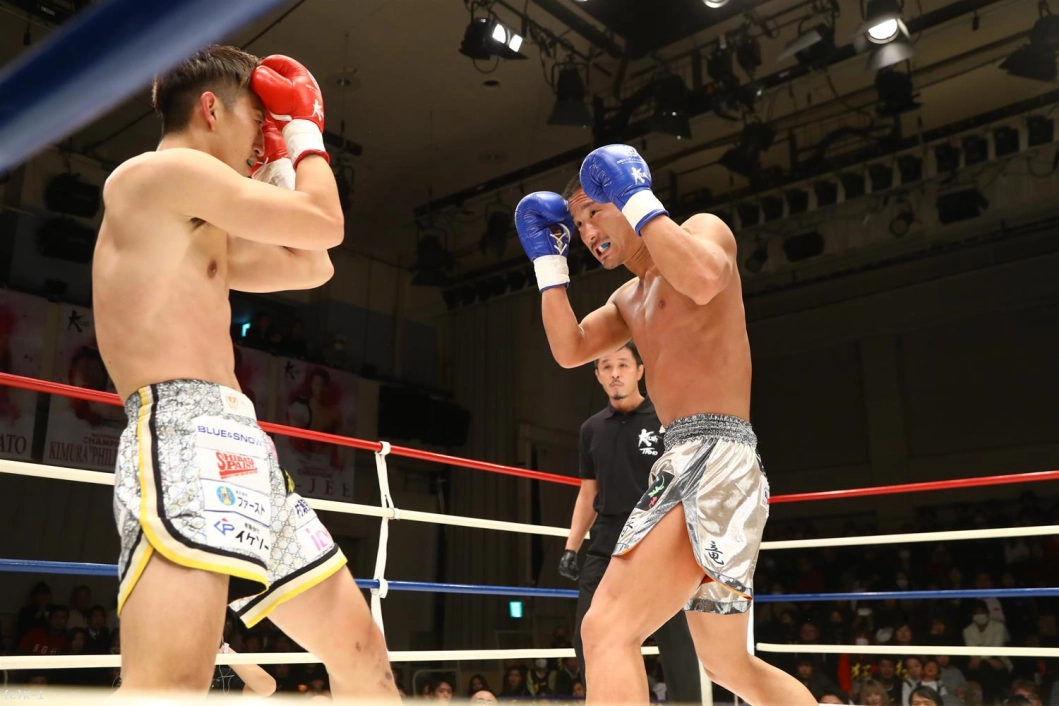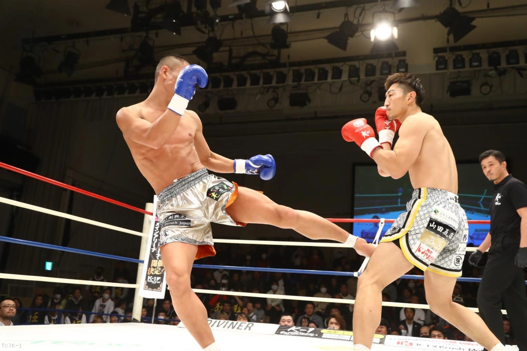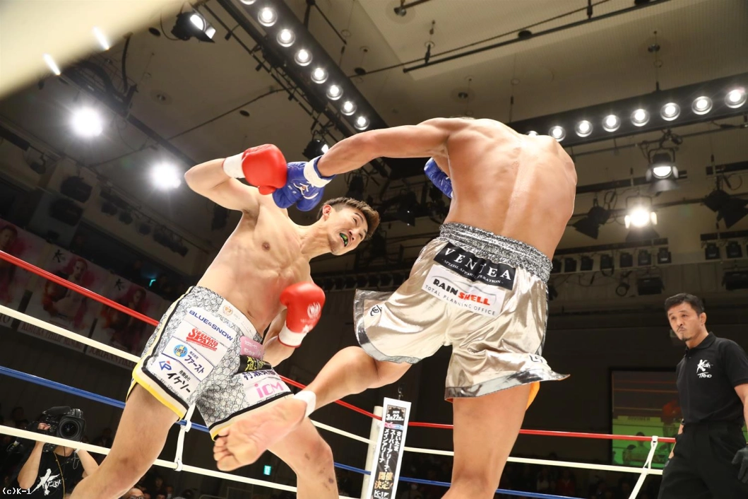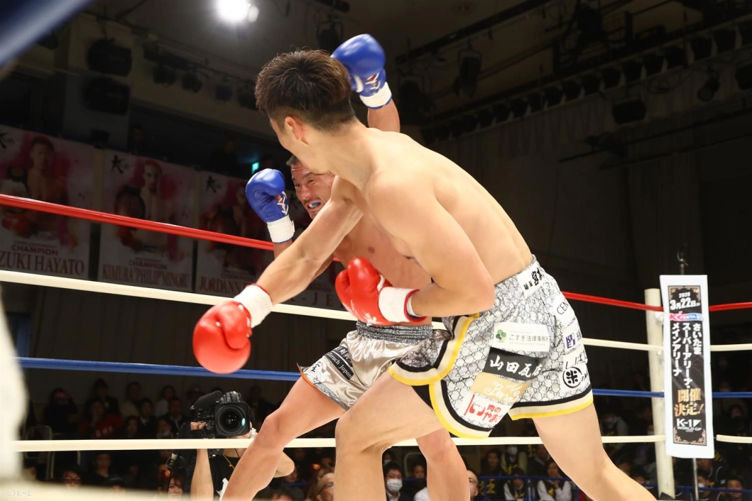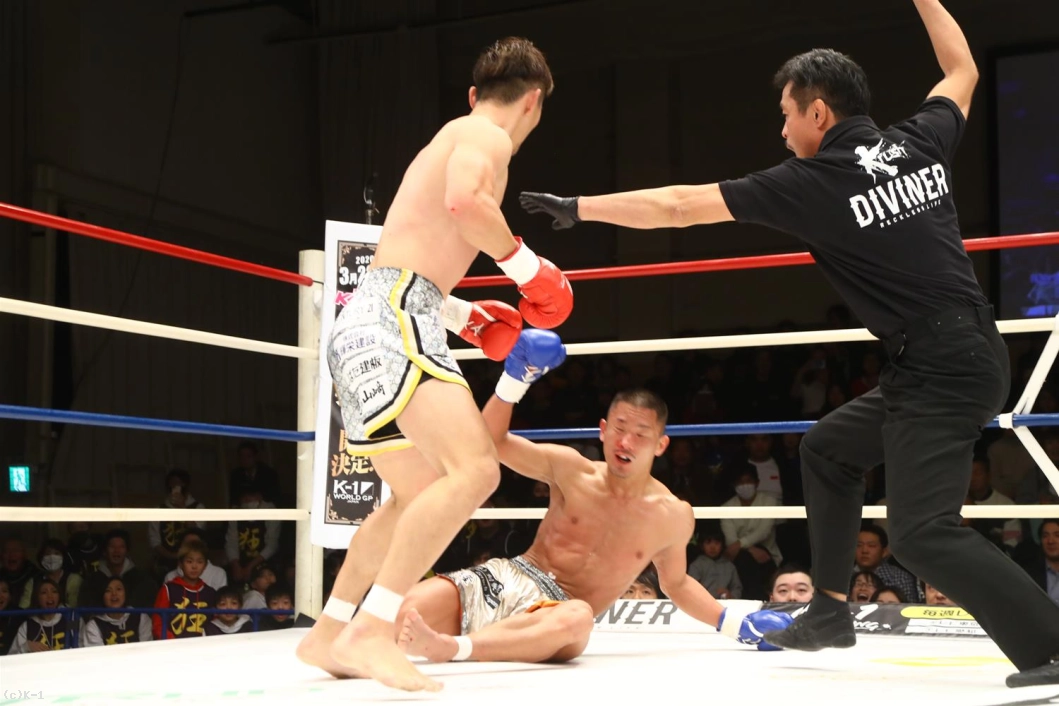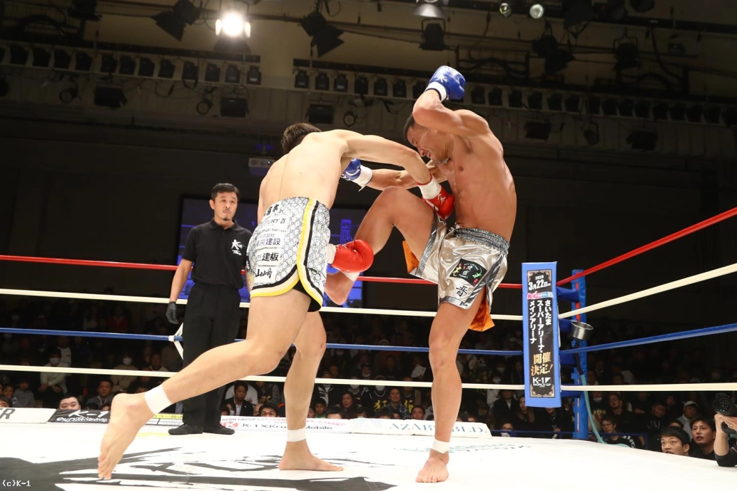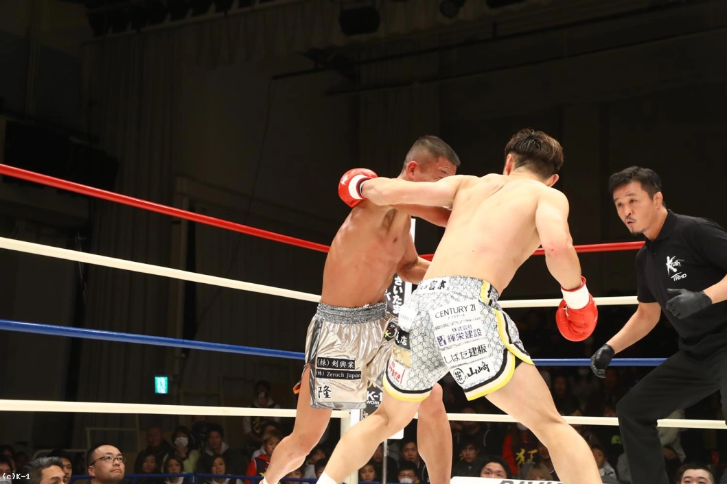 1R、山崎はモーションの少ない左ミドルを連発していく。堀井がロープを背にすると左ボディフックを打ち込む。そこからさらにプレッシャーを掛けて後ろ回し蹴りを打ち込み、ボディフック、顔へのフックと攻める。堀井もカウンターの右ストレートで山崎をグラつかせるが、山崎はステップインしての右ストレートをズバリと決めダウンを奪う。立ち上がった堀井を山崎は打ち合いに誘うと、右ストレートから返しの左フックを決め2度目のダウンを与える。なおも立った堀井だが、山崎が左フックで再びなぎ倒してKO勝利を収めた。